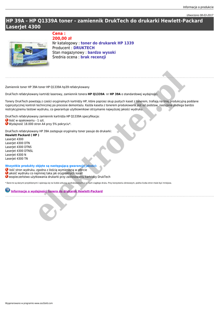 Informacje o produkcie Utworzono 08-03-2017 HP 39A - HP Q1339A toner - zamiennik DrukTech do drukarki Hewlett-Packard LaserJet 4300 Cena : 200,00 zł Zamiennik toner HP 39A toner HP Q1339A hp39 refabrykowany l.p l Nr katalogowy : toner do drukarek HP 1339 Producent : DRUKTECH Stan magazynowy : bardzo wysoki Średnia ocena : brak recenzji DrukTech refabrykowany kartridż laserowy, zamiennik tonera HP Q1339A nr HP 39A o standardowej wydajności. Tonery DrukTech powstają z cześci oryginalnych kartridży HP, które poprzez skup pustych kaset z tonerem, trafiają na linię produkcyjną poddane rygorystycznej kontroli technicznej po procesie demontażu. Każda kaseta z tonerem produkowana jest od podstaw, następnie podlega bardzo restrykcyjnemu testowi wydruku, co gwarantuje użytkownikowi otrzymanie najwyższej jakości wydruku. te DrukTech refabrykowany zamiennik kartridża HP Q1339A specyfikacja: Ilość w opakowaniu - 1 szt. Wydajność 18.000 stron A4 przy 5% pokryciu*. tr o DrukTech refabrykowany HP 39A zastępuje oryginalny toner pasuje do drukarki: Hewlett Packard ( HP ) LaserJet 4300 LaserJet 4300 DTN LaserJet 4300 DTNS LaserJet 4300 DTNSL LaserJet 4300 N LaserJet 4300 TN ek Wszystkie produkty objęte są następującą gwarancją jakości: Ilość stron wydruku, zgodna z ilością wymienioną w ofercie Jakość wydruku co najmniej taka jak oryginalnych kaset Bezpieczeństwo użytkowania drukarki przy zastosowaniu kartridży DrukTech * Dane te są danymi przybliżonymi i opierają się na liczbie arkuszy wydrukowanych w ramach ciągłego druku. Przy korzystaniu okresowym, podna liczba stron może być mniejsza. el Informacje o wydajności tonera do drukarek Hewlett-Packard Wygenerowano w programie www.oscGold.com