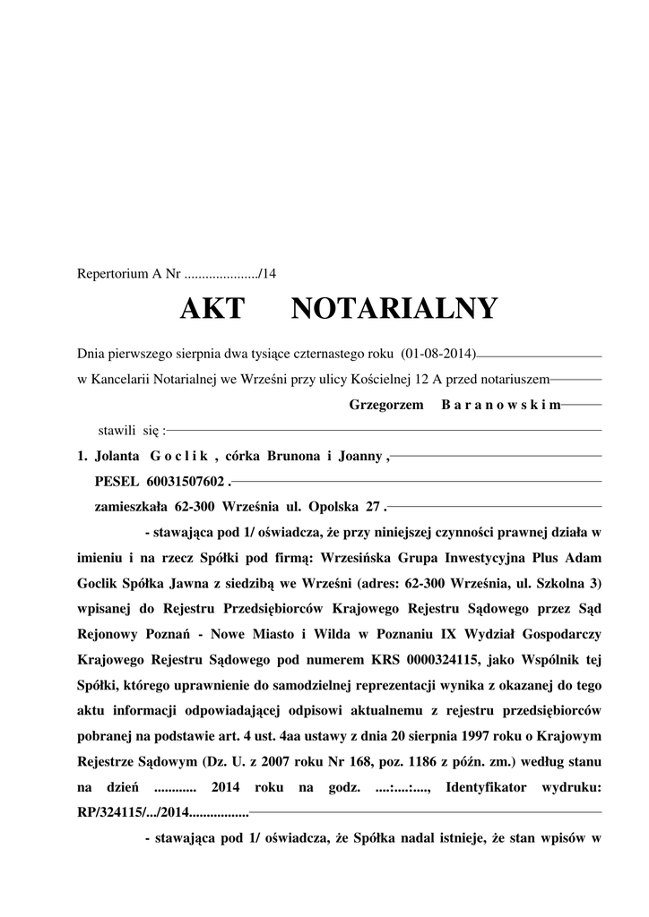 Repertorium A Nr ...................../14 AKT NOTARIALNY Dnia pierwszego sierpnia dwa tysiące czternastego roku (01-08-2014) w Kancelarii Notarialnej we Wrześni przy ulicy Kościelnej 12 A przed notariuszem Grzegorzem Baranowskim stawili się : 1. Jolanta G o c l i k , córka Brunona i Joanny , PESEL 60031507602 . zamieszkała 62-300 Września ul. Opolska 27 . - stawająca pod 1/ oświadcza, że przy niniejszej czynności prawnej działa w imieniu i na rzecz Spółki pod firmą: Wrzesińska Grupa Inwestycyjna Plus Adam Goclik Spółka Jawna z siedzibą we Wrześni (adres: 62-300 Września, ul. Szkolna 3) wpisanej do Rejestru Przedsiębiorców Krajowego Rejestru Sądowego przez Sąd Rejonowy Poznań - Nowe Miasto i Wilda w Poznaniu IX Wydział Gospodarczy Krajowego Rejestru Sądowego pod numerem KRS 0000324115, jako Wspólnik tej Spółki, którego uprawnienie do samodzielnej reprezentacji wynika z okazanej do tego aktu informacji odpowiadającej odpisowi aktualnemu z rejestru przedsiębiorców pobranej na podstawie art. 4 ust. 4aa ustawy z dnia 20 sierpnia 1997 roku o Krajowym Rejestrze Sądowym (Dz. U. z 2007 roku Nr 168, poz. 1186 z późn. zm.) według stanu na dzień ............ 2014 roku na godz. ....:....:...., Identyfikator wydruku: RP/324115/.../2014................. - stawająca pod 1/ oświadcza, że Spółka nadal istnieje, że stan wpisów w str. 2 rejestrze przedsiębiorców do dnia dzisiejszego włącznie nie uległ zmianie, że Spółka nie jest postawiona w stan likwidacji, ani nie zostało wszczęte wobec niej postępowanie objęte przepisami ustawy prawo upadłościowe i naprawcze z dnia 28 lutego 2003 roku (Dz. U. Nr 60, poz. 535), a w szczególności nie ogłoszono wobec Spółki upadłości . NIP 7891658755 , REGON 300263575 - stawający pod 1/ zwany jest dalej Deweloperem 2. .................... , syn ............. i ................, (dowód osobisty .................. ważny do dnia ................. roku) , PESEL ............... . 3. .................... , córka ............. i ................, (dowód osobisty .................. ważny do dnia ................. roku) , PESEL ............... . zamieszkały ....-...... ..................... ul. ..................... - stawający pod 2/ i 3/ zwani są dalej Nabywcą. Stawająca pod 1/ jest notariuszowi osobiście znana, natomiast tożsamość osób stawających pod 2/ i 3/ notariusz ustalił na podstawie okazanych dowodów osobistych, których serie, numery i daty ważności powołano przy nazwiskach. art. 22 ust. 1 pkt 1 Ustawy UMOWA DEWELOPERSKA zawarta w trybie przepisów ustawy z dnia 16 września 2011 roku o ochronie praw nabywcy lokalu mieszkalnego lub domu jednorodzinnego (Dz. U. Nr 232 z 2011 roku poz. 1377), zwanej dalej Ustawą art. 22 ust. 1 pkt 2 Ustawy § 1. 1. Strony zgodnie ustalają cenę nabycia będącego przedmiotem niniejszej umowy prawa własności lokalu mieszkalnego wraz z udziałem w nieruchomości wspólnej - bliżej opisanego w § 4 tego aktu na kwotę brutto wynoszącą ............., w tym podatek od towarów i usług VAT w stawce 8 % (osiem procent), zwanego dalej zamiennie Lokalem Mieszkalnym, str. 3 albo Lokalem. 2. W przypadku, gdy faktyczna powierzchnia Lokalu Mieszkalnego będzie mniejsza niż wskazana w § 4 tego aktu Nabywca może żądać zwrotu nadpłaty ceny sprzedaży pomiędzy powierzchnią użytkową określoną w cytowanym wyżej § 4 tego aktu, a powierzchnią wyliczoną na podstawie obmiaru, przy przyjęciu, że cena 1 m2 (jednego metra kwadratowego) lokalu mieszkalnego wynosi kwotę brutto w wysokości ............ 3. W przypadku gdy odpowiednia powierzchnia Lokalu Mieszkalnego będzie większa niż wskazana w § 4 tego aktu Deweloperowi nie przysługują wobec Kupującego żadne roszczenia. 4. Ostateczna powierzchnia użytkowa Lokalu Mieszkalnego oraz cena sprzedaży zostanie określona w umowie sprzedaży. art. 22 ust. 1 pkt 3 Ustawy § 2. 1. Deweloper oświadcza, że: - jest wpisanym właścicielem nieruchomości położonej w miejscowości Września przy ulicy Antoniego Gendka, gmina Września, powiat wrzesiński, woj. wielkopolskie, stanowiącej działkę numer geodezyjny 4442/56, o obszarze 4100 m2 (cztery tysiące sto metrów kwadratowych), dla której Sąd Rejonowy w Środzie Wlkp. IX Zamiejscowy Wydział Ksiąg Wieczystych z siedzibą we Wrześni prowadzi księgę wieczystą pod oznaczeniem PO1F/00043216/4, zwanej Nieruchomością, - wpis własności Dewelopera w księdze wieczystej nastąpił na podstawie umowy sprzedaży z dnia 12 lipca 2012 roku Repertorium A Nr 5814/12 tej Kancelarii, - w dziale I S-P księgi wieczystej PO1F/00043216/4 wpisane jest uprawnienie wynikające z prawa ujawnionego w dziale III innej księgi wieczystej, a mianowicie księgi wieczystej PO1F/00037792/0 - służebność gruntowa polegająca na prawie przejazdu i przechodu oraz na niegrodzeniu ciągów pieszo - jezdnych w celu zapewnienia swobodnej komunikacji pomiędzy budynkami zlokalizowanymi na nieruchomości władnącej i obciążonej, - w dziale III księgi wieczystej PO1F/00043216/4 wpisane są : a/ ograniczone prawo rzeczowe związane z inną nieruchomością - służebność gruntowa polegająca na prawie przejazdu i przechodu oraz na niegrodzeniu ciągów pieszo - str. 4 jezdnych w celu zapewnienia swobodnej komunikacji pomiędzy budynkami zlokalizowanymi na nieruchomości władnącej i obciążonej - na rzecz każdoczesnego właściciela nieruchomości PO1F/00037792/0, b/ wzmianki o wnioskach i roszczenia - dotyczą wnioskowanych i już wpisanych na podstawie zawartych przez Dewelopera umów deweloperskich roszczeń o wybudowanie budynków, wyodrębnienia w budynkach lokali mieszkalnych oraz przeniesienia prawa własności tych lokali oraz praw niezbędnych do korzystania z lokali na rzecz nabywców tych lokali - nie dotyczą one Lokalu Mieszkalnego będącego przedmiotem niniejszej umowy, - dział III księgi wieczystej PO1F/00043216/4 innych wpisów nie wykazuje, - w