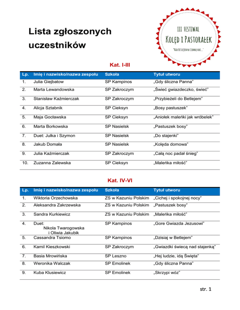 Lista zgłoszonych uczestników Kat. I-III Lp. Imię i nazwisko/nazwa zespołu Szkoła Tytuł utworu 1. Julia Giejbatow SP Kampinos „Gdy śliczna Panna” 2. Marta Lewandowska SP Zakroczym „Świeć gwiazdeczko, świeć” 3. Stanisław Kaźmierczak SP Zakroczym „Przybieżeli do Betlejem” 4. Alicja Sztabnik SP Cieksyn „Bosy pastuszek” 5. Maja Gocławska SP Cieksyn „Aniołek maleńki jak wróbelek” 6. Marta Borkowska SP Nasielsk „Pastuszek bosy” 7. Duet: Julka i Szymon SP Nasielsk „Do stajenki” 8. Jakub Domała SP Nasielsk „Kolęda domowa” 9. Julia Kaźmierczak SP Zakroczym „Całą noc padał śnieg” 10. Zuzanna Zalewska SP Cieksyn „Maleńka miłość” Kat. IV-VI Lp. Imię i nazwisko/nazwa zespołu Szkoła Tytuł utworu 1. Wiktoria Orzechowska ZS w Kazuniu Polskim „Cichej i spokojnej nocy” 2. Aleksandra Zakrzewska ZS w Kazuniu Polskim „Pastuszek bosy” 3. Sandra Kurkiewicz ZS w Kazuniu Polskim „Maleńka miłość” 4. SP Kampinos „Gore Gwiazda Jezusowi” 5. Duet: Nikola Twarogowska i Oliwia Jakubik Cassandra Tsiomo SP Kampinos „Dzisiaj w Betlejem” 6. Kamil Kieszkowski SP Zakroczym „Gwiazdki świecą nad stajenką” 7. Basia Mrowińska SP Leszno „Hej ludzie, idą Święta” 8. Weronika Walczak SP Emolinek „Gdy śliczna Panna” 9. Kuba Klusiewicz SP Emolinek „Skrzypi wóz” str. 1 10. Natalia Kicka SP Nasielsk „Gdy śliczna Panna’ 11. Zespół VIVO 2 SP Nasielsk „Przybieżeli do Betlejem” 12. Zespół VIVO 1 SP Nasielsk „Wigilijna pastorałka” Kat. Gimnazjum Lp. 1. Imię i nazwisko/nazwa zespołu Patrycja Buszta Szkoła ZS w Kazuniu Polskim Tytuł utworu „Już gwiazdeczka się kolebie” 2. Wiktoria Wilczyńska ZS w Kazuniu Polskim „Siadła Maryja” 3. Aleksandra Grzymała ZS w Kazuniu Polskim „Aniołek najładniejszy” 4. Natalia Stankiewicz Gim. Kampinos „Uciekali” 5. Maria Borowa Gim. Kampinos „Dziś nadzieja rodzi się” 6. Daria Wiśniewska Gim. Kampinos „Nie było miejsca dla Ciebie” 7. Agnieszka Bylińska Gim. Zakroczym „W zimną grudniową noc” 8. Stanisław Sotirion ZS Nr 3 NDM „Grecka kolęda” 9. Martyna Konsalik ZS Nr 3 w NDM „Cicha noc” 10. Weronika Kłosowska PG Nr 1 w NDM „Pada śnieg” 11. Maria Piotrowska ZS Nr 2 NDM „Maleńka cicha” str. 2