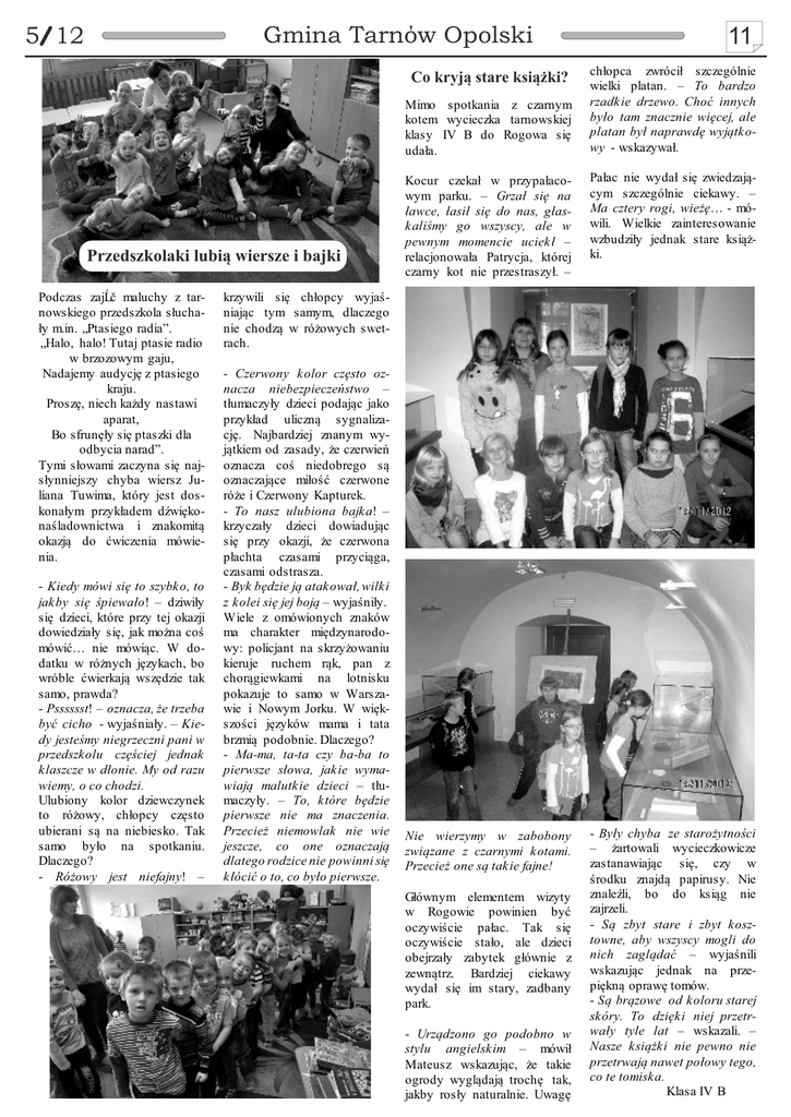 Gmina Tarnow Opolski 5 12 Co εki? Co kryjĐ kryją stare stare ksiĐ książki? Mimo spotkania z czarnym kotem wycieczka tarnowskiej klasy IV B do Rogowa się udała. Przedszkolaki lubią wiersze i bajki Podczas zajĹč maluchy z tarnowskiego przedszkola słuchały m.in. „Ptasiego radia”. „Halo, halo! Tutaj ptasie radio w brzozowym gaju, Nadajemy audycję z ptasiego kraju. Proszę, niech każdy nastawi aparat, Bo sfrunęły się ptaszki dla odbycia narad”. Tymi słowami zaczyna się najsłynniejszy chyba wiersz Juliana Tuwima, który jest doskonałym przykładem dźwiękonaśladownictwa i znakomitą okazją do ćwiczenia mówienia. - Kiedy mówi się to szybko, to jakby się śpiewało! – dziwiły się dzieci, które przy tej okazji dowiedziały się, jak można coś mówić… nie mówiąc. W dodatku w różnych językach, bo wróble ćwierkają wszędzie tak samo, prawda? - Psssssst! – oznacza, że trzeba być cicho - wyjaśniały. – Kiedy jesteśmy niegrzeczni pani w przedszkolu częściej jednak klaszcze w dłonie. My od razu wiemy, o co chodzi. Ulubiony kolor dziewczynek to różowy, chłopcy często ubierani są na niebiesko. Tak samo było na spotkaniu. Dlaczego? - Różowy jest niefajny! – 11 chłopca zwrócił szczególnie wielki platan. – To bardzo rzadkie drzewo. Choć innych było tam znacznie więcej, ale platan był naprawdę wyjątkowy - wskazywał. Kocur czekał w przypałacowym parku. – Grzał się na ławce, łasił się do nas, głaskaliśmy go wszyscy, ale w pewnym momencie uciekł – relacjonowała Patrycja, której czarny kot nie przestraszył. – Pałac nie wydał się zwiedzającym szczególnie ciekawy. – Ma cztery rogi, wieżę… - mówili. Wielkie zainteresowanie wzbudziły jednak stare książki. Nie wierzymy w zabobony związane z czarnymi kotami. Przecież one są takie fajne! - Były chyba ze starożytności – żartowali wycieczkowicze zastanawiając się, czy w środku znajdą papirusy. Nie znaleźli, bo do ksiąg nie zajrzeli. - Są zbyt stare i zbyt kosztowne, aby wszyscy mogli do nich zaglądać – wyjaśnili wskazując jednak na przepiękną oprawę tomów. - Są brązowe od koloru starej skóry. To dzięki niej przetrwały tyle lat – wskazali. – Nasze książki nie pewno nie przetrwają nawet połowy tego, co te tomiska. Klasa IV B krzywili się chłopcy wyjaśniając tym samym, dlaczego nie chodzą w różowych swetrach. - Czerwony kolor często oznacza niebezpieczeństwo – tłumaczyły dzieci podając jako przykład uliczną sygnalizację. Najbardziej znanym wyjątkiem od zasady, że czerwień oznacza coś niedobrego są oznaczające miłość czerwone róże i Czerwony Kapturek. - To nasz ulubiona bajka! – krzyczały dzieci dowiadując się przy okazji, że czerwona płachta czasami przyciąga, czasami odstrasza. - Byk będzie ją atakował, wilki z kolei się jej boją – wyjaśniły. Wiele z omówionych znaków ma charakter międzynarodowy: policjant na skrzyżowaniu kieruje ruchem rąk, pan z chorągiewkami na lotnisku pokazuje to samo w Warszawie i Nowym Jorku. W większości języków mama i tata brzmią podobnie. Dlaczego? - Ma-ma, ta-ta czy ba-ba to pierwsze słowa, jakie wymawiają malutkie dzieci – tłumaczyły. – To, które będzie pierwsze nie ma znaczenia. Przecież niemowlak nie wie jeszcze, co one oznaczają dlatego rodzice nie powinni się kłócić o to, co było pierwsze. Głównym elementem wizyty w Rogowie powinien być oczywiście pałac. Tak się oczywiście stało, ale dzieci obejrzały zabytek głównie z zewnątrz. Bardziej ciekawy wydał się im stary, zadbany park. - Urządzono go podobno w stylu angielskim – mówił Mateusz wskazując, że takie ogrody wyglądają trochę tak, jakby rosły naturalnie. Uwagę