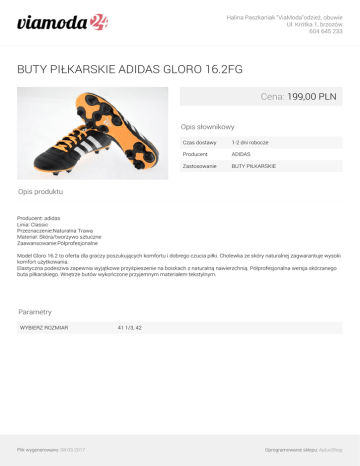 Halina Paszkaniak "ViaModa"odzież, obuwie Ul. Krótka 1, brzozów 604 645 233 BUTY PIŁKARSKIE ADIDAS GLORO 16.2FG Cena: 199,00 PLN Opis słownikowy Czas dostawy 1-2 dni robocze Producent ADIDAS Zastosowanie BUTY PIŁKARSKIE Opis produktu Producent: adidas Linia: Classic Przeznaczenie:Naturalna Trawa Materiał: Skóra/tworzywo sztuczne Zaawansowanie:Półprofesjonalne Model Gloro 16.2 to oferta dla graczy poszukujących komfortu i dobrego czucia piłki. Cholewka ze skóry naturalnej zagwarantuje wysoki komfort użytkowania. Elastyczna podeszwa zapewnia wyjątkowe przyśpieszenie na boiskach z naturalną nawierzchnią. Półprofesjonalna wersja skórzanego buta piłkarskiego. Wnętrze butów wykończone przyjemnym materiałem tekstylnym. Parametry WYBIERZ ROZMIAR Plik wygenerowano: 08-03-2017 41 1/3, 42 Oprogramowanie sklepu: AptusShop Halina Paszkaniak "ViaModa"odzież, obuwie Ul. Krótka 1, brzozów 604 645 233 Galeria Plik wygenerowano: 08-03-2017 Powered by TCPDF (www.tcpdf.org) Oprogramowanie sklepu: AptusShop