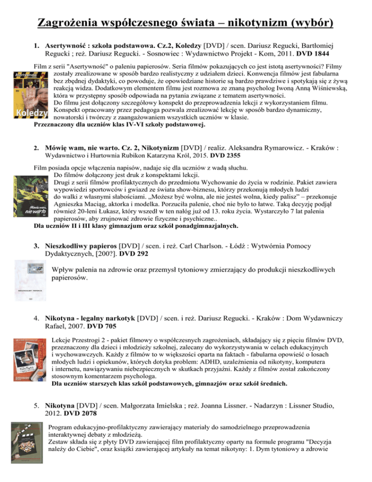 Zagrożenia współczesnego świata – nikotynizm (wybór) 1. Asertywność : szkoła podstawowa. Cz.2, Koledzy [DVD] / scen. Dariusz Regucki, Bartłomiej Regucki ; reż. Dariusz Regucki. - Sosnowiec : Wydawnictwo Projekt - Kom, 2011. DVD 1844 Film z serii "Asertywność" o paleniu papierosów. Seria filmów pokazujących co jest istotą asertywności? Filmy zostały zrealizowane w sposób bardzo realistyczny z udziałem dzieci. Konwencja filmów jest fabularna bez zbędnej dydaktyki, co powoduje, że opowiedziane historie są bardzo prawdziwe i spotykają się z żywą reakcją widza. Dodatkowym elementem filmu jest rozmowa ze znaną psycholog Iwoną Anną Wiśniewską, która w przystępny sposób odpowiada na pytania związane z tematem asertywności. Do filmu jest dołączony szczegółowy konspekt do przeprowadzenia lekcji z wykorzystaniem filmu. Konspekt opracowany przez pedagoga pozwala zrealizować lekcję w sposób bardzo dynamiczny, nowatorski i twórczy z zaangażowaniem wszystkich uczniów w klasie. Przeznaczony dla uczniów klas IV-VI szkoły podstawowej. 2. Mówię wam, nie warto. Cz. 2, Nikotynizm [DVD] / realiz. Aleksandra Rymarowicz. - Kraków : Wydawnictwo i Hurtownia Rubikon Katarzyna Król, 2015. DVD 2355 Film posiada opcje włączenia napisów, nadaje się dla uczniów z wadą słuchu. Do filmów dołączony jest druk z konspektami lekcji. Drugi z serii filmów profilaktycznych do przedmiotu Wychowanie do życia w rodzinie. Pakiet zawiera wypowiedzi sportowców i gwiazd ze świata show-biznesu, którzy przekonują młodych ludzi do walki z własnymi słabościami. „Możesz być wolna, ale nie jesteś wolna, kiedy palisz” – przekonuje Agnieszka Maciąg, aktorka i modelka. Porzuciła palenie, choć nie było to łatwe. Taką decyzję podjął również 20-leni Łukasz, który wszedł w ten nałóg już od 13. roku życia. Wystarczyło 7 lat palenia papierosów, aby zrujnować zdrowie fizyczne i psychiczne.. Dla uczniów II i III klasy gimnazjum oraz szkół ponadgimnazjalnych. 3. Nieszkodliwy papieros [DVD] / scen. i reż. Carl Charlson. - Łódź : Wytwórnia Pomocy Dydaktycznych, [200?]. DVD 292 Wpływ palenia na zdrowie oraz przemysł tytoniowy zmierzający do produkcji nieszkodliwych papierosów. 4. Nikotyna - legalny narkotyk [DVD] / scen. i reż. Dariusz Regucki. - Kraków : Dom Wydawniczy Rafael, 2007. DVD 705 Lekcje Przestrogi 2 - pakiet filmowy o współczesnych zagrożeniach, składający się z pięciu filmów DVD, przeznaczony dla dzieci i młodzieży szkolnej, zalecany do wykorzystywania w celach edukacyjnych i wychowawczych. Każdy z filmów to w większości oparta na faktach - fabularna opowieść o losach młodych ludzi i opiekunów, których dotyka problem: ADHD, uzależnienia od nikotyny, komputera i internetu, nawiązywaniu niebezpiecznych w skutkach przyjaźni. Każdy z filmów został zakończony stosownym komentarzem psychologa. Dla uczniów starszych klas szkół podstawowych, gimnazjów oraz szkół średnich. 5. Nikotyna [DVD] / scen. Małgorzata Imielska ; reż. Joanna Lissner. - Nadarzyn : Lissner Studio, 2012. DVD 2078 Program edukacyjno-profilaktyczny zawierający materiały do samodzielnego przeprowadzenia interaktywnej debaty z młodzieżą. Zestaw składa się z płyty DVD zawierającej film profilaktyczny oparty na formule programu "Decyzja należy do Ciebie", oraz książki zawierającej artykuły na temat nikotyny: 1. Dym tytoniowy a zdrowie 2. Palenie tytoniu a nowotwory 3. Szkodliwość biernego palenia tytoniu 4. Reklama, która zabija 5. Handlarze śmiercią 6. Uzależnienie 7. Jak rzucić palenie? Płyta zawiera: film "Moi najlepsi kumple" (25 min). Program skierowany do uczniów szkół gimnazjalnych i ponadgimnazjalnych. 6. Palenie [DVD]. - Sosnowiec : Wydawnictwo Projekt - Kom, [2009]. DVD 1743 Seria: Nie Zamykaj Oczu Film ukazuje negatywny wpływ papierosów na ludzkie życie. Poznajemy w nim wypowiedzi nie tylko lekarzy specjalistów, ale również pacjentek, u których wieloletnie palenie spowodowało poważne problemy ze zdrowiem. Pozytywnym przykładem jest Rahim - polski artysta i producent hip-hopowy, któremu po 12 latach udało się rzucić palenie. Filmy dla młodzieży w wieku od 12 do 19 lat. 7. Problematyka antynikotynowa [DVD] / scen. Anna Winczakiewicz, Jan Zarzycki ; reż. Anna Winczakiewicz ; real. Jan Zarzycki. - Warszawa : Studio Filmów Edukacyjnych "Nauka", [2008]. DVD 1077 Płyta zawiera filmy: 1.Papieros - kaprys czy... (Film ukazuje szkodliwość palenia tytoniu oraz wskazuje, że palenie nie czyni dorosłym) (15 min) ; 2.Zdecyduj sam (Film ukazuje najczęstsze przyczyny i okoliczności rozpoczynania palenia, proces przeradzania w nałóg i szkodliwość tego nałogu dla organizmu człowieka) (22 min) ; 3.Zdrowie tak - nikotyna nie (Film ukazuje szkodliwość palenia tytoniu oraz zgubny wpływ nałogu na poszczególne funkcje organizmu) (15 min) ; 4.Lekcja (Film ukazuje proces rehabilitacji chorych po operacyjnym zabiegu usunięcia krtani z powodu raka wywołanego nałogowym paleniem tytoniu) (14 min). 8. Zagrożenie zdrowia [DVD] / real. Peter Molloy [et al.]. - Łódź : Wytwórnia Pomocy Dydaktycznych, [200?]. DVD 291 Płyta zawiera: 1. Wojny tytoniowe - Zapalimy? (47 min). 9. Żyjąc higienicznie - żyjesz dłużej [DVD] / real. Ryszard Moch. - Warszawa : Studio Filmów Edukacyjnych "Nauka", [2008]. DVD 1096 10 odcinków po 1,5 - 2 min o tematyce prozdrowotnej (higiena, środowisko, aktywność fizyczna, odżywianie, nikotyna, alkohol, narkotyki, stres, aids). Więcej zbiorów na ten temat można znaleźć w katalogu on-line Biblioteki Pedagogicznej w Ostrołęce. www.bp.ostroleka.pl OPRACOWANIE: Izabela Łada