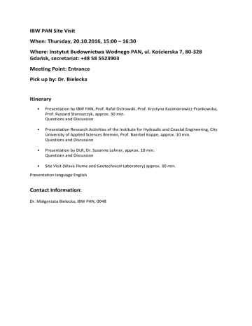 IBW PAN Site Visit When: Thursday, 20.10.2016, 15:00 – 16:30 Where: Instytut Budownictwa Wodnego PAN, ul. Kościerska 7, 80-328 Gdańsk, secretariat: +48 58 5523903 Meeting Point: Entrance Pick up by: Dr. Bielecka Itinerary • Presentation by IBW PAN, Prof. Rafał Ostrowski, Prof. Krystyna Kazimierowicz-Frankowska, Prof. Ryszard Staroszczyk, approx. 30 min. Questions and Discussion • Presentation Research Activities of the Institute for Hydraulic and Coastal Engineering, City University of Applied Sciences Bremen, Prof. Baerbel Koppe, approx. 10 min. Questions and Discussion • Presentation by DLR, Dr. Susanne Lehner, approx. 10 min. Questions and Discussion • Site Visit (Wave Flume and Geotechnical Laboratory) approx. 30 min. Presentation language English Contact Information: Dr. Małgorzata Bielecka, IBW PAN, 0048