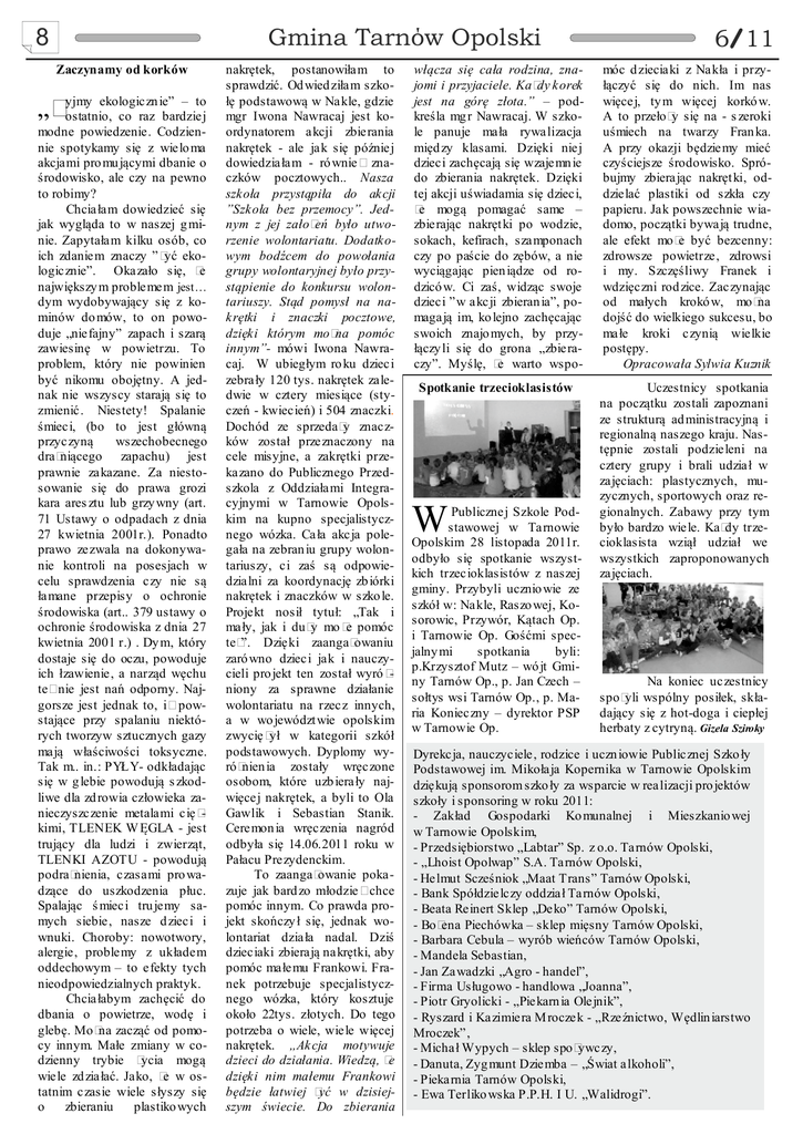 8 Gmina Tarnow Opolski Zaczynamy od korków ekologiczn ie” – to „Żyjmy ostatnio, co raz bardziej modne powiedzenie. Codziennie spotykamy się z wielo ma akcjami pro mu jącymi dbanie o środowisko, ale czy na pewno to robimy? Chciałam dowiedzieć się jak wygląda to w naszej g minie. Zapytałam kilku osób, co ich zdaniem znaczy ”żyć ekologicznie”. Okazało się, że największy m problemem jest… dym wydobywający się z kominów do mów, to on powoduje „niefajny” zapach i szarą zawiesinę w powietrzu. To problem, który nie powinien być nikomu obojętny. A jednak nie wszyscy starają się to zmienić. Niestety! Spalanie śmieci, (bo to jest główną przyczyną wszechobecnego drażniącego zapachu) jest prawnie zakazane. Za niestosowanie się do prawa grozi kara ares ztu lub grzy wny (art. 71 Ustawy o odpadach z dnia 27 kwietnia 2001r.). Ponadto prawo zezwala na dokonywanie kontroli na posesjach w celu sprawdzenia czy nie są łamane przepisy o ochronie środowiska (art.. 379 ustawy o ochronie środowiska z dnia 27 kwietnia 2001 r.) . Dy m, który dostaje się do oczu, powoduje ich łzawienie, a narząd węchu też nie jest nań odporny. Najgorsze jest jednak to, iż powstające przy spalaniu niektórych tworzyw sztucznych gazy mają właściwości toksyczne. Tak m.. in.: PYŁY- odkładając się w g lebie powodują s zkodliwe dla zd rowia człowieka zanieczyszczenie metalami ciężkimi, TLENEK W ĘGLA - jest trujący dla ludzi i zwierząt, TLENKI AZOTU - powodują podrażnienia, czasami pro wadzące do uszkodzenia płuc. Spalając ś mieci tru jemy samych siebie, nasze d zieci i wnuki. Choroby: nowotwory, alergie, problemy z układem oddechowym – to efekty tych nieodpowiedzialnych praktyk. Chciałabym zachęcić do dbania o powietrze, wodę i glebę. Można zacząć od pomocy innym. Małe zmiany w codzienny trybie życia mogą wiele zd ziałać. Jako, że w ostatnim czasie wiele słyszy się o zbieraniu plastiko wych nakrętek, postanowiłam to sprawdzić. Od wied ziłam szkołę podstawową w Nakle, gdzie mgr Iwona Nawracaj jest koordynatorem akcji zbierania nakrętek - ale jak się później dowiedziałam - ró wnież znaczków pocztowych.. Nasza szkoła przystąpiła do akcji ”Szkoła bez przemocy”. Jednym z jej założeń było utworzenie wolontariatu. Dodatkowym bodźcem do powołania grupy wolontaryjnej było przystąpienie do konkursu wolontariuszy. Stąd pomysł na nakrętki i znaczki pocztowe, dzięki którym można pomóc innym”- mówi Iwona Nawracaj. W ubiegłym ro ku dzieci zebrały 120 tys. nakrętek zaledwie w cztery miesiące (styczeń - kwiecień) i 504 znaczki. Dochód ze sprzedaży znaczków został przeznaczony na cele misyjne, a zakrętki przekazano do Publicznego Przedszkola z Oddziałami Integracyjnymi w Tarnowie Opolskim na kupno specjalistycznego wózka. Cała akcja polegała na zebran iu grupy wolontariuszy, ci zaś są odpowiedzialni za koordynację zb iórki nakrętek i znaczków w szko le. Projekt nosił tytuł: „Tak i mały, jak i duży mo że pomóc też”. Dzięki zaangażowaniu zaró wno dzieci jak i nauczycieli pro jekt ten został wyró żniony za sprawne działanie wolontariatu na rzecz innych, a w wo jewództ wie opolskim zwyciężył w kategorii szkół podstawowych. Dyplomy wyróżnien ia zostały wręczone osobom, które uzb ierały najwięcej nakrętek, a byli to Ola Gawlik i Sebastian Stanik. Ceremon ia wręczenia nagród odbyła się 14.06.2011 roku w Pałacu Prezydenckim. To zaangażowanie pokazuje jak bard zo młodzież chce pomóc innym. Co prawda projekt skończy ł się, jednak wolontariat działa nadal. Dziś dzieciaki zbierają nakrętki, aby pomóc małemu Frankowi. Franek potrzebuje specjalistycznego wózka, który kosztuje około 22tys. złotych. Do tego potrzeba o wiele, wiele więcej nakrętek. „Akcja motywuje dzieci do działania. Wiedzą, że dzięki nim małemu Frankowi będzie łatwiej żyć w dzisiejszym świecie. Do zbierania 6 11 włącza się cała rodzina, znajomi i przyjaciele. Każdy korek jest na górę złota.” – podkreśla mg r Nawracaj. W szkole panuje mała rywalizacja międ zy klasami. Dzięki niej dzieci zachęcają się wzajemn ie do zbierania nakrętek. Dzięki tej akcji uświadamia się dzieci, że mogą pomagać same – zbierając nakręt ki po wodzie, sokach, kefirach, szamponach czy po paście do zębów, a nie wyciągając pien iądze od rodzicó w. Ci zaś, widząc swoje dzieci ”w akcji zbieran ia”, pomagają im, ko lejno zachęcając swoich znajo mych, by przyłączy li się do grona „zbieraczy”. Myślę, że warto wspo- móc d zieciaki z Nakła i przyłączyć się do nich. Im nas więcej, ty m więcej korkó w. A to przełoży się na - s zeroki uśmiech na twarzy Fran ka. A przy okazji będziemy mieć czyściejsze środowisko. Spróbujmy zbierając nakręt ki, oddzielać plastiki od szkła czy papieru. Jak powszechnie wiadomo, początki bywają trudne, ale efekt może być bezcenny: zdrowsze powietrze, zdrowsi i my. Szczęśliwy Franek i wdzięczni rod zice. Zaczynając od małych krokó w, można dojść do wielkiego sukcesu, bo małe kroki czynią wielkie postępy. Opracowała Sylwia Kuznik Spotkanie trzecioklasistów Uczestnicy spotkania na początku zostali zapoznani ze strukturą ad ministracyjną i regionalną naszego kraju. Następnie zostali podzieleni na cztery grupy i brali udział w zajęciach: plastycznych, muzycznych, sportowych oraz regionalnych. Zabawy przy tym było bardzo wiele. Każdy trzecioklasista wziął udział we wszystkich zaproponowanych zajęciach. W Publicznej Szkole Podstawowej w Tarnowie Opolskim 28 listopada 2011r. odbyło się spotkanie wszystkich trzecioklasistów z naszej gminy. Przybyli ucznio wie ze szkół w: Nakle, Raszo wej, Kosorowic, Przywór, Kątach Op. i Tarnowie Op. Gośćmi specjalny mi spotkania byli: p.Krzysztof Mutz – wó jt Gminy Tarnów Op., p. Jan Czech – sołtys wsi Tarnów Op., p. Maria Konieczny 