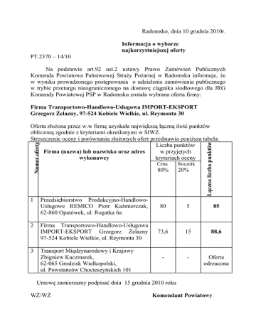 Radomsko, dnia 10 grudnia 2010r. Informacja o wyborze najkorzystniejszej oferty PT.2370 – 14/10 Na podstawie art.92 ust.2 ustawy Prawo Zamówień Publicznych Komenda Powiatowa Państwowej Straży Pożarnej w Radomsku informuje, że w wyniku prowadzonego postępowania o udzielenie zamówienia publicznego w trybie przetargu nieograniczonego na dostawę ciągnika siodłowego dla JRG Komendy Powiatowej PSP w Radomsku została wybrana oferta firmy: Firma Transportowo-Handlowo-Usługowa IMPORT-EKSPORT Grzegorz Żelazny, 97-524 Kobiele Wielkie, ul. Reymonta 30 1 2 3 Cena Rocznik 80% 20% Łączna liczba punktów Numer oferty Oferta złożona przez w.w firmę uzyskała największą łączną ilość punktów obliczoną zgodnie z kryteriami określonymi w SIWZ. Streszczenie oceny i porównania złożonych ofert przedstawia poniższa tabela: Liczba punktów Firma (nazwa) lub nazwisko oraz adres w przyjętych wykonawcy kryteriach oceny Przedsiębiorstwo Produkcyjno-HandlowoUsługowe REMICO Piotr Kaźmierczak, 62-860 Opatówek, ul. Rogatka 6a 80 5 85 Firma Transportowo-Handlowo-Usługowa IMPORT-EKSPORT Grzegorz Żelazny 97-524 Kobiele Wielkie, ul. Reymonta 30 73,6 15 88,6 - - Oferta odrzucona Transport Międzynarodowy i Krajowy Zbigniew Kaczmarek, 62-065 Grodzisk Wielkopolski, ul. Powstańców Chocieszyńskich 101 Umowę zamierzamy podpisać dnia 15 grudnia 2010 roku WŻ/WŻ Komendant Powiatowy Państwowej Straży Pożarnej w Radomsku bryg. mgr inż. Marek Jankowski