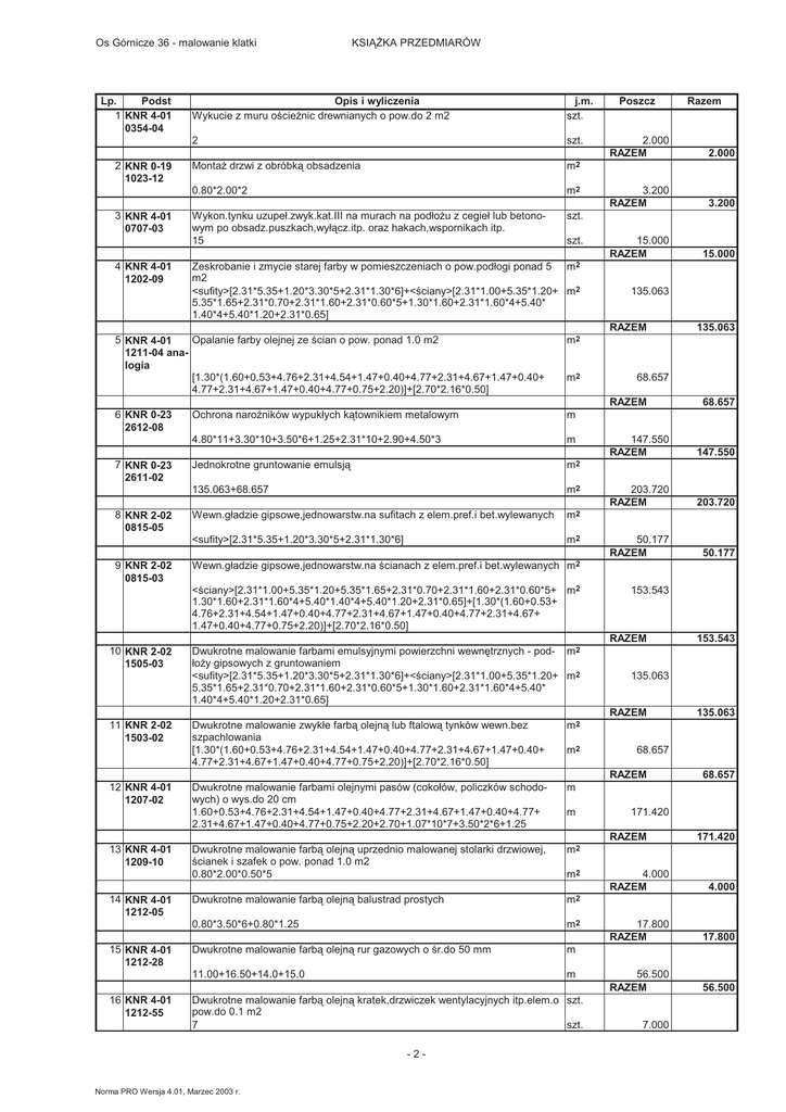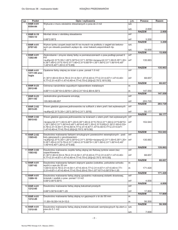Os Górnicze 36 - malowanie klatki Lp. Podst 1 KNR 4-01 0354-04 2 KNR 0-19 1023-12 3 KNR 4-01 0707-03 4 KNR 4-01 1202-09 KSIĄĩKA PRZEDMIARÓW Opis i wyliczenia Wykucie z muru oĞcieĪnic drewnianych o pow.do 2 m2 j.m. szt. 2 szt. MontaĪ drzwi z obróbką obsadzenia m2 0.80*2.00*2 m2 Wykon.tynku uzupeł.zwyk.kat.III na murach na podłoĪu z cegieł lub betonowym po obsadz.puszkach,wyłącz.itp. oraz hakach,wspornikach itp. 15 szt. szt. Zeskrobanie i zmycie starej farby w pomieszczeniach o pow.podłogi ponad 5 m2 m2 <sufity>[2.31*5.35+1.20*3.30*5+2.31*1.30*6]+<Ğciany>[2.31*1.00+5.35*1.20+ m2 5.35*1.65+2.31*0.70+2.31*1.60+2.31*0.60*5+1.30*1.60+2.31*1.60*4+5.40* 1.40*4+5.40*1.20+2.31*0.65] Poszcz 2.000 RAZEM 2.000 3.200 RAZEM 3.200 15.000 RAZEM 15.000 135.063 RAZEM 5 KNR 4-01 Opalanie farby olejnej ze Ğcian o pow. ponad 1.0 m2 1211-04 analogia [1.30*(1.60+0.53+4.76+2.31+4.54+1.47+0.40+4.77+2.31+4.67+1.47+0.40+ 4.77+2.31+4.67+1.47+0.40+4.77+0.75+2.20)]+[2.70*2.16*0.50] m2 6 KNR 0-23 2612-08 Ochrona naroĪników wypukłych kątownikiem metalowym m 4.80*11+3.30*10+3.50*6+1.25+2.31*10+2.90+4.50*3 m Jednokrotne gruntowanie emulsją m2 135.063+68.657 m2 Wewn.gładzie gipsowe,jednowarstw.na sufitach z elem.pref.i bet.wylewanych m2 <sufity>[2.31*5.35+1.20*3.30*5+2.31*1.30*6] m2 m2 8 KNR 2-02 0815-05 9 KNR 2-02 0815-03 147.550 RAZEM 147.550 203.720 RAZEM 203.720 50.177 RAZEM 50.177 153.543 RAZEM Dwukrotne malowanie farbami emulsyjnymi powierzchni wewnĊtrznych - pod- m2 łoĪy gipsowych z gruntowaniem <sufity>[2.31*5.35+1.20*3.30*5+2.31*1.30*6]+<Ğciany>[2.31*1.00+5.35*1.20+ m2 5.35*1.65+2.31*0.70+2.31*1.60+2.31*0.60*5+1.30*1.60+2.31*1.60*4+5.40* 1.40*4+5.40*1.20+2.31*0.65] Dwukrotne malowanie zwykłe farbą olejną lub ftalową tynków wewn.bez szpachlowania [1.30*(1.60+0.53+4.76+2.31+4.54+1.47+0.40+4.77+2.31+4.67+1.47+0.40+ 4.77+2.31+4.67+1.47+0.40+4.77+0.75+2.20)]+[2.70*2.16*0.50] m2 Dwukrotne malowanie farbami olejnymi pasów (cokołów, policzków schodowych) o wys.do 20 cm 1.60+0.53+4.76+2.31+4.54+1.47+0.40+4.77+2.31+4.67+1.47+0.40+4.77+ 2.31+4.67+1.47+0.40+4.77+0.75+2.20+2.70+1.07*10*7+3.50*2*6+1.25 m Dwukrotne malowanie farbą olejną uprzednio malowanej stolarki drzwiowej, Ğcianek i szafek o pow. ponad 1.0 m2 0.80*2.00*0.50*5 m2 Dwukrotne malowanie farbą olejną balustrad prostych m2 0.80*3.50*6+0.80*1.25 m2 Dwukrotne malowanie farbą olejną rur gazowych o Ğr.do 50 mm m 11.00+16.50+14.0+15.0 m m2 m 14 KNR 4-01 1212-05 15 KNR 4-01 1212-28 16 KNR 4-01 1212-55 m2 Dwukrotne malowanie farbą olejną kratek,drzwiczek wentylacyjnych itp.elem.o szt. pow.do 0.1 m2 7 szt. -2- Norma PRO Wersja 4.01, Marzec 2003 r. 68.657 171.420 RAZEM 13 KNR 4-01 1209-10 135.063 68.657 RAZEM 12 KNR 4-01 1207-02 153.543 135.063 RAZEM 11 KNR 2-02 1503-02 68.657 Wewn.gładzie gipsowe,jednowarstw.na Ğcianach z elem.pref.i bet.wylewanych m2 <Ğciany>[2.31*1.00+5.35*1.20+5.35*1.65+2.31*0.70+2.31*1.60+2.31*0.60*5+ m2 1.30*1.60+2.31*1.60*4+5.40*1.40*4+5.40*1.20+2.31*0.65]+[1.30*(1.60+0.53+ 4.76+2.31+4.54+1.47+0.40+4.77+2.31+4.67+1.47+0.40+4.77+2.31+4.67+ 1.47+0.40+4.77+0.75+2.20)]+[2.70*2.16*0.50] 10 KNR 2-02 1505-03 135.063 68.657 RAZEM 7 KNR 0-23 2611-02 Razem 171.420 4.000 RAZEM 4.000 17.800 RAZEM 17.800 56.500 RAZEM 56.500 7.000 Os Górnicze 36 - malowanie klatki Lp. Podst KSIĄĩKA PRZEDMIARÓW Opis i wyliczenia 17 KNR-W 4-01 Zabezpieczenie podłóg folią 1216-01 [2.31*5.35+1.20*3.30*5+2.31*1.30*6] Poszcz RAZEM Razem 7.000 m2 m2 -3- Norma PRO Wersja 4.01, Marzec 2003 r. j.m. 50.177 RAZEM 50.177