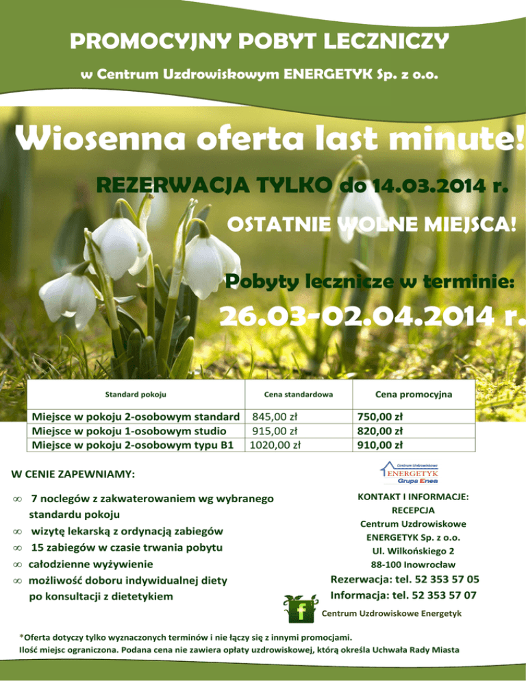 PROMOCYJNY POBYT LECZNICZY w Centrum Uzdrowiskowym ENERGETYK Sp. z o.o. Wiosenna oferta last minute! REZERWACJA TYLKO do 14.03.2014 r. OSTATNIE WOLNE MIEJSCA! Pobyty lecznicze w terminie: 26.03-02.04.2014 r. Standard pokoju Cena standardowa Miejsce w pokoju 2-osobowym standard 845,00 zł Miejsce w pokoju 1-osobowym studio 915,00 zł Miejsce w pokoju 2-osobowym typu B1 1020,00 zł Cena promocyjna 750,00 zł 820,00 zł 910,00 zł W CENIE ZAPEWNIAMY: • • • • • • 7 noclegów z zakwaterowaniem wg wybranego standardu pokoju wizytę lekarską z ordynacją zabiegów 15 zabiegów w czasie trwania pobytu całodzienne wyżywienie możliwość doboru indywidualnej diety po konsultacji z dietetykiem dostęp do Internetu - Wi-Fi KONTAKT I INFORMACJE: RECEPCJA Centrum Uzdrowiskowe ENERGETYK Sp. z o.o. Ul. Wilkońskiego 2 88-100 Inowrocław Rezerwacja: tel. 52 353 57 05 Informacja: tel. 52 353 57 07 [email protected] Centrum Uzdrowiskowe Energetyk *Oferta dotyczy tylko wyznaczonych terminów i nie łączy się z innymi promocjami. Ilość miejsc ograniczona. Podana cena nie zawiera opłaty uzdrowiskowej, którą określa Uchwała Rady Miasta Inowrocławia.