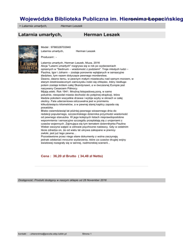 Utworzono : 08Łopacińskieg March 2017 Wojewódzka Biblioteka Publiczna im. Hieronima > Latarnia umarłych, Herman Leszek Latarnia umarłych, Herman Leszek Model : 9788328703940 Latarnia umarłych, Herman Leszek Producent : Latarnia umarłych, Herman Leszek, Muza, 2016 Akcja "Latarni umarłych" rozgrywa się w rok po wydarzeniach opisanych w "Sedinum – wiadomość z podziemi". Troje młodych ludzi – Paulina, Igor i Johann – zostaje ponownie wplątanych w sensacyjne śledztwo, tym razem dotyczące pewnego morderstwa. Dawno, dawno temu, w pewnym małym miasteczku nad samym morzem, w starym średniowiecznym zamczysku rodzi się chłopiec, który niedługo potem zostaje królem całej Skandynawii, a w ówczesnej Europie jest nazywany Cesarzem Północy. Mijają wieki. Rok 1941. Mroźną listopadową porą, w samo południe, nieopodal miasta dochodzi do potężnej eksplozji, która kładzie pokotem wszystkie drzewa i wybija szyby w oknach w całej okolicy. Fala uderzeniowa odczuwalna jest w promieniu kilkudziesięciu kilometrów, a w pewnej starej kaplicy zapada się posadzka. Blisko osiemdziesiąt lat później pewnego wiosennego dnia do redakcji popularnego, szczecińskiego dziennika przychodzi wiadomość od pewnego staruszka. W jego kolejnych listach nieprawdopodobne wspomnienia i sensacyjne szczegóły przeplatają się z urojeniami z czasów wojennych. Zajmująca się tym tematem dziennikarka Paulina Weber zaczyna wątpić w zdrowie psychiczne nadawcy. Gdy w ostatnim liście zdradza on, że od wielu lat ukrywa zakopane w piwnicy zwłoki, jest już tego pewna… Pozostawione przez niego stare dokumenty z wolna zaczynają jednak odsłaniać mroczne wydarzenia, które za czasów drugiej wojny światowej rozegrały się w sennej, nadmorskiej scenerii... Cena : 36,20 zł Brutto ( 34,48 zł Netto) Dostępność: Produkt dostępny w naszym sklepie od 28 November 2016 kontakt : - [email protected] Strona 1