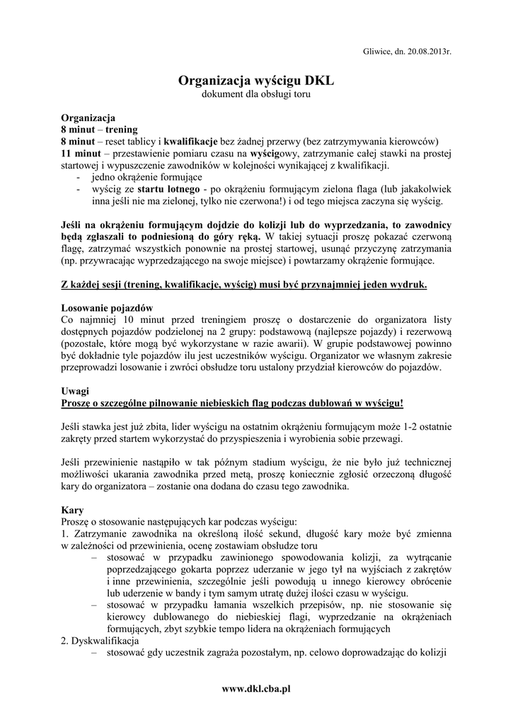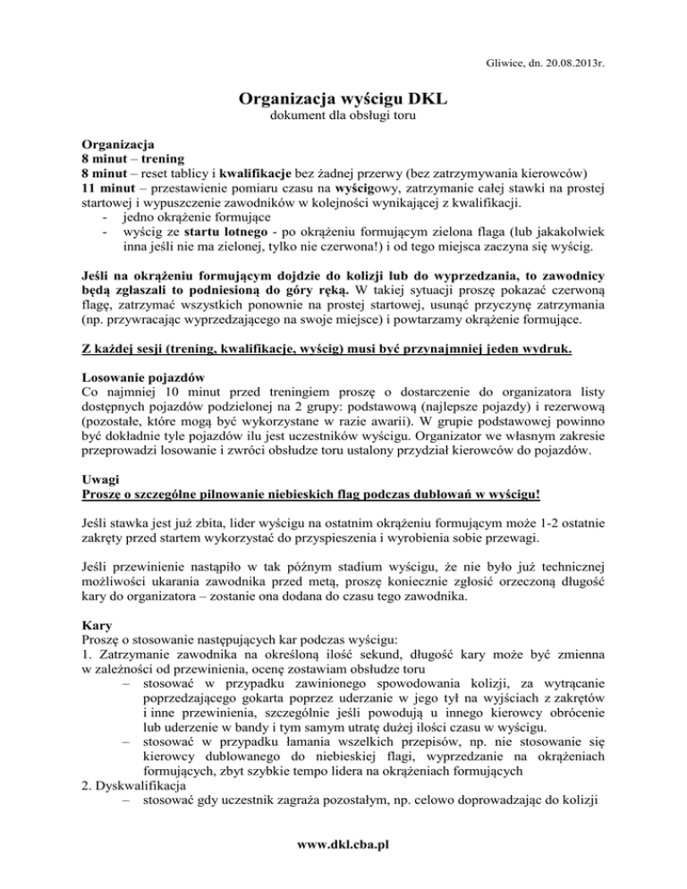 Gliwice, dn. 20.08.2013r. Organizacja wyścigu DKL dokument dla obsługi toru Organizacja 8 minut – trening 8 minut – reset tablicy i kwalifikacje bez żadnej przerwy (bez zatrzymywania kierowców) 11 minut – przestawienie pomiaru czasu na wyścigowy, zatrzymanie całej stawki na prostej startowej i wypuszczenie zawodników w kolejności wynikającej z kwalifikacji. - jedno okrążenie formujące - wyścig ze startu lotnego - po okrążeniu formującym zielona flaga (lub jakakolwiek inna jeśli nie ma zielonej, tylko nie czerwona!) i od tego miejsca zaczyna się wyścig. Jeśli na okrążeniu formującym dojdzie do kolizji lub do wyprzedzania, to zawodnicy będą zgłaszali to podniesioną do góry ręką. W takiej sytuacji proszę pokazać czerwoną flagę, zatrzymać wszystkich ponownie na prostej startowej, usunąć przyczynę zatrzymania (np. przywracając wyprzedzającego na swoje miejsce) i powtarzamy okrążenie formujące. Z każdej sesji (trening, kwalifikacje, wyścig) musi być przynajmniej jeden wydruk. Losowanie pojazdów Co najmniej 10 minut przed treningiem proszę o dostarczenie do organizatora listy dostępnych pojazdów podzielonej na 2 grupy: podstawową (najlepsze pojazdy) i rezerwową (pozostałe, które mogą być wykorzystane w razie awarii). W grupie podstawowej powinno być dokładnie tyle pojazdów ilu jest uczestników wyścigu. Organizator we własnym zakresie przeprowadzi losowanie i zwróci obsłudze toru ustalony przydział kierowców do pojazdów. Uwagi Proszę o szczególne pilnowanie niebieskich flag podczas dublowań w wyścigu! Jeśli stawka jest już zbita, lider wyścigu na ostatnim okrążeniu formującym może 1-2 ostatnie zakręty przed startem wykorzystać do przyspieszenia i wyrobienia sobie przewagi. Jeśli przewinienie nastąpiło w tak późnym stadium wyścigu, że nie było już technicznej możliwości ukarania zawodnika przed metą, proszę koniecznie zgłosić orzeczoną długość kary do organizatora – zostanie ona dodana do czasu tego zawodnika. Kary Proszę o stosowanie następujących kar podczas wyścigu: 1. Zatrzymanie zawodnika na określoną ilość sekund, długość kary może być zmienna w zależności od przewinienia, ocenę zostawiam obsłudze toru – stosować w przypadku zawinionego spowodowania kolizji, za wytrącanie poprzedzającego gokarta poprzez uderzanie w jego tył na wyjściach z zakrętów i inne przewinienia, szczególnie jeśli powodują u innego kierowcy obrócenie lub uderzenie w bandy i tym samym utratę dużej ilości czasu w wyścigu. – stosować w przypadku łamania wszelkich przepisów, np. nie stosowanie się kierowcy dublowanego do niebieskiej flagi, wyprzedzanie na okrążeniach formujących, zbyt szybkie tempo lidera na okrążeniach formujących 2. Dyskwalifikacja – stosować gdy uczestnik zagraża pozostałym, np. celowo doprowadzając do kolizji www.dkl.cba.pl