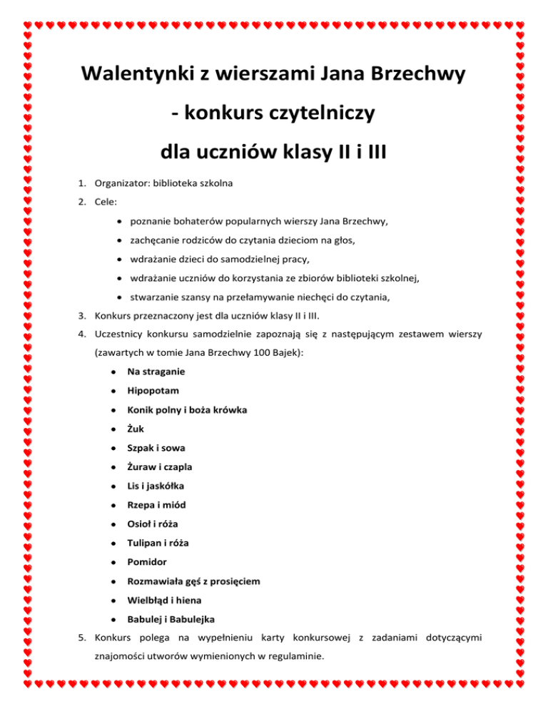 Walentynki z wierszami Jana Brzechwy - konkurs czytelniczy dla uczniów klasy II i III 1. Organizator: biblioteka szkolna 2. Cele: poznanie bohaterów popularnych wierszy Jana Brzechwy, zachęcanie rodziców do czytania dzieciom na głos, wdrażanie dzieci do samodzielnej pracy, wdrażanie uczniów do korzystania ze zbiorów biblioteki szkolnej, stwarzanie szansy na przełamywanie niechęci do czytania, 3. Konkurs przeznaczony jest dla uczniów klasy II i III. 4. Uczestnicy konkursu samodzielnie zapoznają się z następującym zestawem wierszy (zawartych w tomie Jana Brzechwy 100 Bajek): Na straganie Hipopotam Konik polny i boża krówka Żuk Szpak i sowa Żuraw i czapla Lis i jaskółka Rzepa i miód Osioł i róża Tulipan i róża Pomidor Rozmawiała gęś z prosięciem Wielbłąd i hiena Babulej i Babulejka 5. Konkurs polega na wypełnieniu karty konkursowej z zadaniami dotyczącymi znajomości utworów wymienionych w regulaminie.
