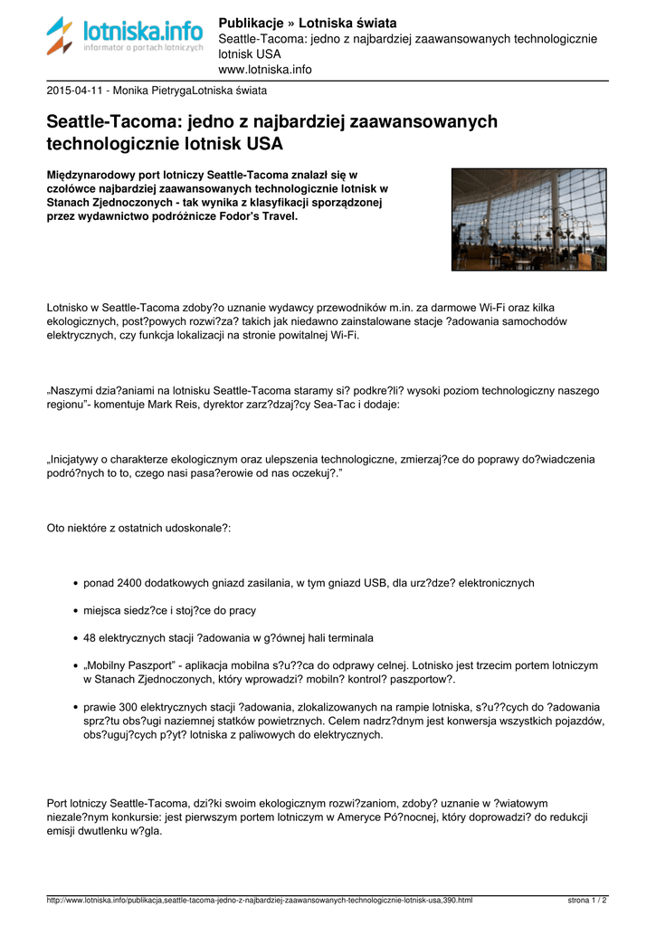 Publikacje » Lotniska świata Seattle-Tacoma: jedno z najbardziej zaawansowanych technologicznie lotnisk USA www.lotniska.info 2015-04-11 - Monika PietrygaLotniska świata Seattle-Tacoma: jedno z najbardziej zaawansowanych technologicznie lotnisk USA Międzynarodowy port lotniczy Seattle-Tacoma znalazł się w czołówce najbardziej zaawansowanych technologicznie lotnisk w Stanach Zjednoczonych - tak wynika z klasyfikacji sporządzonej przez wydawnictwo podróżnicze Fodor's Travel. Lotnisko w Seattle-Tacoma zdoby?o uznanie wydawcy przewodników m.in. za darmowe Wi-Fi oraz kilka ekologicznych, post?powych rozwi?za? takich jak niedawno zainstalowane stacje ?adowania samochodów elektrycznych, czy funkcja lokalizacji na stronie powitalnej Wi-Fi. „Naszymi dzia?aniami na lotnisku Seattle-Tacoma staramy si? podkre?li? wysoki poziom technologiczny naszego regionu”- komentuje Mark Reis, dyrektor zarz?dzaj?cy Sea-Tac i dodaje: „Inicjatywy o charakterze ekologicznym oraz ulepszenia technologiczne, zmierzaj?ce do poprawy do?wiadczenia podró?nych to to, czego nasi pasa?erowie od nas oczekuj?.” Oto niektóre z ostatnich udoskonale?: ponad 2400 dodatkowych gniazd zasilania, w tym gniazd USB, dla urz?dze? elektronicznych miejsca siedz?ce i stoj?ce do pracy 48 elektrycznych stacji ?adowania w g?ównej hali terminala „Mobilny Paszport” - aplikacja mobilna s?u??ca do odprawy celnej. Lotnisko jest trzecim portem lotniczym w Stanach Zjednoczonych, który wprowadzi? mobiln? kontrol? paszportow?. prawie 300 elektrycznych stacji ?adowania, zlokalizowanych na rampie lotniska, s?u??cych do ?adowania sprz?tu obs?ugi naziemnej statków powietrznych. Celem nadrz?dnym jest konwersja wszystkich pojazdów, obs?uguj?cych p?yt? lotniska z paliwowych do elektrycznych. Port lotniczy Seattle-Tacoma, dzi?ki swoim ekologicznym rozwi?zaniom, zdoby? uznanie w ?wiatowym niezale?nym konkursie: jest pierwszym portem lotniczym w Ameryce Pó?nocnej, który doprowadzi? do redukcji emisji dwutlenku w?gla. http://www.lotniska.info/publikacja,seattle-tacoma-jedno-z-najbardziej-zaawansowanych-technologicznie-lotnisk-usa,390.html strona 1 / 2 Publikacje » Lotniska świata Seattle-Tacoma: jedno z najbardziej zaawansowanych technologicznie lotnisk USA www.lotniska.info Źródło: ( http://www.airport-world.com/news/general-news/4989-high-tech-seattle-tacoma-recognised-by-us-travel-guide.htm l) http://www.lotniska.info/publikacja,seattle-tacoma-jedno-z-najbardziej-zaawansowanych-technologicznie-lotnisk-us a,390.html http://www.lotniska.info/publikacja,seattle-tacoma-jedno-z-najbardziej-zaawansowanych-technologicznie-lotnisk-usa,390.html Powered by TCPDF (www.tcpdf.org) strona 2 / 2