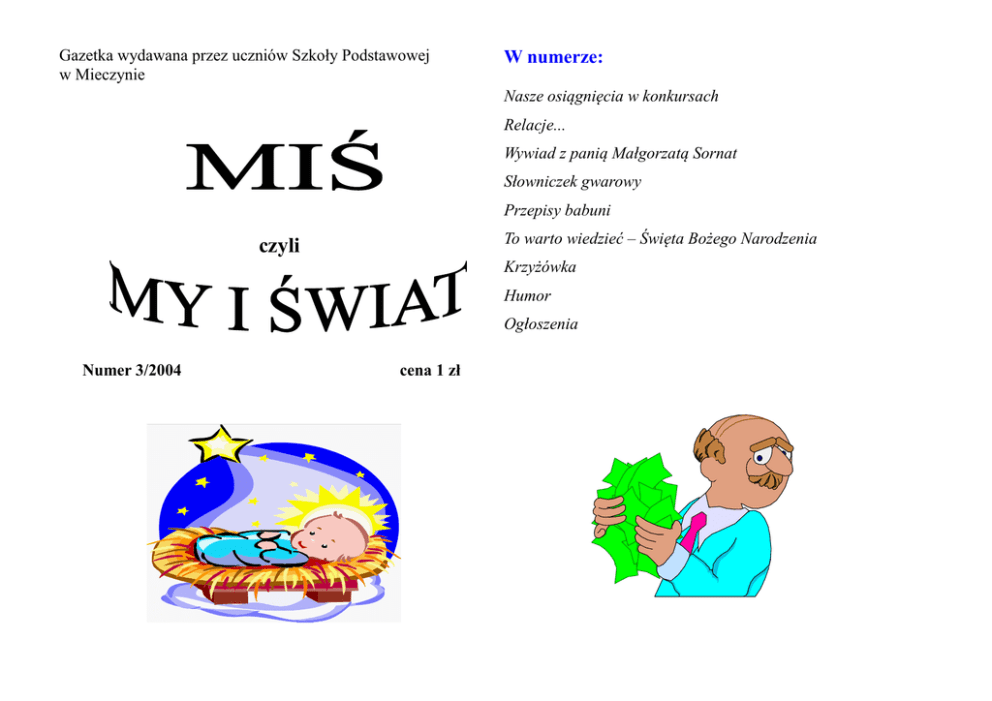 Gazetka wydawana przez uczniów Szkoły Podstawowej w Mieczynie W numerze: Nasze osiągnięcia w konkursach Relacje... Wywiad z panią Małgorzatą Sornat Słowniczek gwarowy Przepisy babuni To warto wiedzieć – Święta Bożego Narodzenia czyli Krzyżówka Humor Ogłoszenia Numer 3/2004 cena 1 zł Nasze osiągnięcia ... Nasze osiągnięcia c.d. KONKURSY PRZEDMIOTOWE KONKURSY SPORTOWE W tym roku po raz drugi odbyły się konkursy przedmiotowe: humanistyczny (28.X) i matematyczno – przyrodniczy (29.X). Po przeprowadzeniu eliminacji szkolnych, naszą szkołę na szczeblu gminnym reprezentowali: Kamil Klimczyk, Damian Staciwa, Grzegorz Kupczyk. W konkursie humanistycznym pierwsze miejsce zajął Kamil Klimczyk i przeszedł do etapu powiatowego, który odbędzie się w styczniu. Trzymamy kciuki! W dniu 7 października 2004 roku, chłopcy z naszej szkoły brali udział w sztafetowych biegach przełajowych w Olesznie. Był to etap gminny, na którym "wybiegali" I miejsce. Oto skład naszej drużyny: 1. Klimczyk Kamil 2. Cygan Hubert 3. Ptak Mateusz 4. Stolarczyk Marcin 5. Ciszek Jan 6. Larecki Radosław 7. Frączek Dawid 8. Jedliński Łukasz 9. Grad Krystian 10. Larecki Damian /Damian S./ Rezerwowi: 11. Sobczyk Grzegorz 12. Robak Michał Dzięki temu wynikowi przeszliśmy do etapu powiatowego, ale tam nie poszło nam już tak dobrze. Do poprzedniego składu dołączyli: Mazur Arkadiusz i Kot Artur. /Dawid F./ Relacje ... Wywiady ... DZIEŃ EDUKACJI NARODOWEJ WYWIAD Z PANEM CZESŁAWEM KUKLĄ Dnia 19.10.2004 r. odbyła się w naszej szkole akademia z okazji święta Edukacji Narodowej. Przygotowywali ją uczniowie klas IV-VI. Nad całością czuwała pani mgr W. Wilczyńska oraz mgr I. Kukla. Występom towarzyszyły gromkie brawa i wybuchy śmiechu, gdyż mieliśmy możliwość obejrzenia strojów uczniowskich od prehistorii do współczesności. - Jaki ma pan zawód? - Obecnie jestem na emeryturze, ale przez 35 lat pracowałem jako nauczyciel w Szkole Podstawowej w Mieczynie. Nie wiem czy wiecie, ale w tej szkole była przez wiele lat Zasadnicza Szkoła Rolnicza, a nawet internat. - Jakich przedmiotów pan uczył? - Byłem absolwentem Akademii Rolniczej w Lublinie i uczyłem głównie biologii i chemii. - Wiemy, że był pan naszym radnym. - Tak, prze dwie kadencje reprezentowałem interesy mieszkańców naszej miejscowości. - Jaką funkcję pan pełnił ? - W pierwszej kadencji(1994 – 1998) byłem członkiem Komisji Informacyjnej oraz członkiem Komisji Planowania Budżetu i Inwentaryzacji. W drugiej kadencji (1998 – 2000) byłem członkiem Zarządu Rady Gminy i członkiem Komisji Przetargowej. - Czym zajmują się radni? - Każdy radny pracuje w komisjach, nie więcej niż w dwóch, przygotowując materiały na najbliższą sesję. Radny bierze czynny udział w sesji – obradach Rady Gminy, w opracowywaniu materiałów i uchwał oraz ich zatwierdzaniu lub nie, na zasadzie głosowania jawnego. Bardzo ucieszyliśmy się, gdy usłyszeliśmy słowa uznania od Pani Dyrektor dla naszych nauczycieli. W tym roku przyznano "Nagrody Dyrektora" p. Agacie Frączek, p. mgr Agacie Szymczyk oraz p. mgr Wandzie Wilczyńskiej. Wywiady c.d. Krzyżówka ... - Ilu jest radnych w naszej gminie? - Do ostatnich wyborów tzn. do 11.10.2002r. było 22 członków. Obecnie mamy 15 radnych. - Jak często radni obradują? - Sesje odbywają się przynajmniej raz w kwartale, praktycznie raz w miesiącu. Poszczególne komisje odbywają posiedzenia przed sesją Rady Gminy, celem omówienia materiałów i ich zatwierdzenia na najbliższą sesję z danego działu, np. sprawy d o t y c z ą c e o ś w i a t y i zdrowia omawia Komisja Zdrowia, Opieki Społecznej Oświaty i Kultury, sprawy dotyczące rolnictwa – Komisja Rolnictwa. - Dziękujemy za rozmowę. KRZYŻÓWKA MATEMATYCZNA Od tego numeru naszej gazetki będziemy zamieszczać krzyżówki przedmiotowe, przygotowane przez nauczycieli różnych specjalności. Krzyżówkę do tego numeru przygotowała p. Marianna Kukla. POZIOMO 2 – znak odejmowania 5 – wynik dzielenia 7 – iloraz 303 i 101 8 – ma 365 dni POZIOMO 1 – wynik dodawania 3 – wynik mnożenia 4 – dostaniesz, jeśli dobrze rozwiążesz tę krzyżówkę 6 – iloraz liczb 0 i 362 Po rozwiązaniu krzyżówki, prosimy policzyć, ile razy występuje litera S. Odpowiedzi – na specjalnym kuponie – prosimy przynosić do p. M. Kukli tylko do środy t.j. do 22.12.04. /wywiad przeprowadzili uczniowie klasy VI/ Słowniczek gwarowy ... 1) bedzie – będzie 2) chlif – chlew 3) chłodźze – chodź 4) copka – czapka 5) dóm – dom 6) drwol – drwal 7) godać – mówić 8) jo – ja 9) kawołek – kawałek, część 10) klinkać – klękać 11) kochom – kocham 12) un – on 13) una – ona 14) wioł – wiał KUPON NR 3/2004 KRZYŻÓWKA MATEMATYCZNA ODPOWIEDŹ : ................................................................. IMIĘ I NAZWISKO: ......................................................... KLASA: ....................... 15) wzion – wziął 16) źmioki - ziemniaki Okruchy ... Przepisy babuni ... PALUSZKI Z KMINKIEM Jestem jak ser ciągle się topię. Krzysiek K. 0,5 kg mąki 25 dag masła lub margaryny 1 jajo 1 żółtko szklanka kwaśnej śmietany kminek szczypta soli jajo do smarowania ciasta Mąkę posiekać z tłuszczem, dodać sól, żółtko, jajko, kminek, śmietanę i szybko zagnieść ciasto. Rozwałkować na grubość 0,5 cm, pokroić na paseczki szerokości 1 cm i długości około 10 cm. Posmarować roztrzepanym jajkiem, wstawić do piekarnika i upiec na rumiano w temperaturze 200 stopni C. Podawać do czerwonego barszczu. SMACZNEGO! Jestem jak but często się rozklejam. Jestem miękki jak papier toaletowy. Moje życie jest jak piłka. Pokopane. Grzesiek K. Jestem jak ogień, który nie wygasa. Michał R. Jestem jak pędzel, którym malujesz serce swe. Nieprzytomne serce me wlekę co popołudnie jak gałąź do domu. Justyna P. Okruchy c.d. Humor ... Czuję się j