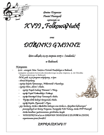 Gmina Krzywcza Powiat Przemyski zapraszają na XVII „FolkowąNutę” oraz DOŻYNKI GMINNE które odbędą się 23 sierpnia 2015 r. (niedziela) w Babicach. W programie: 13.00 – uroczysta Msza Święta w Kościele Parafialnym w Babicach, następnie: przejście korowodu dożynkowego na plac imprezy, tj. do Ośrodka Wypoczynkowego w Babicach Od ok. godz. 14.30 program artystyczny , w tym: - obrzęd dożynkowy, - występ Zespołu Śpiewaczego „Wiktorianki”z Ruszelczyc, - występ Chóru „Gloria” z Babic, występ Kapeli Ludowej Warzanie” z Wary, występ Kapeli Kańczudzkiej z Kańczugi, występ Dziecięcych Grup Tanecznych z Babic, Występ solistki Gabrysi Grzegorzak z Babic, występ Zespołu „Piganeczki” z Pigan, - gry i konkursy, stoiska z rękodziełem ludowym oraz stoiska ze „Specjałami kulinarnymi” poszczególnych wsi Gminy Krzywcza, Europejskie Koło Fortuny, stoisko OHP Przemyśl, stoiska handlowe i gastronomiczne, zjeżdżalnia, kucyki. WIECZOREM od 20.00 ZABAWA TANECZNA Z ZESPOŁEM LEXER organizowana przez firmęAS. ZAPRASZAMY !!!