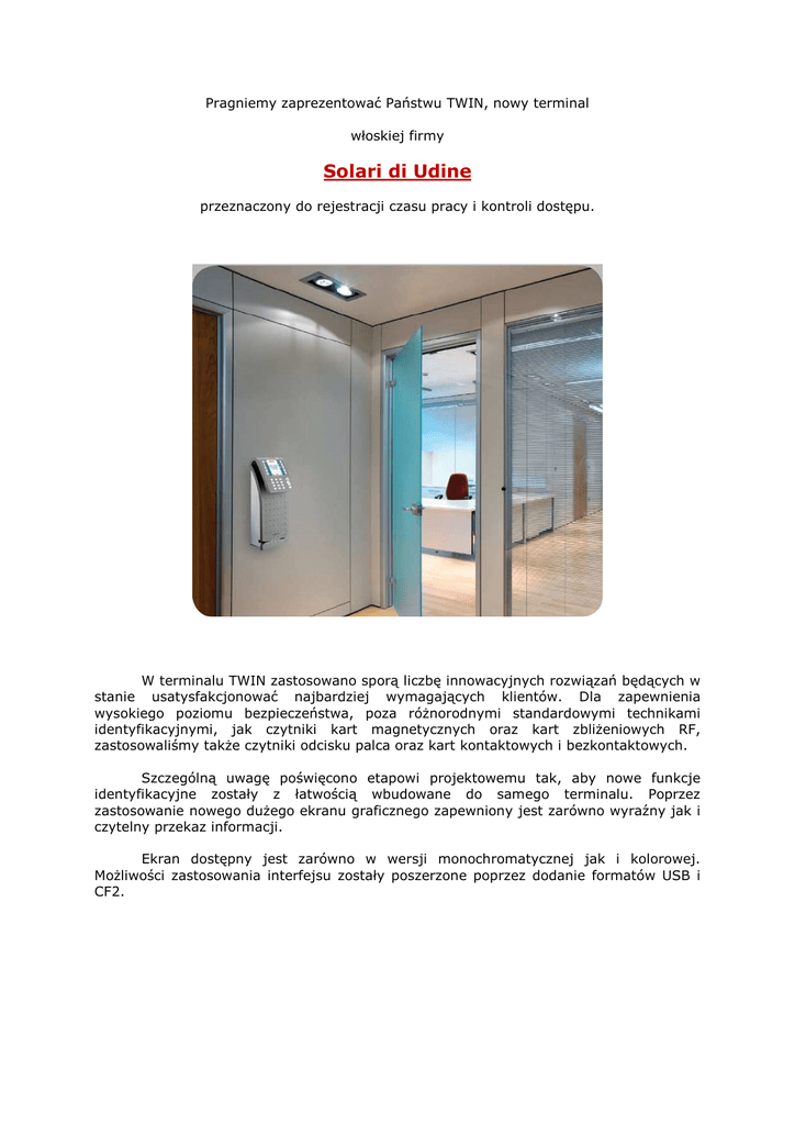 Pragniemy zaprezentować Państwu TWIN, nowy terminal włoskiej firmy Solari di Udine przeznaczony do rejestracji czasu pracy i kontroli dostępu. W terminalu TWIN zastosowano sporą liczbę innowacyjnych rozwiązań będących w stanie usatysfakcjonować najbardziej wymagających klientów. Dla zapewnienia wysokiego poziomu bezpieczeństwa, poza róŜnorodnymi standardowymi technikami identyfikacyjnymi, jak czytniki kart magnetycznych oraz kart zbliŜeniowych RF, zastosowaliśmy takŜe czytniki odcisku palca oraz kart kontaktowych i bezkontaktowych. Szczególną uwagę poświęcono etapowi projektowemu tak, aby nowe funkcje identyfikacyjne zostały z łatwością wbudowane do samego terminalu. Poprzez zastosowanie nowego duŜego ekranu graficznego zapewniony jest zarówno wyraźny jak i czytelny przekaz informacji. Ekran dostępny jest zarówno w wersji monochromatycznej jak i kolorowej. MoŜliwości zastosowania interfejsu zostały poszerzone poprzez dodanie formatów USB i CF2. SPECYFIKACJA SPRZĘTU Procesor • Last generation 32bit Risc ARM microprocessor • 32 MB Ram • 16 MB Flash Memory Dostępny ekran • 5,7 cali, Graphic TFT, 1/4 VGA rozmiar (320x240), 65,536 kolorów. • 4,7 cali, Monochrome LCD, 1/4 VGA rozmiar (320x240). Klawiatura • Numeryczna umoŜliwiająca wprowadzanie danych. • Przycisk nawigacyjny umoŜliwiający dodatkowe przewijanie oprócz standardowych przycisków wyboru funkcji. • Przyciski wyboru funkcji. Łączność • Ethernet 10/100 BASE T. • Standardowe szeregowe łącza komunikacyjne 2 RS232 lub RS485. • USB wersja 1.1 do połączeń peryferyjnych z drukarkami, modemami oraz innymi urządzeniami USB. • CF2 - Compact Flash typ 2 Zastosowanie czterech róŜnych interfejsów standardowych umoŜliwia podłączenie urządzeń zatwierdzonych przez Solari takich jak modemy analogowe, modemy GSM/GPRS, sieci bezprzewodowe LAN (802,11b), oraz technologia Bluetooth. Metody identyfikacji uŜytkownika • Czytnik kart magnetycznych (ISO trace 2 standard). • Biometryczny czytnik odcisków palca. • Czytnik karty smart (ISO 7816 standard). • Czytnik bezkontatkowej karty smart. • Pisak optyczny, Czytnik skanujący CCD. Wprowadzanie/wyprowadzanie danych cyfrowych(Input/Output) • 2 wielofunkcyjne urządzenia wejściowe i 4 wyjściowe Zasilanie • 230V ± 10% 50/60 Hz • 8 godzinna funkcja standby, tzn. zasilanie baterią – bez podłączenia do sieci zasilania. SPECYFIKACJA OPROGRAMOWANIA Protokoły komunikacyjne • SOAP (HTTP e XML) dla komunikacji host-twin. • Czynnik kontaktowy NTP dla synchronizacji czasowej timeover-ethernet • Oprogramowanie protokołu SNMP wykorzystywane do monitorowania integralności systemu. Właściwości • Gromadzenie danych z zakresu nadzoru i kontroli dostępu, danych z zakresu linii produkcyjnej oraz rezerwacji/rejestracji posiłków na miejscu. • Ładowanie zachowanych danych w celu weryfikacji danych i konsultacji w zakresie danych osobowych. • Tryb pracy online (połączony do hosta) lub off-line (niezaleŜny). • Wszystkie dane są kodowane przed dalszym przesłaniem. • Sprawdzenie uwierzytelnienia oprogramowania osoby dzwoniącej przed rozpoczęciem komunikacji. • MoŜliwość personalizacji wyświetlanych ikon i tła. Konfiguracja • Przesyłanie przy pomocy softwaru komunikatów oraz konfiguracjiTerm Talk w formacie XML Serwisowanie • Lokalne przy pomocy klucza • Lokalne przy pomocy specjalnej magnetycznej karty z kluczem serwisowym • Na odległość poprzez oprogramowanie wyszukujące słuŜące do konfiguracji ustawień parametrów i sprawdzenia . • Aktualizacja firmware poprzez oprogramowanie karty magnetycznej smart TermTalk OPIS FUNKCJI UśYTKOWYCH CZYTNIKA 1. czytnik służy do rejestracji wejścia i wyjścia (karta magnetyczna, zbliżeniowa, dualna, odcisk palca); 2. istniej możliwość wpisania numeru karty z klawiatury numerycznej w przypadku gdy pracownik zapomni karty; 3. istnieje możliwość rejestrowania wejść i wyjść służbowych; 4. po zbliżeniu karty i wciśnięciu jednego z ośmiu klawiszy funkcyjnych pracownik może dowiedzieć się m.in.: ile ma urlopu, ile wypracował na akordzie do tej pory, czy i od kogo otrzymał polecenie służbowe; 5. czytnik zainstalowany na hali produkcyjnej może służyć do rozpoczynania i kończenia zleceń produkcyjnych natomiast zainstalowany na stołówce zakładowej służyć może do ewidencji wydawanych posiłków; 6. w sieć mogą być wpięte również zamki do drzwi wykorzystujące te same karty które można zdefiniować indywidualnie dla każdego pracownika; 7. do sieci CRM mogą być podpięte szlabany do wjazdu na parking firmowy; 8. przy odbijaniu karty czytnik automatycznie może wyświetlić komunikat np. "Proszę zgłosić się do Działu Zarządzania Personelem w celu odebrania skierowania na badania okresowe"; 9. cały system może być udostępniony poprzez internet co umożliwi pracownikowi po uprzednim podaniu np. nr pesel i hasła sprawdzenie ilości dniu urlopu, wydrukowanie paska płacowego lub złożenie elektronicznego wniosku o urlop; 10. oprogramowanie czytnika umożliwia zdefiniowanie wielu odbiorców z podziałem na; 11. ukłon w stronę Kadry Zarządzającej: Kierownik zmiany może zobaczyć listę obecności swoich podwładnych natomiast Prezes listę całej firmy; 12. system umożliwia prowadzenie Elektronicznych Akta Osobowych (skany zdjęć, świadectw pracy, dyplomów, zaświadczeń o uprawnieniach, badań itp.) 13. system pozwala na komunikację pracownika z przełożonym za pośrednictwem poczty wewnętrznej; 14. dane z czytnika nie muszą być zaczytywane raz dziennie, czytnik posiada wbudowaną pamięć wewnętrzną; 15. system pozwala na komunikację pracownika z przełożonym za pośrednictwem poczty wewnętrznej; 16. każdy czytnik ma podtrzymywaną pamięć za pomocą baterii co umożliwia jego pracę przez kilka godzin bez zasilania zewnętrznego; 17. czytnik może być wyposażony w 