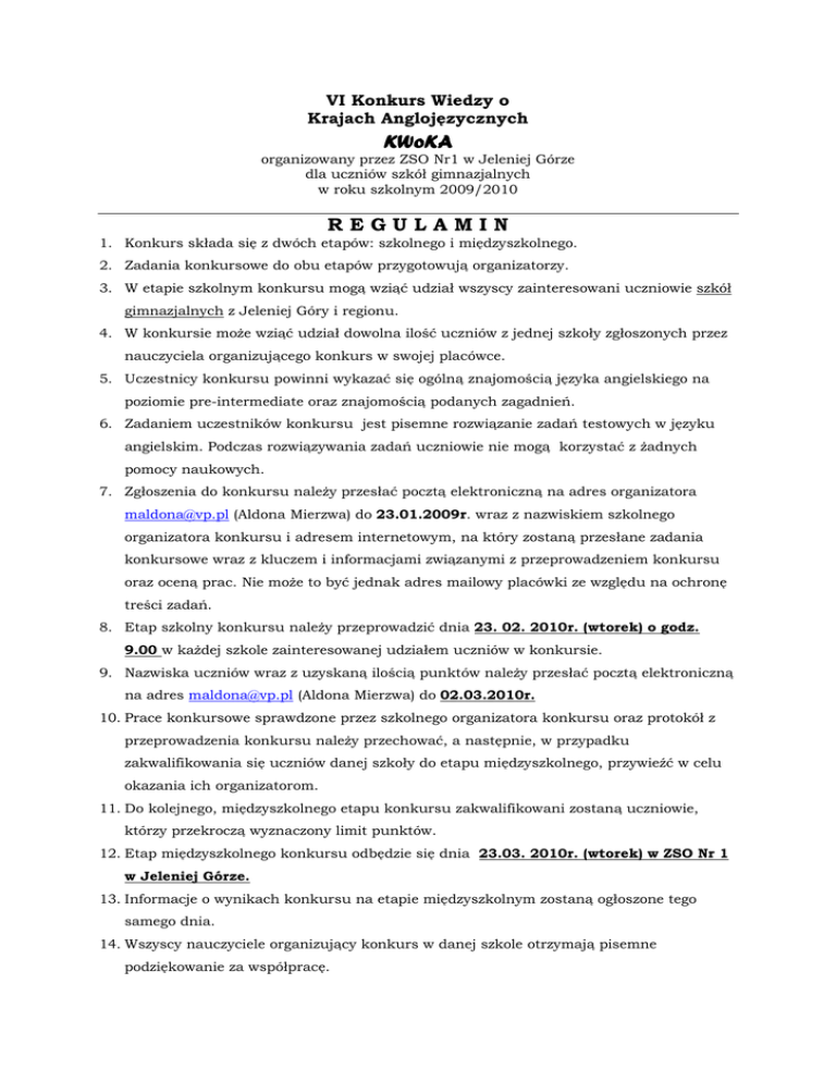 VI Konkurs Wiedzy o Krajach Anglojęzycznych KWoKA organizowany przez ZSO Nr1 w Jeleniej Górze dla uczniów szkół gimnazjalnych w roku szkolnym 2009/2010 REGULAMIN 1. Konkurs składa się z dwóch etapów: szkolnego i międzyszkolnego. 2. Zadania konkursowe do obu etapów przygotowują organizatorzy. 3. W etapie szkolnym konkursu mogą wziąć udział wszyscy zainteresowani uczniowie szkół gimnazjalnych z Jeleniej Góry i regionu. 4. W konkursie moŜe wziąć udział dowolna ilość uczniów z jednej szkoły zgłoszonych przez nauczyciela organizującego konkurs w swojej placówce. 5. Uczestnicy konkursu powinni wykazać się ogólną znajomością języka angielskiego na poziomie pre-intermediate oraz znajomością podanych zagadnień. 6. Zadaniem uczestników konkursu jest pisemne rozwiązanie zadań testowych w języku angielskim. Podczas rozwiązywania zadań uczniowie nie mogą korzystać z Ŝadnych pomocy naukowych. 7. Zgłoszenia do konkursu naleŜy przesłać pocztą elektroniczną na adres organizatora [email protected] (Aldona Mierzwa) do 23.01.2009r. wraz z nazwiskiem szkolnego organizatora konkursu i adresem internetowym, na który zostaną przesłane zadania konkursowe wraz z kluczem i informacjami związanymi z przeprowadzeniem konkursu oraz oceną prac. Nie moŜe to być jednak adres mailowy placówki ze względu na ochronę treści zadań. 8. Etap szkolny konkursu naleŜy przeprowadzić dnia 23. 02. 2010r. (wtorek) o godz. 9.00 w kaŜdej szkole zainteresowanej udziałem uczniów w konkursie. 9. Nazwiska uczniów wraz z uzyskaną ilością punktów naleŜy przesłać pocztą elektroniczną na adres [email protected] (Aldona Mierzwa) do 02.03.2010r. 10. Prace konkursowe sprawdzone przez szkolnego organizatora konkursu oraz protokół z przeprowadzenia konkursu naleŜy przechować, a następnie, w przypadku zakwalifikowania się uczniów danej szkoły do etapu międzyszkolnego, przywieźć w celu okazania ich organizatorom. 11. Do kolejnego, międzyszkolnego etapu konkursu zakwalifikowani zostaną uczniowie, którzy przekroczą wyznaczony limit punktów. 12. Etap międzyszkolnego konkursu odbędzie się dnia 23.03. 2010r. (wtorek) w ZSO Nr 1 w Jeleniej Górze. 13. Informacje o wynikach konkursu na etapie międzyszkolnym zostaną ogłoszone tego samego dnia. 14. Wszyscy nauczyciele organizujący konkurs w danej szkole otrzymają pisemne podziękowanie za współpracę. 15. Laureaci etapu międzyszkolnego konkursu otrzymają dyplomy laureatów oraz inne wspomniane w piśmie przewodnim nagrody. 16. Nauczyciele zdobywców I, II i III miejsca otrzymają listy gratulacyjne z zaznaczeniem miejsc zajętych przez laureatów. Organizatorzy konkursu