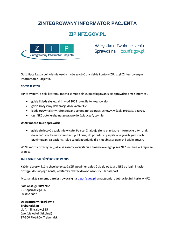 ZINTEGROWANY INFORMATOR PACJENTA ZIP.NFZ.GOV.PL Od 1 lipca każda pełnoletnia osoba może założyć dla siebie konto w ZIP, czyli Zintegrowanym Informatorze Pacjenta. CO TO JEST ZIP ZIP to system, dzięki któremu można samodzielnie, po zalogowaniu się sprawdzić przez Internet , · · · · gdzie i kiedy się leczyliśmy od 2008 roku, ile to kosztowało, gdzie złożyliśmy deklarację do lekarza POZ, kiedy otrzymaliśmy refundowany sprzęt, np. aparat słuchowy, wózek, protezę, a także, czy NFZ potwierdza nasze prawo do świadczeń, czy nie. W ZIP można także sprawdzić · gdzie się leczyć bezpłatnie w całej Polsce. Znajdują się tu przydatne informacje o tym, jak dojechać środkami komunikacji publicznej do poradni czy szpitala, w jakich godzinach przyjmowani są pacjenci, jakie są udogodnienia dla niepełnosprawnych i wiele innych. W ZIP można przeczytać , jakie są zasady korzystania z finansowanego przez NFZ leczenia w kraju i za granicą. JAK I GDZIE ZAŁOŻYĆ KONTO W ZIP? Każdy dorosły, który chce korzystać z ZIP powinien zgłosić się do oddziału NFZ po login i hasło dostępu do swojego konta, wystarczy okazać dowód osobisty lub paszport. Można także samemu zarejestrować się na zip.nfz.gov.pl, a następnie odebrać login i hasło w NFZ. Sala obsługi ŁOW NFZ ul. Kopcińskiego 56 90-032 Łódź Delegatura w Piotrkowie Trybunalskim al. Armii Krajowej 15 (wejście od ul. Szkolnej) 97-300 Piotrków Trybunalski Delegatura w Sieradzu plac Wojewódzki 3 98-200 Sieradz Delegatura w Skierniewicach ul. Jagiellońska 29 96-100 Skierniewice ZIP JEST BEZPIECZNY Korzystanie z ZIP jest bezpieczne – dane pacjentów są szczególnie chronione. ZIP będzie się rozwijał i coraz lepiej dostosowywał się także do potrzeb osób niepełnosprawnych. ZOBACZ, CO MOŻESZ SPRAWDZIĆ W ZIP Wejdź na zip.nfz.gov.pl i przekonaj się, że warto mieć konto w ZIP. Po kliknięciu: Zaloguj można obejrzeć wersję demonstracyjną Zintegrowanego Informatora Pacjenta. KONTAKT E-MAIL: [email protected] TEL. 42 275 48 18 Źródło: ŁOW NFZ