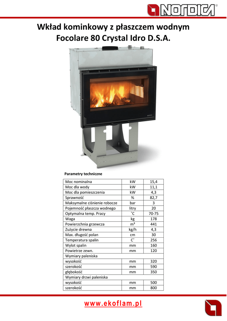Wkład kominkowy z płaszczem wodnym Focolare 80 Crystal Idro D.S.A. Parametry techniczne Moc nominalna Moc dla wody Moc dla pomieszczenia Sprawnośd Maksymalne ciśnienie robocze Pojemnośd płaszcza wodnego Optymalna temp. Pracy Waga Powierzchnia grzewcza Zużycie drewna Max. długośd polan Temperatura spalin Wylot spalin Powietrze zewn. Wymiary paleniska wysokośd szerokośd głębokośd Wymiary drzwi paleniska wysokośd szerokośd kW kW kW % bar litry ˚C kg m³ kg/h cm C˚ mm mm 15,4 11,1 4,3 82,7 3 20 70-75 178 441 4,3 30 256 160 120 mm mm mm 320 590 350 mm mm 500 800 www .e kof l am .p l Wymiary www .e kof l am .p l