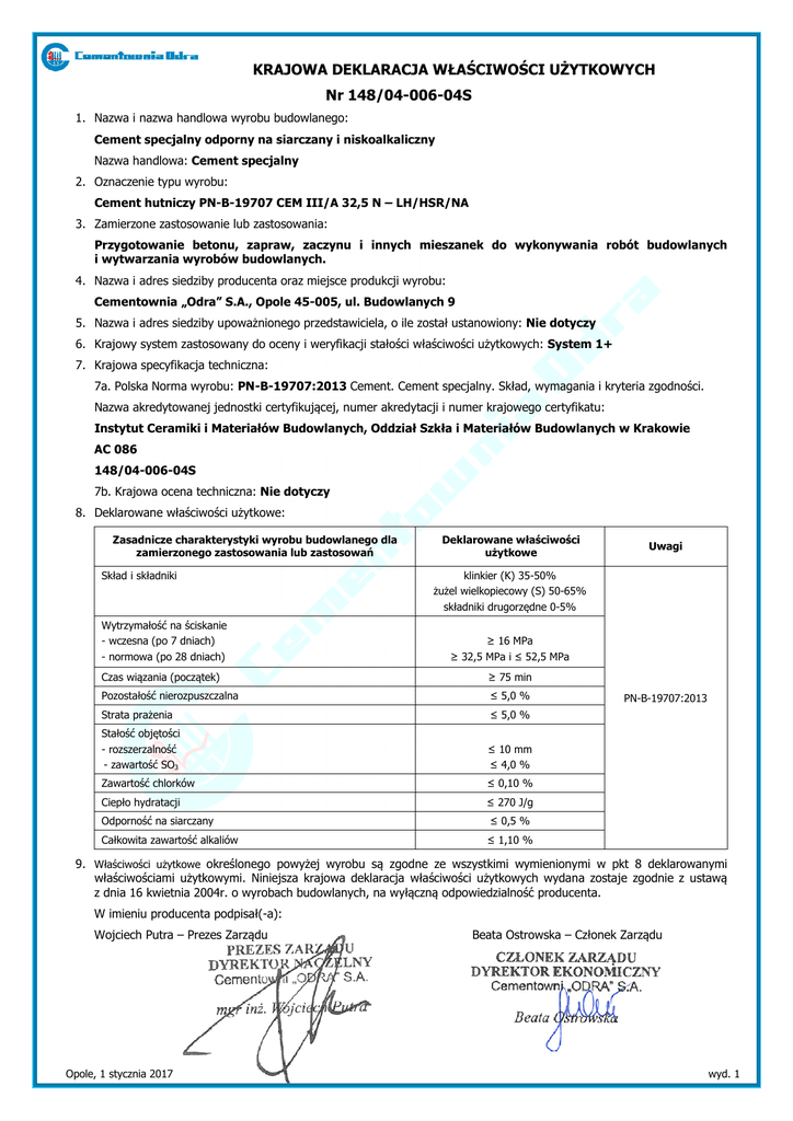 KRAJOWA DEKLARACJA WŁAŚCIWOŚCI UŻYTKOWYCH Nr 148/04-006-04S 1. Nazwa i nazwa handlowa wyrobu budowlanego: Cement specjalny odporny na siarczany i niskoalkaliczny Nazwa handlowa: Cement specjalny 2. Oznaczenie typu wyrobu: Cement hutniczy PN-B-19707 CEM III/A 32,5 N – LH/HSR/NA 3. Zamierzone zastosowanie lub zastosowania: Przygotowanie betonu, zapraw, zaczynu i innych mieszanek do wykonywania robót budowlanych i wytwarzania wyrobów budowlanych. 4. Nazwa i adres siedziby producenta oraz miejsce produkcji wyrobu: Cementownia „Odra” S.A., Opole 45-005, ul. Budowlanych 9 5. Nazwa i adres siedziby upoważnionego przedstawiciela, o ile został ustanowiony: Nie dotyczy 6. Krajowy system zastosowany do oceny i weryfikacji stałości właściwości użytkowych: System 1+ 7. Krajowa specyfikacja techniczna: 7a. Polska Norma wyrobu: PN-B-19707:2013 Cement. Cement specjalny. Skład, wymagania i kryteria zgodności. Nazwa akredytowanej jednostki certyfikującej, numer akredytacji i numer krajowego certyfikatu: Instytut Ceramiki i Materiałów Budowlanych, Oddział Szkła i Materiałów Budowlanych w Krakowie AC 086 148/04-006-04S 7b. Krajowa ocena techniczna: Nie dotyczy 8. Deklarowane właściwości użytkowe: Zasadnicze charakterystyki wyrobu budowlanego dla zamierzonego zastosowania lub zastosowań Skład i składniki Wytrzymałość na ściskanie - wczesna (po 7 dniach) - normowa (po 28 dniach) Deklarowane właściwości użytkowe Uwagi klinkier (K) 35-50% żużel wielkopiecowy (S) 50-65% składniki drugorzędne 0-5% ≥ 16 MPa ≥ 32,5 MPa i ≤ 52,5 MPa Czas wiązania (początek) ≥ 75 min Pozostałość nierozpuszczalna ≤ 5,0 % Strata prażenia ≤ 5,0 % Stałość objętości - rozszerzalność - zawartość SO3 ≤ 10 mm ≤ 4,0 % Zawartość chlorków ≤ 0,10 % Ciepło hydratacji ≤ 270 J/g Odporność na siarczany ≤ 0,5 % Całkowita zawartość alkaliów ≤ 1,10 % PN-B-19707:2013 9. Właściwości użytkowe określonego powyżej wyrobu są zgodne ze wszystkimi wymienionymi w pkt 8 deklarowanymi właściwościami użytkowymi. Niniejsza krajowa deklaracja właściwości użytkowych wydana zostaje zgodnie z ustawą z dnia 16 kwietnia 2004r. o wyrobach budowlanych, na wyłączną odpowiedzialność producenta. W imieniu producenta podpisał(-a): Wojciech Putra – Prezes Zarządu Opole, 1 stycznia 2017 Beata Ostrowska – Członek Zarządu wyd. 1