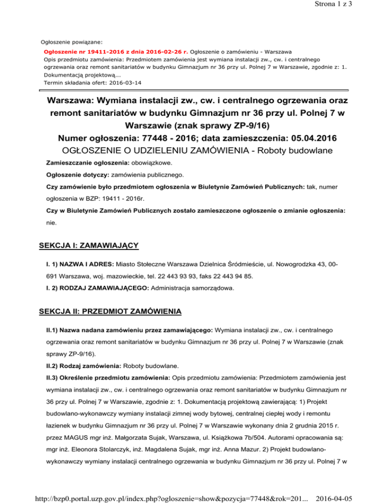 Strona 1 z 3 Ogłoszenie powiązane: Ogłoszenie nr 19411-2016 z dnia 2016-02-26 r. Ogłoszenie o zamówieniu - Warszawa Opis przedmiotu zamówienia: Przedmiotem zamówienia jest wymiana instalacji zw., cw. i centralnego ogrzewania oraz remont sanitariatów w budynku Gimnazjum nr 36 przy ul. Polnej 7 w Warszawie, zgodnie z: 1. Dokumentacją projektową... Termin składania ofert: 2016-03-14 Warszawa: Wymiana instalacji zw., cw. i centralnego ogrzewania oraz remont sanitariatów w budynku Gimnazjum nr 36 przy ul. Polnej 7 w Warszawie (znak sprawy ZP-9/16) Numer ogłoszenia: 77448 - 2016; data zamieszczenia: 05.04.2016 OGŁOSZENIE O UDZIELENIU ZAMÓWIENIA - Roboty budowlane Zamieszczanie ogłoszenia: obowiązkowe. Ogłoszenie dotyczy: zamówienia publicznego. Czy zamówienie było przedmiotem ogłoszenia w Biuletynie Zamówień Publicznych: tak, numer ogłoszenia w BZP: 19411 - 2016r. Czy w Biuletynie Zamówień Publicznych zostało zamieszczone ogłoszenie o zmianie ogłoszenia: nie. SEKCJA I: ZAMAWIAJĄCY I. 1) NAZWA I ADRES: Miasto Stołeczne Warszawa Dzielnica Śródmieście, ul. Nowogrodzka 43, 00691 Warszawa, woj. mazowieckie, tel. 22 443 93 93, faks 22 443 94 85. I. 2) RODZAJ ZAMAWIAJĄCEGO: Administracja samorządowa. SEKCJA II: PRZEDMIOT ZAMÓWIENIA II.1) Nazwa nadana zamówieniu przez zamawiającego: Wymiana instalacji zw., cw. i centralnego ogrzewania oraz remont sanitariatów w budynku Gimnazjum nr 36 przy ul. Polnej 7 w Warszawie (znak sprawy ZP-9/16). II.2) Rodzaj zamówienia: Roboty budowlane. II.3) Określenie przedmiotu zamówienia: Opis przedmiotu zamówienia: Przedmiotem zamówienia jest wymiana instalacji zw., cw. i centralnego ogrzewania oraz remont sanitariatów w budynku Gimnazjum nr 36 przy ul. Polnej 7 w Warszawie, zgodnie z: 1. Dokumentacją projektową zawierającą: 1) Projekt budowlano-wykonawczy wymiany instalacji zimnej wody bytowej, centralnej ciepłej wody i remontu łazienek w budynku Gimnazjum nr 36 przy ul. Polnej 7 w Warszawie wykonany dnia 2 grudnia 2015 r. przez MAGUS mgr inż. Małgorzata Sujak, Warszawa, ul. Książkowa 7b/504. Autorami opracowania są: mgr inż. Eleonora Stolarczyk, inż. Magdalena Sujak, mgr inż. Anna Mazur. 2) Projekt budowlanowykonawczy wymiany instalacji centralnego ogrzewania w budynku Gimnazjum nr 36 przy ul. Polnej 7 w http://bzp0.portal.uzp.gov.pl/index.php?ogloszenie=show&pozycja=77448&rok=201... 2016-04-05 Strona 2 z 3 Warszawie wykonany dnia 2 grudnia 2015 r. przez MAGUS mgr inż. Małgorzata Sujak, Warszawa, ul. Książkowa 7b/504. Autorami opracowania są: mgr inż. Eleonora Stolarczyk, inż. Magdalena Sujak, mgr inż. Anna Mazur. 3) Przedmiar robót dla wymiany instalacji zimnej wody bytowej, centralnej ciepłej wody i remontu łazienek w budynku Gimnazjum nr 36 przy ul. Polnej 7 w Warszawie wykonany dnia 2 grudnia 2015 r. przez MAGUS mgr inż. Małgorzata Sujak, Warszawa, ul. Książkowa 7b/504. Autorem opracowania jest mgr inż. Małgorzata Sujak. 4) Przedmiar robót dla wymiany instalacji centralnego ogrzewania w budynku Gimnazjum nr 36 przy ul. Polnej 7 w Warszawie wykonany dnia 2 grudnia 2015 r. przez MAGUS mgr inż. Małgorzata Sujak, Warszawa, ul. Książkowa 7b/504. Autorem opracowania jest mgr inż. Małgorzata Sujak. 2. Specyfikacją techniczną wykonania i odbioru robót budowlanych dla projektu budowlano-wykonawczego wymiany instalacji centralnego ogrzewania, zimnej wody, centralnej ciepłej wody i remontu łazienek w budynku Gimnazjum nr 36 przy ul. Polnej 7 w Warszawie wykonany dnia 2 grudnia 2015 r. przez MAGUS mgr inż. Małgorzata Sujak, Warszawa, ul. Książkowa 7b/504. Autorem opracowania jest mgr inż. Małgorzata Sujak. Ww. opracowania stanowią załącznik nr 7 do SIWZ. Zamawiający dopuszcza rozwiązania równoważne opisanym w dokumentacji projektowej oraz specyfikacji technicznej wykonania i odbioru robót. Wykonawca, który powołuje się na rozwiązania równoważne do opisanych przez Zamawiającego jest obowiązany wykazać, że oferowane przez niego produkty, urządzenia i technologie spełniają wymagania określone przez Zamawiającego. W przypadku zaoferowania innych urządzeń niż określone w SIWZ należy dołączyć do oferty karty katalogowe tych urządzeń. Dane ogólne obiektu: Kubatura budynku ok. 16 000 m3. Powierzchnia sanitariatów ok. 150 m2. W zakres zamówienia wchodzi m.in.: Roboty budowlane: - roboty rozbiórkowe, wyburzeniowe i zabezpieczające, - roboty glazurnicze, - roboty posadzkarskie (terakota), - roboty tynkarskie, - roboty malarskie, - wymiana stolarki drzwiowej wraz z ościeżnicami, - wymiana ścianek, kabin i drzwi systemowych między kabinami w sanitariatach Roboty sanitarne: - roboty rozbiórkowe i demontażowe, wymiana instalacji zimnej i ciepłej wody w budynku, - wymiana urządzeń w sanitariatach, - wymiana osprzętu w sanitariatach (lustra, podajniki do mydła, suszarki, uchwyty na papier), - wykonanie prób ciśnieniowych, - wykonanie robót towarzyszących poinstalacyjnych (zamurowanie bruzd), - wymiana instalacji centralnego ogrzewania z wymianą grzejników, - roboty izolacyjne Roboty elektryczne: - roboty rozbiórkowe i demontażowe, - roboty elektryczne polegające na przesunięciu gniazdek i montażu opraw oświetleniowych, - podłączenie urządzeń sanitarnych do instalacji elektrycznej, - wykonanie pomiarów instalacji elektrycznych i oświetlenia, - roboty towarzyszące. Szczegółowy opis przedmiotu zamówienia zawarty jest w projekcie umowy (załącznik nr 6 do SIWZ). Wymagany termin wykonania zamówienia: rozpoczęcie wykonania przedmiotu umowy nastąpi od dnia 24 czerwca 2016r. - zakończenie wykonania przedmiotu umowy nastąpi do dnia 26 sierpnia 2016 r.. II.4) Wspólny Słownik Zamówień (CPV): 45.33.00.00-9, 45.33.11.00-7, 45.32.00.00-6, 45.00.00.00-7. SEKCJA III: PROCEDURA http://bzp0.portal.uzp.gov.pl/index.php?ogloszenie=show&pozycja=77448&rok=201... 2016-04-05 Strona 3 z 3 III.1) TRYB UDZIELENIA ZAMÓWIENIA: Przetarg nieogranicz