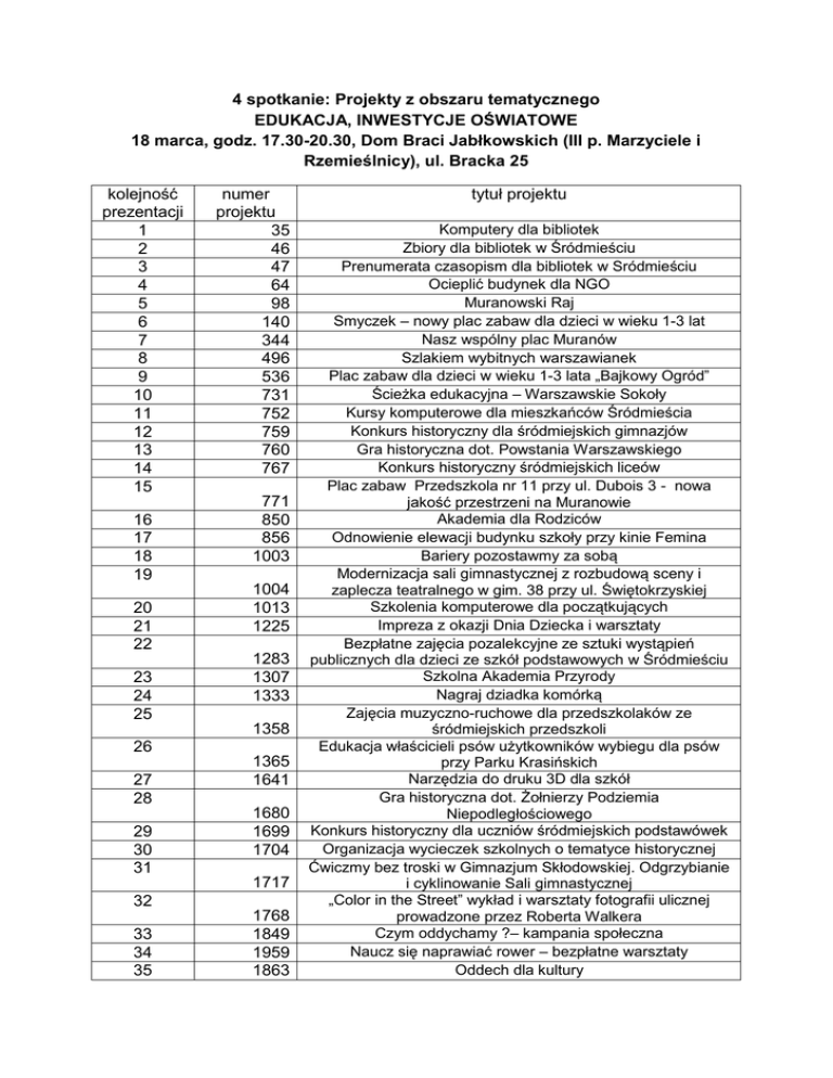 4 spotkanie: Projekty z obszaru tematycznego EDUKACJA, INWESTYCJE OŚWIATOWE 18 marca, godz. 17.30-20.30, Dom Braci Jabłkowskich (III p. Marzyciele i Rzemieślnicy), ul. Bracka 25 kolejność prezentacji 1 2 3 4 5 6 7 8 9 10 11 12 13 14 15 16 17 18 19 20 21 22 23 24 25 numer projektu 35 46 47 64 98 140 344 496 536 731 752 759 760 767 771 850 856 1003 1004 1013 1225 1283 1307 1333 1358 26 27 28 29 30 31 1365 1641 1680 1699 1704 1717 32 33 34 35 1768 1849 1959 1863 tytuł projektu Komputery dla bibliotek Zbiory dla bibliotek w Śródmieściu Prenumerata czasopism dla bibliotek w Sródmieściu Ocieplić budynek dla NGO Muranowski Raj Smyczek – nowy plac zabaw dla dzieci w wieku 1-3 lat Nasz wspólny plac Muranów Szlakiem wybitnych warszawianek Plac zabaw dla dzieci w wieku 1-3 lata „Bajkowy Ogród” Ścieżka edukacyjna – Warszawskie Sokoły Kursy komputerowe dla mieszkańców Śródmieścia Konkurs historyczny dla śródmiejskich gimnazjów Gra historyczna dot. Powstania Warszawskiego Konkurs historyczny śródmiejskich liceów Plac zabaw Przedszkola nr 11 przy ul. Dubois 3 - nowa jakość przestrzeni na Muranowie Akademia dla Rodziców Odnowienie elewacji budynku szkoły przy kinie Femina Bariery pozostawmy za sobą Modernizacja sali gimnastycznej z rozbudową sceny i zaplecza teatralnego w gim. 38 przy ul. Świętokrzyskiej Szkolenia komputerowe dla początkujących Impreza z okazji Dnia Dziecka i warsztaty Bezpłatne zajęcia pozalekcyjne ze sztuki wystąpień publicznych dla dzieci ze szkół podstawowych w Śródmieściu Szkolna Akademia Przyrody Nagraj dziadka komórką Zajęcia muzyczno-ruchowe dla przedszkolaków ze śródmiejskich przedszkoli Edukacja właścicieli psów użytkowników wybiegu dla psów przy Parku Krasińskich Narzędzia do druku 3D dla szkół Gra historyczna dot. Żołnierzy Podziemia Niepodległościowego Konkurs historyczny dla uczniów śródmiejskich podstawówek Organizacja wycieczek szkolnych o tematyce historycznej Ćwiczmy bez troski w Gimnazjum Skłodowskiej. Odgrzybianie i cyklinowanie Sali gimnastycznej „Color in the Street” wykład i warsztaty fotografii ulicznej prowadzone przez Roberta Walkera Czym oddychamy ?– kampania społeczna Naucz się naprawiać rower – bezpłatne warsztaty Oddech dla kultury