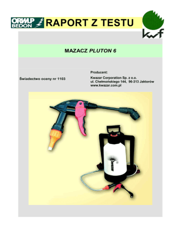 RAPORT Z TESTU MAZACZ PLUTON 6 Producent: Świadectwo oceny nr 1103 Kwazar Corporation Sp. z o.o. ul. Chełmońskiego 144, 96-313 Jaktorów www.kwazar.com.pl RAPORT Z TESTÓW Mazacz Pluton 6 Parametr Charakterystyka pracy Obsługa Charakterystyka Ocena Mazacz przeznaczony jest do zabezpieczania sadzonek przed zgryzaniem przez zwierzynę płową poprzez nanoszenie na nie repelentów. Charakterystyka wypływającego z dyszy strumienia cieczy pozwala na dość dokładne pokrycie preparatem wierzchołków sadzonek i samosiewów. + WyposaŜenie w stelaŜ plecakowy z szelkami pozwala na swobodne wykonywanie czynności rękoma. ++ Poprawnie wyprofilowany uchwyt pistoletowy oraz dźwignia umoŜliwiają dobre trzymanie i wygodną pracę pompką podczas spryskiwania + 0 Bezpieczeństwo pracy Kształt strumienia wypływającej z dyszy cieczy jest zgodny z nadanym kierunkiem. Nie stwierdzono niekontrolowanych wycieków ze spryskiwacza i pozostałych elementów mazacza Konserwacja Konserwacja jest łatwa i polega na kilkukrotnym przemyciu całego urządzenia wodą. + Skala ocen: ++ / + / 0 / - / -- (0=standard) Dane techniczne: Konstrukcja Zbiornik wykonany jest z tworzywa sztucznego i połączony węŜem z aplikatorem w formie pistoletu. Aplikator posiada pompkę ciśnieniowo-dozującą, która zasila dyszę rozpylającą. Całość zawieszona jest na stelaŜu typu plecakowego. Wysokość 530 mm Szerokość (ze stelaŜem) 400 mm Głębokość (ze stelaŜem) 270 mm Długość / średnica wewnętrzna węŜa 1150 mm / 6 mm Pojemność robocza zbiornika 6 dm Wielkość pojedynczej dawki spryskującej 1,6 - 1,9 cm Masa 3,30 kg Testy wykonali: mgr inŜ. Grzegorz Wasilewski mgr inŜ. Dariusz Szumicki tel. 042-677-25-52, 0601 44 00 80 e-mail.: [email protected] [email protected] Adres: ORW LP w Bedoniu Nowy Bedoń, ul. Sienkiewicza19 95-020 Andrespol http://www.bedon.lasy.gov.pl/ 3 3