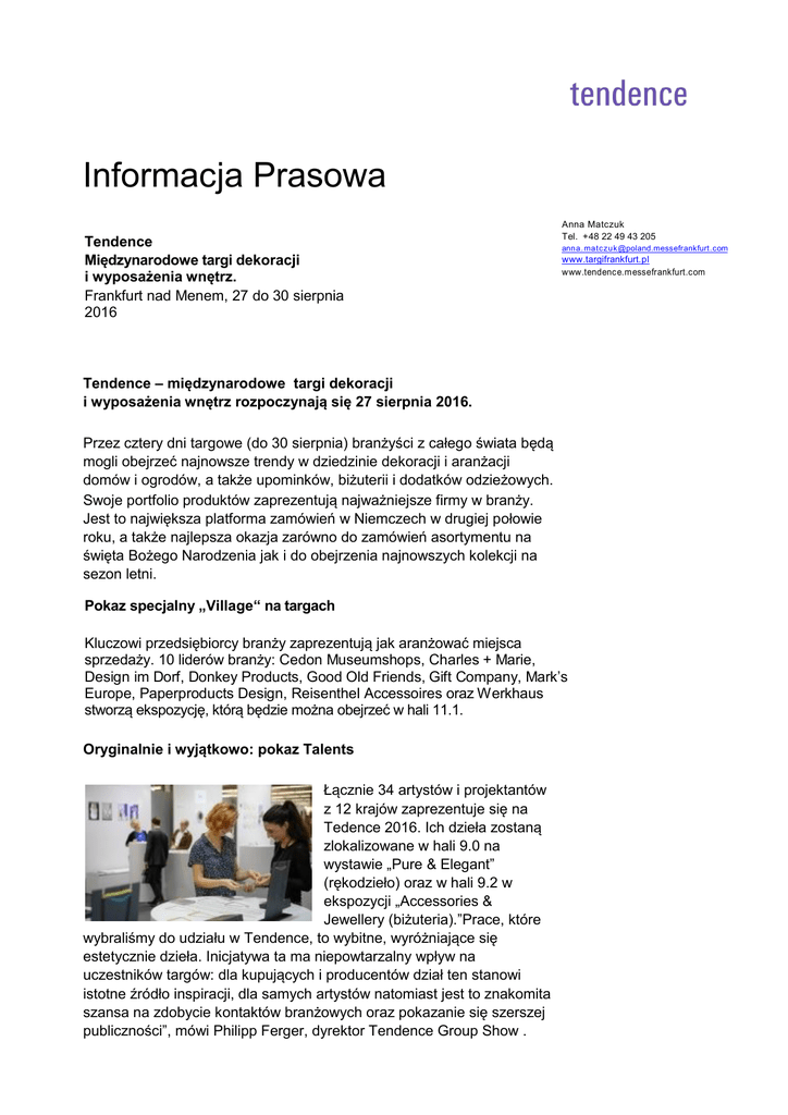 Informacja Prasowa Tendence Międzynarodowe targi dekoracji i wyposażenia wnętrz. Frankfurt nad Menem, 27 do 30 sierpnia 2016 Anna Matczuk Tel. +48 22 49 43 205 anna. [email protected] www.targifrankfurt.pl www.tendence.messefrankfurt.com Tendence – międzynarodowe targi dekoracji i wyposażenia wnętrz rozpoczynają się 27 sierpnia 2016. Przez cztery dni targowe (do 30 sierpnia) branżyści z całego świata będą mogli obejrzeć najnowsze trendy w dziedzinie dekoracji i aranżacji domów i ogrodów, a także upominków, biżuterii i dodatków odzieżowych. Swoje portfolio produktów zaprezentują najważniejsze firmy w branży. Jest to największa platforma zamówień w Niemczech w drugiej połowie roku, a także najlepsza okazja zarówno do zamówień asortymentu na święta Bożego Narodzenia jak i do obejrzenia najnowszych kolekcji na sezon letni. Pokaz specjalny „Village“ na targach Kluczowi przedsiębiorcy branży zaprezentują jak aranżować miejsca sprzedaży. 10 liderów branży: Cedon Museumshops, Charles + Marie, Design im Dorf, Donkey Products, Good Old Friends, Gift Company, Mark’s Europe, Paperproducts Design, Reisenthel Accessoires oraz Werkhaus stworzą ekspozycję, którą będzie można obejrzeć w hali 11.1. Oryginalnie i wyjątkowo: pokaz Talents Łącznie 34 artystów i projektantów z 12 krajów zaprezentuje się na Tedence 2016. Ich dzieła zostaną zlokalizowane w hali 9.0 na wystawie „Pure & Elegant” (rękodzieło) oraz w hali 9.2 w ekspozycji „Accessories & Jewellery (biżuteria).”Prace, które wybraliśmy do udziału w Tendence, to wybitne, wyróżniające się estetycznie dzieła. Inicjatywa ta ma niepowtarzalny wpływ na uczestników targów: dla kupujących i producentów dział ten stanowi istotne źródło inspiracji, dla samych artystów natomiast jest to znakomita szansa na zdobycie kontaktów branżowych oraz pokazanie się szerszej publiczności”, mówi Philipp Ferger, dyrektor Tendence Group Show . Więcej informacji na stronach: https://www.facebook.com/Tendence-targi-bran%C5%BCy-dekoracyjnej-i-upominkowej323767624439595/ www.tendence.com UWAGA!! Chętnych do udziału w zorganizowanym wyjeździe na targi Tendence 2016, przygotowanym przez nasze biuro, zapraszamy do kontaktu: (22) 49 43 201 – p. Dorota Idzikowska [email protected] Przedstawicielstwo targów Tendence na Polskę ul. Mołdawska 7/141 02-127 Warszawa Tel. 22 49 43 200 [email protected]