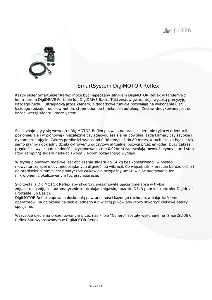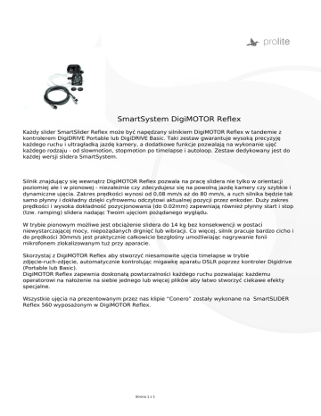 SmartSystem DigiMOTOR Reflex Każdy slider SmartSlider Reflex może być napędzany silnikiem DigiMOTOR Reflex w tandemie z kontrolerem DigiDRIVE Portable lub DigiDRIVE Basic. Taki zestaw gwarantuje wysoką precyzyję każdego ruchu i ultragładką jazdę kamery, a dodatkowe funkcje pozwalają na wykonanie ujęć każdego rodzaju - od slowmotion, stopmotion po timelapse i autoloop. Zestaw dedykowany jest do każdej wersji slidera SmartSystem. Silnik znajdujący się wewnątrz DigiMOTOR Reflex pozwala na pracę slidera nie tylko w orientacji poziomiej ale i w pionowej - niezależnie czy zdecydujesz się na powolną jazdę kamery czy szybkie i dynamiczne ujęcia. Zakres prędkości wynosi od 0,08 mm/s aż do 80 mm/s, a ruch silnika będzie tak samo płynny i dokładny dzięki cyfrowemu odczytowi aktualnej pozycji przez enkoder. Duży zakres prędkości i wysoka dokładność pozycjonowania (do 0.02mm) zapewniają również płynny start i stop (tzw. ramping) slidera nadając Twoim ujęciom pożądanego wyglądu. W trybie pionowym możliwe jest obciążenie slidera do 14 kg bez konsekwencji w postaci niewystarczającej mocy, niepożądanych drgnięć lub wibracji. Co więcej, silnik pracuje bardzo cicho i do prędkości 30mm/s jest praktycznie całkowicie bezgłośny umożliwiając nagrywanie fonii mikrofonem zlokalizowanym tuż przy aparacie. Skorzystaj z DigiMOTOR Reflex aby stworzyć niesamowite ujęcia timelapse w trybie zdjęcie-ruch-zdjęcie, automatycznie kontrolując migawkę aparatu DSLR poprzez kontroler Digidrive (Portable lub Basic). DigiMOTOR Reflex zapewnia doskonałą powtarzalności każdego ruchu pozwalając każdemu operatorowi na nałożenie na siebie jednego lub więcej plików aby łatwo stworzyć ciekawe efekty specjalne. Wszystkie ujęcia na prezentowanym przez nas klipie “Conero” zostały wykonane na SmartSLIDER Reflex 560 wyposażonym w DigiMOTOR Reflex. Strona 1 z 1