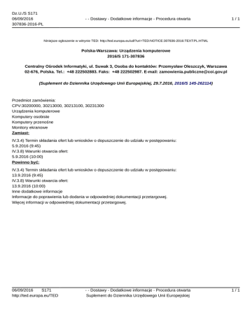 Dz.U./S S171 06/09/2016 307836-2016-PL - - Dostawy - Dodatkowe informacje - Procedura otwarta 1/1 Niniejsze ogłoszenie w witrynie TED: http://ted.europa.eu/udl?uri=TED:NOTICE:307836-2016:TEXT:PL:HTML Polska-Warszawa: Urządzenia komputerowe 2016/S 171-307836 Centralny Ośrodek Informatyki, ul. Suwak 3, Osoba do kontaktów: Przemysław Oleszczyk, Warszawa 02-676, Polska. Tel.: +48 222502883. Faks: +48 222502987. E-mail: [email protected] (Suplement do Dziennika Urzędowego Unii Europejskiej, 29.7.2016, 2016/S 145-262114) Przedmiot zamówienia: CPV:30200000, 30213000, 30213100, 30231300 Urządzenia komputerowe Komputery osobiste Komputery przenośne Monitory ekranowe Zamiast: IV.3.4) Termin składania ofert lub wniosków o dopuszczenie do udziału w postępowaniu: 5.9.2016 (9:45) IV.3.8) Warunki otwarcia ofert: 5.9.2016 (10:00) Powinno być: IV.3.4) Termin składania ofert lub wniosków o dopuszczenie do udziału w postępowaniu: 13.9.2016 (9:45) IV.3.8) Warunki otwarcia ofert: 13.9.2016 (10:00) Inne dodatkowe informacje Informacje do poprawienia lub dodania w odpowiedniej dokumentacji przetargowej. Więcej informacji w odpowiedniej dokumentacji przetargowej. 06/09/2016 S171 http://ted.europa.eu/TED - - Dostawy - Dodatkowe informacje - Procedura otwarta Suplement do Dziennika Urzędowego Unii Europejskiej 1/1