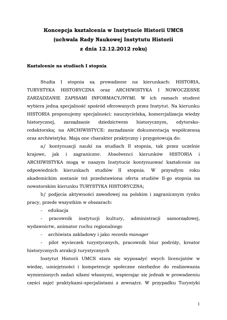 Koncepcja kształcenia w Instytucie Historii UMCS (uchwała Rady Naukowej Instytutu Historii z dnia 12.12.2012 roku) Kształcenie na studiach I stopnia Studia TURYSTYKA I stopnia są prowadzone HISTORYCZNA oraz na kierunkach: ARCHIWISTYKA I HISTORIA, NOWOCZESNE ZARZĄDZANIE ZAPISAMI INFORMACYJNYMI. W ich ramach student wybiera jedną specjalność spośród oferowanych przez Instytut. Na kierunku HISTORIA proponujemy specjalności: nauczycielską, komercjalizacja wiedzy historycznej, zarządzanie dziedzictwem historycznym, edytorsko- redaktorską; na ARCHIWISTYCE: zarządzanie dokumentacją współczesną oraz archiwistykę. Mają one charakter praktyczny i przygotowują do: a/ kontynuacji nauki na studiach II stopnia, tak przez uczelnie krajowe, jak i zagraniczne. Absolwenci kierunków HISTORIA i ARCHIWISTYKA mogą w naszym Instytucie kontynuować kształcenie na odpowiednich kierunkach studiów II stopnia. W przyszłym roku akademickim zostanie też przedstawiona oferta studiów II-go stopnia na nowatorskim kierunku TURYSTYKA HISTORYCZNA; b/ podjęcia aktywności zawodowej na polskim i zagranicznym rynku pracy, przede wszystkim w obszarach: - edukacja - pracownik instytucji kultury, administracji samorządowej, wydawnictw, animator ruchu regionalnego - archiwista zakładowy i jako records manager - pilot wycieczek turystycznych, pracownik biur podróży, kreator historycznych atrakcji turystycznych Instytut Historii UMCS stara się wyposażyć swych licencjatów w wiedzę, umiejętności i kompetencje społeczne niezbędne do realizowania wymienionych zadań siłami własnymi, wspierając się jednak w prowadzeniu części zajęć praktykami-specjalistami z zewnątrz. W przypadku Turystyki 1 historycznej niektóre zajęcia prowadzą fachowcy z biur podróży, zaś archiwistyki pracownicy sieci archiwów. Poza umiejętnościami praktycznymi, absolwent studiów I-go stopnia zdobywa wiedzę ogólnohumanistyczną, poprawia swoje kompetencje językowe, zdobywa niezbędne umiejętności warsztatowe specyficzne dla wybranego kierunku studiów. Nasz absolwent jest otwarty na różnorodne inspiracje metodologiczne, potrafi samodzielnie zdobywać i analizować potrzebne informacje, potrafi w sposób rzeczowy i dojrzały prowadzić polemikę, artykułować i bronić własne sądy i opinie. Posiada umiejętność wypowiedzi formułowanych w postaci tekstów popularnonaukowych i naukowych. Umie pracować w zespole i inspirować jego aktywność na różnych polach. Rozumie konieczność stałego własnego rozwoju, dokształcania i zdobywania dodatkowych kompetencji, czyniących go jako absolwenta bardziej atrakcyjnym i aktywnym uczestnikiem rynku pracy. Jest człowiekiem tolerancyjnym, szanującym odmienne postawy i poglądy, doceniającym i szanującym dziedzictwo kulturowe oraz rozumiejącym jego znaczenie dla społeczności ludzkich. Jednocześnie w spuściźnie przeszłości potrafi odnajdować inspiracje dla swojej aktywności zawodowej. Jest przy tym świadomy roli, jaką to dziedzictwo może odegrać w kreowaniu aktywności i promowaniu społeczności lokalnych. Kształcenie na studiach II stopnia Studia II stopnia prowadzone są obecnie w ramach kierunku HISTORIA. Student wybiera jedną z trzech oferowanych specjalności: nauczycielska, archiwistyczna oraz dziedzictwo historyczne regionu. Swoje indywidualne zainteresowania specjalnościowych: może też historia pogłębiać nauki i w kultury, ramach kilku dokumentacja bloków zabytków historycznych, z dziejów cywilizacji rosyjskiej, dzieje społeczeństwa polskiego, z dziejów demokracji europejskiej. W roku akademickim 2013/2014 planowana jest modyfikacja tego programu polegająca na przekształceniu 2 specjalności w odrębne kierunki studiów zgodne z ofertą studiów licencjackich. Studia II-go stopnia przygotowują do: a/ samodzielnego podejmowania działalności naukowej i popularnonaukowej oraz kontynuowania nauki na studiach doktoranckich b/ aktywności zawodowej na polskim i zagranicznym rynku pracy, przede wszystkim w obszarach: - edukacja na poziomie ponadgimnazjalnym - pracownik instytucji kultury, administracji samorządowej, wydawnictw, animator ruchu regionalnego - archiwista i jako records manager Absolwent jest przygotowany do podejmowania samodzielnych zadań oraz posiada przygotowanie do objęcia funkcji kierowniczych w zatrudniających go instytucjach. Realizację tych zadań umożliwia potencjał naukowy Instytutu Historii. Student może dokonać samodzielnego wyboru jednego spośród kilkunastu corocznie oferowanych seminariów magisterskich (dyplomowych), prowadzonych przez samodzielnych pracowników Instytutu. Student do swojej dyspozycji ma bogate zasoby biblioteczne, znajdujące się zarówno w przyjaznej bibliotece Wydziału Humanistycznego (swobodny dostęp do księgozbioru), jak i Bibliotece Głównej UMCS. Studia prowadzone są w nowoczesnych pomieszczeniach, dobrze zaopatrzonych w równie nowoczesny sprzęt audiowizualny pomocny w prowadzeniu zajęć. Instytut Historii UMCS oferuje też studentowi bogate możliwości uczestnictwa w studenckim ruchu naukowym. Członkowie kilku kół mają swobodę wyboru zainteresowań oraz często oryginalnych w skali kraju form działalności. Efekty swej działalności prezentują poprzez uczestnictwo w naukowych konferencjach studenckich, mają możliwości publikowania rezultatów badań w periodyku Koło Historii, oraz licznych pracach zbiorowych, pisanych często wspólnie z pracownikami naukowymi (nie tylko opiekunami kół). Przed studentem otwarte są możliwości wyjazdów i zagranicznych praktyk zawodowych w ramach programu Erasmus oraz posiadanych przez Instytut umów o partnerstwie z licznymi ośrodkami naukowymi poza granicami Polski. W tym względzie naszą specyfiką jest 3 wieloletnia współpraca (wymiana studentów) z uczelniami krajów Europy Wschodniej. Specjalistyczna umiejętności wiedza samodzielnego oraz kształcone formułowania na pytań studiach