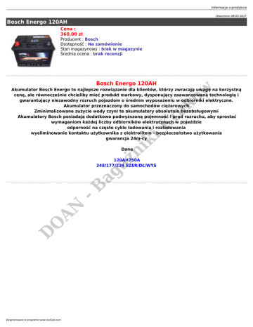 Informacje o produkcie Utworzono 08-03-2017 Bosch Energo 120AH Cena : 360,00 zł Producent : Bosch Dostępność : Na zamówienie Stan magazynowy : brak w magazynie Średnia ocena : brak recenzji Bosch Energo 120AH ik i K ra kó w Akumulator Bosch Energo to najlepsze rozwiązanie dla klientów, którzy zwracają uwagę na korzystną cenę, ale równocześnie chcieliby mieć produkt markowy, dysponujący zaawansowaną technologią i gwarantujący niezawodny rozruch pojazdom o średnim wyposażeniu w odbiorniki elektryczne. Akumulator przeznaczony do samochodów ciężarowych Zminimalizowane zużycie wody czyni te akumulatory absolutnie bezobsługowymi Akumulatory Bosch posiadają dodatkowo podwyższoną pojemność i prąd rozruchu, aby sprostać wymaganiom każdej liczby odbiorników elektrycznych w pojeździe odporność na częste cykle ładowania i rozładowania wyeliminowanie kontaktu użytkownika z elektrolitem - bezpieczeństwo użytkowania gwarancja 24m-cy aż n Dane D O AN -B ag 120AH750A 348/177/234 SZER/DŁ/WYS Wygenerowano w programie www.oscGold.com