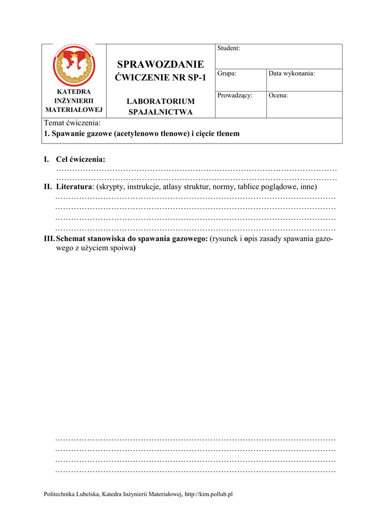 Student: SPRAWOZDANIE ĆWICZENIE NR SP-1 KATEDRA INŻYNIERII MATERIAŁOWEJ LABORATORIUM SPAJALNICTWA Grupa: Data wykonania: Prowadzący: Ocena: Temat ćwiczenia: 1. Spawanie gazowe (acetylenowo tlenowe) i cięcie tlenem I. Cel ćwiczenia: …………………………………………………………………………………………… …………………………………………………………………………………………… II. Literatura: (skrypty, instrukcje, atlasy struktur, normy, tablice poglądowe, inne) …………………………………………………………………………………………… …………………………………………………………………………………………… …………………………………………………………………………………………… …………………………………………………………………………………………… III. Schemat stanowiska do spawania gazowego: (rysunek i opis zasady spawania gazowego z użyciem spoiwa) …………………………………………………………………………………………… …………………………………………………………………………………………… …………………………………………………………………………………………… …………………………………………………………………………………………… Politechnika Lubelska, Katedra Inżynierii Materiałowej, http://kim.pollub.pl …………………………………………………………………………………………… …………………………………………………………………………………………… …………………………………………………………………………………………… …………………………………………………………………………………………… …………………………………………………………………………………………… …………………………………………………………………………………………… …………………………………………………………………………………………… …………………………………………………………………………………………… …………………………………………………………………………………………… Parametry spawania acetylenowo – tlenowego zastosowane w ćwiczeniu. Nazwa i typ palnika do spawania Ciśnienie robocze C2H2 Ciśnienie robocze O2 Nr nasadki do spawania Gatunek spoiwa Średnica spoiwa Nazwa złącza Nazwa spoiny Metoda wykonania spoiny Gatunek spawanej stali Grubość spawanej stali IV. Rysunek i opis wykonanego złącza spawanego wykonanego: (zwymiarowany rysunek wykonanego złącza, opis zaobserwowanych wad spawalniczych, SWC) …………………………………………………………………………………………… ………………………………………………………………………………....………… © Copyright by M. Szala, A. Tokarski, Lublin University of Technology, 2011 2 …………………………………………………………………………………………… …………………………………………………………………………………………… …………………………………………………………………………………………… …………………………………………………………………………………………… …………………………………………………………………………………………… V. Schemat i opis, zasady ciecia tlenem: (schemat budowy palnika do ciecia tlenem) …………………………………………………………………………………………… …………………………………………………………………………………………… …………………………………………………………………………………………… …………………………………………………………………………………………… …………………………………………………………………………………………… …………………………………………………………………………………………… …………………………………………………………………………………………… Parametry cięcia tlenem zastosowane w ćwiczeniu: Nazwa i typ palnika do cięcia Ciśnienie robocze C2H2 Ciśnienie robocze O2 Nr nasadki do cięcia Gatunek ciętej stali Szerokość szczeliny w miejscu cięcia © Copyright by M. Szala, A. Tokarski, Lublin University of Technology, 2011 3 VI. Rysunek i opis powierzchni cięcia: (zaznaczona i opisana powierzchnia cięcia) …………………………………………………………………………………………… …………………………………………………………………………………………… …………………………………………………………………………………………… …………………………………………………………………………………………… …………………………………………………………………………………………… …………………………………………………………………………………………… VII. Wnioski: (wpływ zastosowanych parametrów spawania i cięcia na jakość złącza oraz jakość powierzchni cięcia; wpływ temperatury pracy palnika na właściwości łączonych materiałów, SWC, charakterystyka wykonanego połączenia a dane literaturowe) ……………………………………………………………………………………