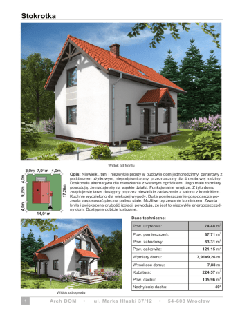 Stokrotka Widok od frontu Opis: Niewielki, tani i niezwykle prosty w budowie dom jednorodzinny, parterowy z poddaszem użytkowym, niepodpiwniczony, przeznaczony dla 4 osobowej rodziny. Doskonała alternatywa dla mieszkania z własnym ogródkiem. Jego małe rozmiary powodują, że nadaje się na wąskie działki. Funkcjonalne wnętrze. Z tyłu domu znajduje się taras dostępny poprzez niewielkie zadaszenie z salonu z kominkiem. Kuchnię wydzielono dla większej wygody. Duże pomieszczenie gospodarcze pozwala zastosować piec na paliwo stałe. Możliwe ogrzewanie kominkiem. Zwarta bryła i zwiększona grubość izolacji powodują, że jest to niezwykle energooszczędny dom. Dostępne odbicie lustrzane. Dane techniczne: Pow. użytkowa: 74,48 m2 Pow. pomieszczeń: 87,71 m2 Pow. zabudowy: 63,31 m2 Pow. całkowita: 121,15 m2 Wymiary domu: 7,91x9,26 m Wysokość domu: 7,88 m Kubatura: 224,57 m3 Pow. dachu: 105,96 m2 Nachylenie dachu: 40° Widok od ogrodu 1 Arch DOM • ul. Marka Hłaski 37/12 • 54 -608 Wrocław ArchDOM Elewacja frontowa Elewacja boczna 1 Rzut parteru Elewacja boczna 2 Rzut poddasza Elewacja ogrodowa Aktualne informacje o technologii i kosztach budowy są dostępne na www.archdom.pl Przekrój tel. 71 / 789 93 39 • www.archdom.pl • [email protected] 2
