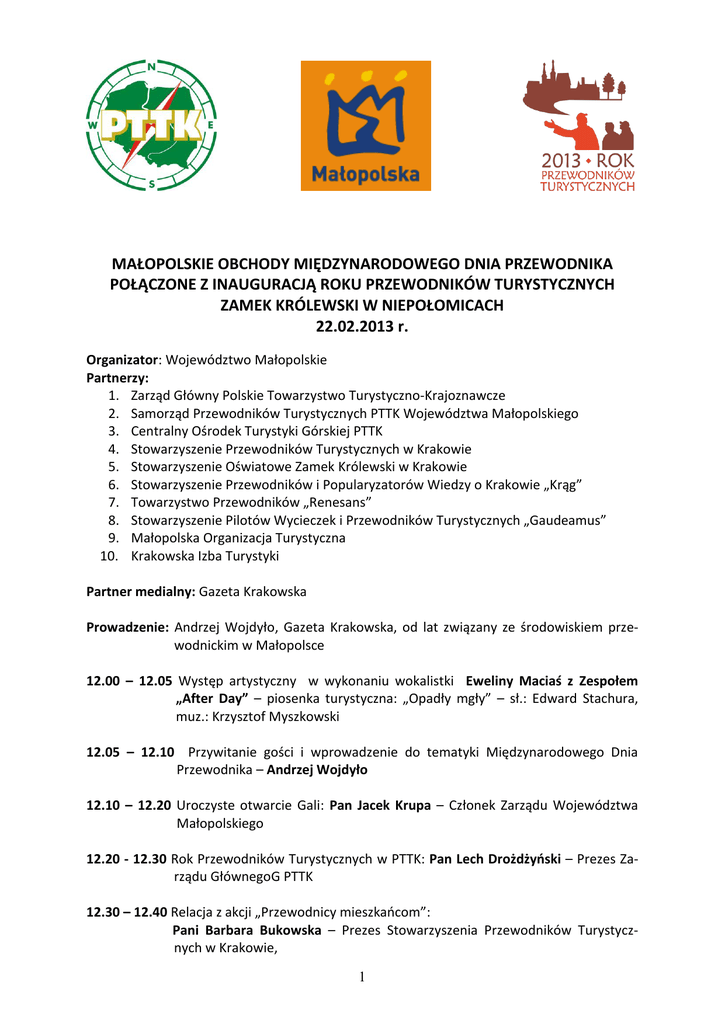 MAŁOPOLSKIE OBCHODY MIĘDZYNARODOWEGO DNIA PRZEWODNIKA POŁĄCZONE Z INAUGURACJĄ ROKU PRZEWODNIKÓW TURYSTYCZNYCH ZAMEK KRÓLEWSKI W NIEPOŁOMICACH 22.02.2013 r. Organizator: Województwo Małopolskie Partnerzy: 1. Zarząd Główny Polskie Towarzystwo Turystyczno-Krajoznawcze 2. Samorząd Przewodników Turystycznych PTTK Województwa Małopolskiego 3. Centralny Ośrodek Turystyki Górskiej PTTK 4. Stowarzyszenie Przewodników Turystycznych w Krakowie 5. Stowarzyszenie Oświatowe Zamek Królewski w Krakowie 6. Stowarzyszenie Przewodników i Popularyzatorów Wiedzy o Krakowie „Krąg” 7. Towarzystwo Przewodników „Renesans” 8. Stowarzyszenie Pilotów Wycieczek i Przewodników Turystycznych „Gaudeamus” 9. Małopolska Organizacja Turystyczna 10. Krakowska Izba Turystyki Partner medialny: Gazeta Krakowska Prowadzenie: Andrzej Wojdyło, Gazeta Krakowska, od lat związany ze środowiskiem przewodnickim w Małopolsce 12.00 – 12.05 Występ artystyczny w wykonaniu wokalistki Eweliny Maciaś z Zespołem „After Day” – piosenka turystyczna: „Opadły mgły” – sł.: Edward Stachura, muz.: Krzysztof Myszkowski 12.05 – 12.10 Przywitanie gości i wprowadzenie do tematyki Międzynarodowego Dnia Przewodnika – Andrzej Wojdyło 12.10 – 12.20 Uroczyste otwarcie Gali: Pan Jacek Krupa – Członek Zarządu Województwa Małopolskiego 12.20 - 12.30 Rok Przewodników Turystycznych w PTTK: Pan Lech Drożdżyoski – Prezes Zarządu GłównegoG PTTK 12.30 – 12.40 Relacja z akcji „Przewodnicy mieszkaocom”: Pani Barbara Bukowska – Prezes Stowarzyszenia Przewodników Turystycznych w Krakowie, 1 Pan Sławomir Nosek – Prezes Stowarzyszenia i Przewodników Turystycznych „Gaudeamus” Pilotów Wycieczek 12.40 – 12.50 Relacja z akcji „Przewodnicy PTTK dzieciom”: Pani Urszula Orficka – Przewodnicząca Samorządu Przewodników Turystycznych PTTK Województwa Małopolskiego 12.50 – 13.00 Występ artystyczny w wykonaniu Pani Eweliny Maciaś, dwie piosenki: „Majster bieda” – sł.: Wojciech Bellon, muz.: Wojciech Bellon, Wojciech Jarocioski „Na koocu mapy” – sł.: Andrzej Sikorowski, muz.: Jan Hnatowicz 13.00 – 13.20 Wręczenie Odznak Honorowych Ministra Sportu i Turystyki „Za Zasługi dla Turystyki”: Pan Jacek Krupa – członek Zarządu Województwa Małopolskiego (20 osób) 13.20 – 13.45 Wręczenie Dyplomów Marszałka Województwa Małopolskiego za „Wkład w Rozwój i Promocję Turystyki w Małopolsce” wraz z albumami „Smakowanie Małopolski”: Pan Jacek Krupa – członek Zarządu Województwa Małopolskiego (20 osób) 13.45 – 14.05 Występ artystyczny, piosenki w wykonaniu Pani Eweliny Maciaś z Zespołem „Gloria”, sł.: Edward Stachura, muz.: Krzysztof Myszkowski Na bis: „Pejzaże harasymowiczowskie”, sł.: Wojciech Bellon, muz.: Wojciech Bellon; „Jak”, sł.: Edward Stachura, muz.: Krzysztof Myszkowski 14.05 – 14.10 Informacje porządkowe: Andrzej Wojdyło (propozycja wspólnego zdjęcia wyróżnionych i zaproszenie do bufetu oraz do zwiedzania Muzeum) 14.10 – Bufet 14.45 – 15.30 Możliwośd zwiedzania Muzeum Niepołomickiego indywidualnie lub z grupą zorganizowaną z przewodnikiem będącym pracownikiem Muzeum. Gr. I (do 40 osób): przewodnik p. Grażyna Tabak, pracownik Muzeum: Krużganki zamkowe – krótka historia zamku (czas budowy, wizyty królów, architektura), wejście do sal łowieckich – ekspozycja: Myślistwo i trofea (pełnopostaciowe modele dermoplastyczne zwierząt z różnych części świata, oddzielna sala z trofeami afrykaoskimi, wystawa „Afryka 1900”, fotografie Włodzimierza Giełguda, broo myśliwska z XIX w.), przejście do Galerii Sztuki „Sukiennice w Niepołomicach 2” – zgromadzone w 8 salach malarstwo i rzeźba polskich artystów XIX w. ze zbiorów Muzeum Narodowego w Krakowie. Czas trwania 45 min. Dla zainteresowanych możliwośd indywidualnego zwiedzania ekspozycji „Europejskie skarby Muzeum Narodowego” z Muzeum Czartoryskich. w Krakowie. Gr. II (do 40 osób): przewodnik p. Konrad Knapik, pracownik Muzeum. Wejście do Galerii Sztuki „Sukiennice w Niepołomicach 2”, krużganki zamkowe – krótka historia zamku, wejście do sal łowieckich. Czas trwania 45 min. Dla zainteresowanych możliwośd indywidualnego zwiedzania ekspozycji „Europejskie skarby Muzeum Narodowego” z Muzeum Czartoryskich 2 15.30 Wyjazd z Niepołomic 3