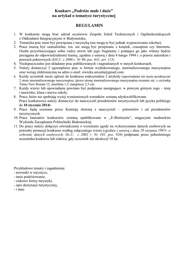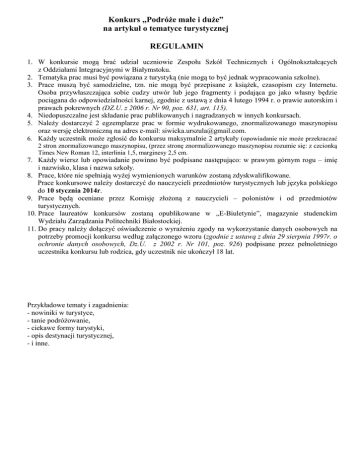 Konkurs „Podróże małe i duże” na artykuł o tematyce turystycznej REGULAMIN 1. W konkursie mogą brać udział uczniowie Zespołu Szkół Technicznych i Ogólnokształcących z Oddziałami Integracyjnymi w Białymstoku. 2. Tematyka prac musi być powiązana z turystyką (nie mogą to być jednak wypracowania szkolne). 3. Prace muszą być samodzielne, tzn. nie mogą być przepisane z książek, czasopism czy Internetu. Osoba przywłaszczająca sobie cudzy utwór lub jego fragmenty i podająca go jako własny będzie pociągana do odpowiedzialności karnej, zgodnie z ustawą z dnia 4 lutego 1994 r. o prawie autorskim i prawach pokrewnych (DZ.U. z 2006 r. Nr 90, poz. 631, art. 115). 4. Niedopuszczalne jest składanie prac publikowanych i nagradzanych w innych konkursach. 5. Należy dostarczyć 2 egzemplarze prac w formie wydrukowanego, znormalizowanego maszynopisu oraz wersję elektroniczną na adres e-mail: [email protected]. 6. Każdy uczestnik może zgłosić do konkursu maksymalnie 2 artykuły (opowiadanie nie może przekraczać 2 stron znormalizowanego maszynopisu, (przez stronę znormalizowanego maszynopisu rozumie się: z czcionką Times New Roman 12, interlinia 1,5, marginesy 2,5 cm. 7. Każdy wiersz lub opowiadanie powinno być podpisane następująco: w prawym górnym rogu – imię i nazwisko, klasa i nazwa szkoły. 8. Prace, które nie spełniają wyżej wymienionych warunków zostaną zdyskwalifikowane. Prace konkursowe należy dostarczyć do nauczycieli przedmiotów turystycznych lub języka polskiego do 10 stycznia 2014r. 9. Prace będą oceniane przez Komisję złożoną z nauczycieli – polonistów i od przedmiotów turystycznych. 10. Prace laureatów konkursów zostaną opublikowane w „E-Biuletynie”, magazynie studenckim Wydziału Zarządzania Politechniki Białostockiej. 11. Do pracy należy dołączyć oświadczenie o wyrażeniu zgody na wykorzystanie danych osobowych na potrzeby promocji konkursu według załączonego wzoru (zgodnie z ustawą z dnia 29 sierpnia 1997r. o ochronie danych osobowych, Dz.U. z 2002 r. Nr 101, poz. 926) podpisane przez pełnoletniego uczestnika konkursu lub rodzica, gdy uczestnik nie ukończył 18 lat. Przykładowe tematy i zagadnienia: - nowiniki w turystyce, - tanie podróżowanie, - ciekawe formy turystyki, - opis destynacji turystycznej, - i inne.