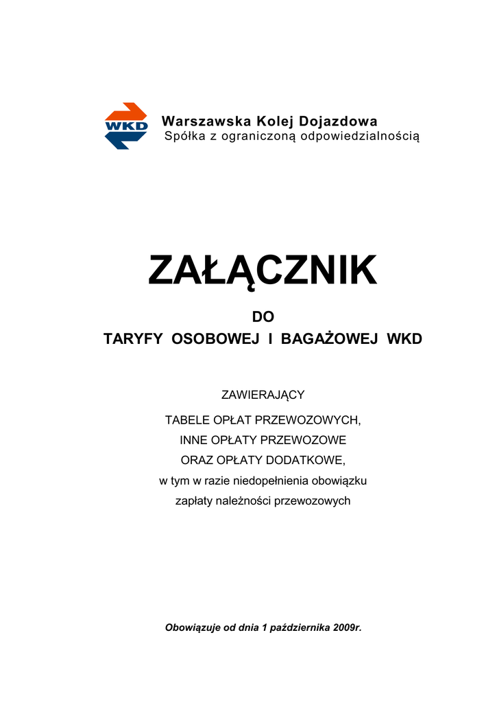 Warszawska Kolej Dojazdowa Spółka z ograniczoną odpowiedzialnością ZAŁĄCZNIK DO TARYFY OSOBOWEJ I BAGAŻOWEJ WKD ZAWIERAJĄCY TABELE OPŁAT PRZEWOZOWYCH, INNE OPŁATY PRZEWOZOWE ORAZ OPŁATY DODATKOWE, w tym w razie niedopełnienia obowiązku zapłaty należności przewozowych Obowiązuje od dnia 1 października 2009r. ZMIANY Nr. porz. 1 2 3 4 5 6 7 8 9 10 11 12 Zmiana wynika z Uchwały Zarządu „ Warszawska Kolej Dojazdowa” Sp. z o.o., Data Nr Poz. Uchwała nr 36a/2008 z dn. 4 września 2008r w sprawie zmiany nazwy Spółki Uchwała nr 32/2009 z dn. 10 sierpnia 2009r w sprawie zatwierdzenia zmiany Załącznika do TOB WKD Uchwała nr 41/2010 z dn. 29 września 2010r w sprawie wprowadzenia zmian do TOB WKD, Załącznika do TOB WKD oraz RPOWKD W związku ze zmianą stawki podatku VAT i zmianą ustawy z dnia 20 czerwca 1992 r. o uprawnieniach do ulgowych przejazdów środkami publicznego transportu zbiorowego Uchwała nr 63/2010 z dn. 21 grudnia 2010r w sprawie wprowadzenia podwyżki cen biletów okresowych na przejazd pociągami WKD Zmiana nr 3 wynika z Uchwały Zarządu WKD nr 31/2011 z dn. 20 września 2011r w sprawie wprowadzenia zmian do TOB WKD oraz Załącznika do TOB WKD Zmiana nr 4 wynika z Uchwały Zarządu WKD nr 31/2011 z dn. 20 września 2011r w sprawie wprowadzenia zmian do TOB WKD oraz Załącznika do TOB WKD Zmiana nr 5 wynika z Uchwały Zarządu WKD nr 33/2011 z dn. 5 października 2011r w sprawie wprowadzenia zmian do Załącznika do TOB WKD Zmiana wynika z Uchwały Zarządu WKD nr 61/2012 z dn. 4 grudnia 2012r w sprawie zmiany Uchwały nr 44/2012 z dn. 25 września 2012r w sprawie wprowadzenia podwyżki biletów okresowych na przejazd pociągiem WKD Zmiana wynika z Uchwały Zarządu WKD nr 43 /2013 z dn. 1 października 2013r w sprawie zatwierdzenia zmiany do Taryfy osobowej i bagażowej WKD Zmiana wynika z Uchwały Zarządu WKD nr 6/2014 z dn. 4 lutego 2014r. w sprawie zatwierdzenia zmiany w Taryfie osobowej i bagażowej WKD oraz w Załączniku do TOB WKD Zmiana wynika z Uchwały Zarządu WKD nr 10/2015 z dn. 17 marca 2015r. w sprawie zatwierdzenia zmiany w Taryfie osobowej i bagażowej WKD oraz w Załączniku do TOB WKD Zmiana obowiązuje od dnia Czytelny podData pis pracownika wniesiewnoszącego nia zmiazmiany ny 4 września 2008r. 1 października 2009r. 1 listopad 2010r. 1 stycznia 2011r. 1 kwietnia 2011r. 1 października 2011r. 1 stycznia 2012r 1 stycznia 2012r 1 stycznia 2013r. 1 października 2013r. 1 marca 2014r. 1 kwietnia 2015r. 13 14 15 16 17 18 UWAGA: Przy wprowadzeniu w tekście taryfy zmiany należy wskazać numer porządkowy wprowadzonej zmiany. 2 SPIS TREŚCI str. Dział I. Tabele opłat przewozowych 1. Tabela opłat za przewóz osób na podstawie biletów jednorazowych strefowych (Tabela nr 1) .................................................................................. 5 2. Tabela opłat za przewóz osób na podstawie biletu miejskiego z ulgą handlową 45% (Tabela nr 2) ............................................................................ 5 Informacje o ulgach – bilety jednorazowe ........................................................... 6 3. Tabele opłat za przewóz osób na podstawie biletów okresowych 1) Tabele opłat za bilety odcinkowe tygodniowe imienne (Tabela nr 3 i 4) .......... 7 2) Tabele opłat za bilety odcinkowe dwutygodniowe imienne (Tabela nr 5 i 6) .... 8 3) Tabele opłat za bilety odcinkowe miesięczne imienne (Tabela nr 7 - 14)......... 9 4) Tabele opłat za bilety odcinkowe kwartalne imienne (Tabela nr 15 i 16) .........13 5) Tabele opłat za bilety odcinkowe bezimienne (Tabela nr 17 i 18) .................. 14 6) Tabela opłat za przewóz osób na podstawie biletów abonamentowych (Tabela nr 19) ...................................................................................................15 7) Tabela opłat za bilety odcinkowe bezimienne weekendowe miesięczne (Tabela nr 20) ..................................................................................................16 Informacje o ulgach – bilety miesięczne ............................................................. 13 4. Tabele opłat za przewóz rzeczy 1) Tabela opłat za przewóz rzeczy o masie do 30 kg pod opieką podróżnego oraz za przewóz roweru/wózka dziecięcego (Tabela nr 21) .......................... 17 2) Tabela opłat miesięcznych za przewóz roweru/wózka dziecięcego (Tabela nr 22) ................................................................................................ 17 3) Tabela opłat miesięcznych za przewóz psa (Tabela nr 23) .......................... 17 Dział II. Inne opłaty przewozowe .................................................................... 18 Dział III. Wykaz opłat dodatkowych ................................................................. 19 Dział IV. Opłaty dodatkowe w razie niedopełnienia obowiązku zapłaty należności przewozowych ......................................................................21 Uwaga: 1) wszystkie opłaty przewozowe i dodatkowe zawarte w niniejszym Załączniku zaokrągla się do pełnych groszy, 2) kwotę PTU kasjer ustala w sposób następujący: suma wartości sprzedaży brutto x stawka podatku (8 lub 23) 100 + stawka podatku (8 lub 23) w złotych, z dokładnością do jednego grosza. Należność netto równa się różnicy kwoty brutto i ustalonego PTU. 3 Dział I. TABELE OPŁAT PRZEWOZOWYCH 4 Tabela nr 1 1. Tabela opłat za przewóz osób na podstawie biletów jednorazowych strefowych czasowych 12 0 Strefa czasowa rozkładowego czasu przejazdu I strefa czasowa – do 19 minut od chwili skasowania Cena brutto – do 38 minut od chwili skasowania N 33% 37% 49% 50% 51% 78% 85% 93% 95% N 33% 37% 49% 50% 51% 78% 85% 93% 95% Bilet sprzedawany przez maszynistę III strefa czasowa – powyżej 38 minut od chwili skasowania Cena netto w złotych Bilet sprzedawany przez maszynistę II strefa czasowa PTU 8% Według taryfy N 33% 37% 49% 50% 51% 78% 85% 93