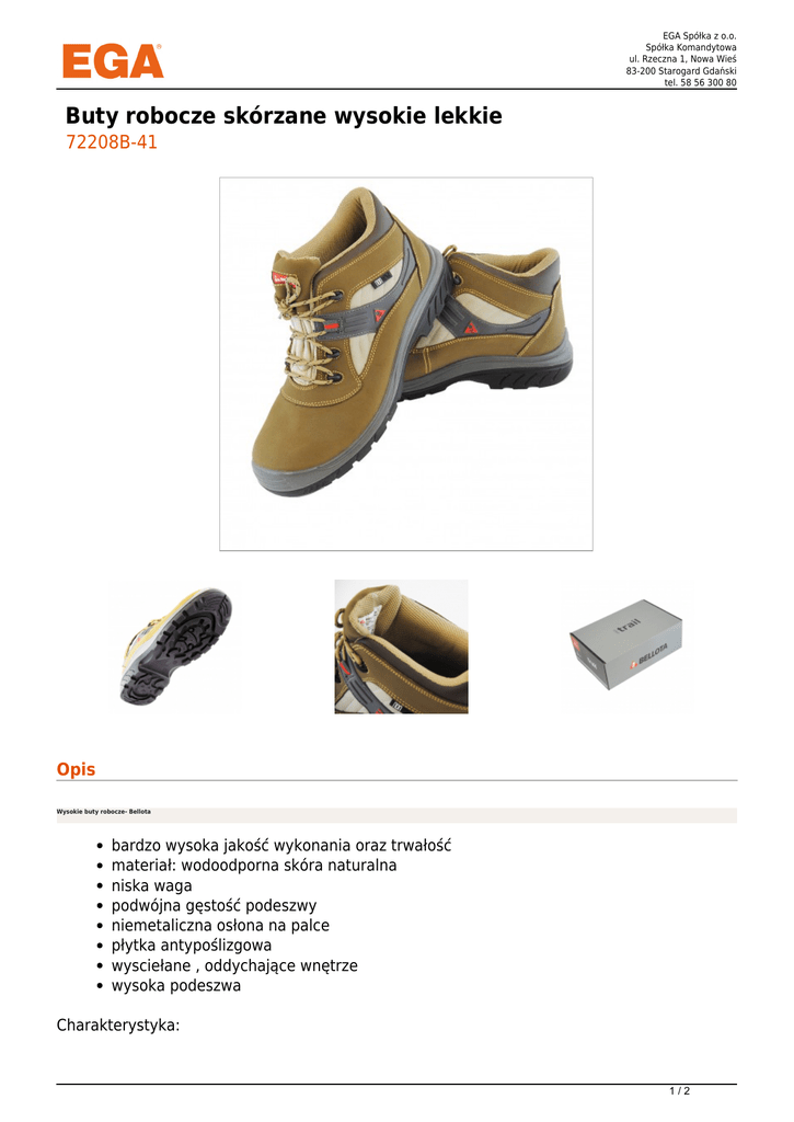 EGA Spółka z o.o. Spółka Komandytowa ul. Rzeczna 1, Nowa Wieś 83-200 Starogard Gdański tel. 58 56 300 80 Buty robocze skórzane wysokie lekkie 72208B-41 Opis Wysokie buty robocze- Bellota bardzo wysoka jakość wykonania oraz trwałość materiał: wodoodporna skóra naturalna niska waga podwójna gęstość podeszwy niemetaliczna osłona na palce płytka antypoślizgowa wysciełane , oddychające wnętrze wysoka podeszwa Charakterystyka: 1/2 EGA Spółka z o.o. Spółka Komandytowa ul. Rzeczna 1, Nowa Wieś 83-200 Starogard Gdański tel. 58 56 300 80 Do użytku profesjonalnego Pakowanie Jednostkowe Karton: szt. Warianty Lp. Nr katalogowy EAN Rozmiar 1 72208B-41 72208B-41 41 2 72208B-42 72208B-42 42 3 72208B-43 72208B-43 43 4 72208B-44 72208B-44 44 5 72208B-46 72208B-46 46 6 72208B-45 45 7 72208B-47 47 2/2 Powered by TCPDF (www.tcpdf.org)
