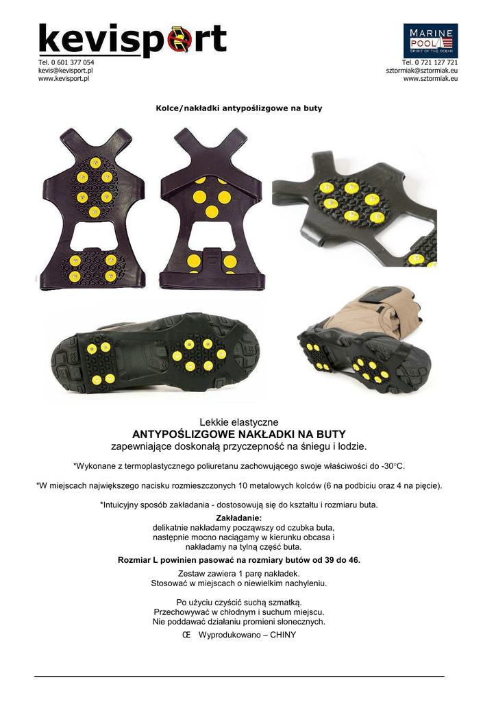 Tel. 0 601 377 054 [email protected] www.kevisport.pl Tel. 0 721 127 721 [email protected] www.sztormiak.eu Kolce/nakładki antypoślizgowe na buty Lekkie elastyczne ANTYPOŚLIZGOWE NAKŁADKI NA BUTY zapewniające doskonałą przyczepność na śniegu i lodzie. *Wykonane z termoplastycznego poliuretanu zachowującego swoje właściwości do -30°C. *W miejscach największego nacisku rozmieszczonych 10 metalowych kolców (6 na podbiciu oraz 4 na pięcie). *Intuicyjny sposób zakładania - dostosowują się do kształtu i rozmiaru buta. Zakładanie: delikatnie nakładamy począwszy od czubka buta, następnie mocno naciągamy w kierunku obcasa i nakładamy na tylną część buta. Rozmiar L powinien pasować na rozmiary butów od 39 do 46. Zestaw zawiera 1 parę nakładek. Stosować w miejscach o niewielkim nachyleniu. Po użyciu czyścić suchą szmatką. Przechowywać w chłodnym i suchum miejscu. Nie poddawać działaniu promieni słonecznych. Œ Wyprodukowano – CHINY
