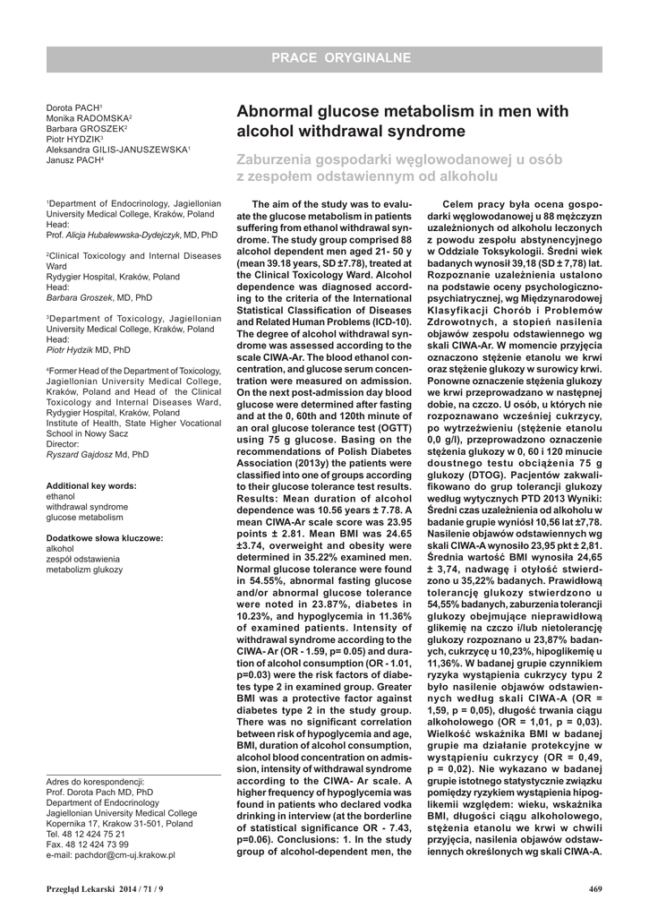 PRACE ORYGINALNE Dorota Pach1 Monika Radomska2 Barbara Groszek2 Piotr Hydzik3 Aleksandra Gilis-Januszewska1 Janusz Pach4 Abnormal glucose metabolism in men with alcohol withdrawal syndrome Department of Endocrinology, Jagiellonian University Medical College, Kraków, Poland Head: Prof. Alicja Hubalewwska-Dydejczyk, MD, PhD The aim of the study was to evaluate the glucose metabolism in patients suffering from ethanol withdrawal syndrome. The study group comprised 88 alcohol dependent men aged 21- 50 y (mean 39.18 years, SD ±7.78), treated at the Clinical Toxicology Ward. Alcohol dependence was diagnosed according to the criteria of the International Statistical Classification of Diseases and Related Human Problems (ICD-10). The degree of alcohol withdrawal syndrome was assessed according to the scale CIWA-Ar. The blood ethanol concentration, and glucose serum concentration were measured on admission. On the next post-admission day blood glucose were determined after fasting and at the 0, 60th and 120th minute of an oral glucose tolerance test (OGTT) using 75 g glucose. Basing on the recommendations of Polish Diabetes Association (2013y) the patients were classified into one of groups according to their glucose tolerance test results. Results: Mean duration of alcohol dependence was 10.56 years ± 7.78. A mean CIWA-Ar scale score was 23.95 points ± 2.81. Mean BMI was 24.65 ±3.74, overweight and obesity were determined in 35.22% examined men. Normal glucose tolerance were found in 54.55%, abnormal fasting glucose and/or abnormal glucose tolerance were noted in 23.87%, diabetes in 10.23%, and hypoglycemia in 11.36% of examined patients. Intensity of withdrawal syndrome according to the CIWA- Ar (OR - 1.59, p= 0.05) and duration of alcohol consumption (OR - 1.01, p=0.03) were the risk factors of diabetes type 2 in examined group. Greater BMI was a protective factor against diabetes type 2 in the study group. There was no significant correlation between risk of hypoglycemia and age, BMI, duration of alcohol consumption, alcohol blood concentration on admission, intensity of withdrawal syndrome according to the CIWA- Ar scale. A higher frequency of hypoglycemia was found in patients who declared vodka drinking in interview (at the borderline of statistical significance OR - 7.43, p=0.06). Conclusions: 1. In the study group of alcohol-dependent men, the 1 Clinical Toxicology and Internal Diseases Ward Rydygier Hospital, Kraków, Poland Head: Barbara Groszek, MD, PhD 2 Department of Toxicology, Jagiellonian University Medical College, Kraków, Poland Head: Piotr Hydzik MD, PhD 3 Former Head of the Department of Toxicology, Jagiellonian University Medical College, Kraków, Poland and Head of the Clinical Toxicology and Internal Diseases Ward, Rydygier Hospital, Kraków, Poland Institute of Health, State Higher Vocational School in Nowy Sacz Director: Ryszard Gajdosz Md, PhD 4 Additional key words: ethanol withdrawal syndrome glucose metabolism Dodatkowe słowa kluczowe: alkohol zespół odstawienia metabolizm glukozy Adres do korespondencji: Prof. Dorota Pach MD, PhD Department of Endocrinology Jagiellonian University Medical College Kopernika 17, Krakow 31-501, Poland Tel. 48 12 424 75 21 Fax. 48 12 424 73 99 e-mail: [email protected] Przegląd Lekarski 2014 / 71 / 9 Zaburzenia gospodarki węglowodanowej u osób z zespołem odstawiennym od alkoholu Celem pracy była ocena gospodarki węglowodanowej u 88 mężczyzn uzależnionych od alkoholu leczonych z powodu zespołu abstynencyjnego w Oddziale Toksykologii. Średni wiek badanych wynosił 39,18 (SD ± 7,78) lat. Rozpoznanie uzależnienia ustalono na podstawie oceny psychologicznopsychiatrycznej, wg Międzynarodowej Klasyfikacji Chorób i Problemów Zdrowotnych, a stopień nasilenia objawów zespołu odstawiennego wg skali CIWA-Ar. W momencie przyjęcia oznaczono stężenie etanolu we krwi oraz stężenie glukozy w surowicy krwi. Ponowne oznaczenie stężenia glukozy we krwi przeprowadzano w następnej dobie, na czczo. U osób, u których nie rozpoznawano wcześniej cukrzycy, po wytrzeźwieniu (stężenie etanolu 0,0 g/l), przeprowadzono oznaczenie stężenia glukozy w 0, 60 i 120 minucie doustnego testu obciążenia 75 g glukozy (DTOG). Pacjentów zakwalifikowano do grup tolerancji glukozy według wytycznych PTD 2013 Wyniki: Średni czas uzależnienia od alkoholu w badanie grupie wyniósł 10,56 lat ±7,78. Nasilenie objawów odstawiennych wg skali CIWA-A wynosiło 23,95 pkt ± 2,81. Średnia wartość BMI wynosiła 24,65 ± 3,74, nadwagę i otyłość stwierdzono u 35,22% badanych. Prawidłową tolerancję glukozy stwierdzono u 54,55% badanych, zaburzenia tolerancji glukozy obejmujące nieprawidłową glikemię na czczo i/lub nietolerancję glukozy rozpoznano u 23,87% badanych, cukrzycę u 10,23%, hipoglikemię u 11,36%. W badanej grupie czynnikiem ryzyka wystąpienia cukrzycy typu 2 było nasilenie objawów odstawiennych według skali CIWA-A (OR = 1,59, p = 0,05), długość trwania ciągu alkoholowego (OR = 1,01, p = 0,03). Wielkość wskaźnika BMI w badanej grupie ma działanie protekcyjne w wystąpieniu cukrzycy (OR = 0,49, p = 0,02). Nie wykazano w badanej grupie istotnego statystycznie związku pomiędzy ryzykiem wystąpienia hipoglikemii względem: wieku, wskaźnika BMI, długości ciągu alkoholowego, stężenia etanolu we krwi w chwili przyjęcia, nasilenia objawów odstawiennych określonych wg skali CIWA-A. 469 risk of diabetes was inversely proportional to BMI value. 2. The risk factors of type 2 diabetes in the alcohol-dependent group included the duration of lasting alcohol drinking and the intensity of withdrawal symptoms according to the CIWA- Ar scale. 3. According to the preference of alcohol type, a higher frequency of hypoglycemia was confirmed only in persons preferring to drink vodka. Introduction The U shaped relationship between daily ethanol consumption and the risk of abnormal glucose metabolism and type 2 diabetes 
