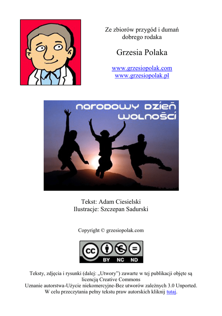 Ze zbiorów przygód i dumań dobrego rodaka Grzesia Polaka www.grzesiopolak.com www.grzesiopolak.pl Tekst: Adam Ciesielski Ilustracje: Szczepan Sadurski Copyright © grzesiopolak.com Teksty, zdjęcia i rysunki (dalej: „Utwory”) zawarte w tej publikacji objęte są licencją Creative Commons Uznanie autorstwa-Użycie niekomercyjne-Bez utworów zależnych 3.0 Unported. W celu przeczytania pełny tekstu praw autorskich kliknij tutaj. Narodowy Dzień Wolności grzesiopolak.com Nieoczekiwanie, władza dała społeczeństwu swobodę całkowitą na 24 godziny: Prezydent ogłosił Narodowy Dzień Wolności! Kacelaria Prezydenta Dla każdego rezydenta Dała szansę niepomierną W te jedyne w sobie święto. Na bok normy i kanony! Kodeks prawny zawieszony! Pierwszy raz w historii globu Cała wolność dla narodu! Jedna tylko jest zasada Która dzisiaj moc posiada: Nie rób nic bliźniemu swemu Co niemiłe ci samemu. Narodowy Dzień Wolności Pełen śmiechu i radości! W końcu ludziom zaufano I swobodę pełną dano! Co kto pragnie może robić I jakkolwiek się wysłowić. Jest surowo zakazane Strofowanie czy karanie. Konwenanse, zarządzenia, Wzory, akty, pouczenia Religijne czy formalne Uchylone oficjalnie. 1 Narodowy Dzień Wolności grzesiopolak.com Prawdy nigdy nie dojdziemy Gdy w przepisach wręcz toniemy. Skasowanie regulacji Da nam poznać siłę nacji! Narodowy Dzień Wolności Pełen marzeń i błogości! Każdy człowiek w naszym kraju W samostanowienia raju! Jak przystało na lidera Wpierw prezydent głos zabiera. Zaczął drżący postulować Siły zbrojne zlikwidować! Obce wpływy nim władały Wypowiedzieć się nie dały. Fakt to przecież jest wiadomy: My zbyt biedni na Falcony! Niepotrzebne nam rakiety, Jakieś tarcze czy gadżety: Tu pieniędzy NA TO nie ma, Bo szpitali więcej trzeba! Narodowy Dzień Wolności Pełen sensu i mądrości! Dziś wierzymy tylko w siebie I czujemy się jak w niebie! Przedszkolaki w każdym mieście Zęby pokazały wreszcie Miały pomysł zgoła nowy: Po co komu samochody?! 2 Narodowy Dzień Wolności grzesiopolak.com Drogie, smrodzą, hałaśliwe, Robią korki niemożliwe. Wszakże zdrowiej jest rowerkiem Lub do pracy pójść spacerkiem! Już rączkami wymachują I ruch miejski zatrzymują: Na ulice się wdzierają; Place zabaw urządzają! Narodowy Dzień Wolności Pełen treści i słuszności! Dziś ostatni są pierwszymi, A najmniejsi - największymi! 3 Narodowy Dzień Wolności grzesiopolak.com Instytucje finansowe Odkrywają karty swoje I uczciwie oświadczają, Że kredyty ujarzmiają! Kalkulacje przedstawiają, Które ludzi osłupiają: Cały kraj pracuje po to, By pieniądze rzucić w błoto! „Wierzcie w siły narodowe Nie w kartele walutowe! Nie pożyczaj, a uzbieraj I się jeńcem zrobić nie daj!” Narodowy Dzień Wolności Pełen troski i szczerości! Autentyczna niepodległość: Od wszystkiego niezależność! Konsumenci odzieżowi Projekt mieli przełomowy: Zapragnęli, by ubrania Były bez oznakowania! Żadnych marek, nazw firmowych, Żadnych sztuczek reklamowych: Ciuchy to nie obwieszczenia Lecz odzienie do noszenia! Zamiar kupna podejmiemy Podług kroju, klasy, ceny. Nie będziemy klientami Dla handlarzy fetyszami! 4 Narodowy Dzień Wolności grzesiopolak.com Narodowy Dzień Wolności Pełen racji i prawości! Niezawisłość, wyzwolenie I myślowe odrodzenie! Inicjatyw całe tony: Kraj na głowie postawiony! Wierni dziś kazania prawią I swych księży spowiadają! Ci, co palą papierosy, Muszą wciągać dym przez nosy! W szkołach dzieci wykładają, Belfry zaś klasówkę mają! Ktoś dowodzi - Einstein wariat: Nie m-c, lecz c-m kwadrat! Wszystkie przednie restauracje Karmią darmo populację! Narodowy Dzień Wolności Pełen wsparcia i sielskości! Bez nadzoru i kontroli: Zaufajmy dobrej woli! Lecz dla wielu ta swoboda To okropna jest przeszkoda: Autonomię otrzymali, Lecz się jej panicznie bali… Z strukturami się stopili: Wiarę w siebie potracili. Bez dyrektyw i systemu Nie umieją znaleźć celu… 5 Narodowy Dzień Wolności grzesiopolak.com Dziwnie świat jest urządzony Zniewalając wręcz miliony. Tu pies leży pogrzebany: Przecież sami wybieramy… Narodowy Dzień Wolności Szansę daj swej logiczności, Bo inaczej szczęścia eden Zazna tylko… procent jeden… Adam Ciesielski (ur. 1964) jest lekarzem, pracującym obecnie w Kapsztadzie, RPA. Egzystencja w izolacji od Polski nauczyła go ufaniu wewnętrznym instynktom oraz wiary w siebie. Dzieli się swoimi emigracyjnymi wrażeniami, doświadczeniami z tytułu wychowania syna poza granicami kraju, przygodami z lat młodości i swoistą filozofią życia na witrynie „Nierówna walka z naturą” - GrzesioPolak.com - gdzie można poczytać satyryczno-filozoficzne teksty jego autorstwa. 6