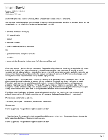 Imam Bayldi Dodano: 2000-01-01 00:00:00 Język: Polski Odwiedzono: 1411 razy. znakomity przepis z kuchni tureckiej, ktora uwazam za bardzo zdrowa i smaczna. Ale najpierw mala legenda o tym przepisie. Pewnego dnia imam dostal na obiat ta potrawe, ktora mu tak smakowala, ze nie mogl sie oderwac od jedzenia az zemdlal. 4 sredniej wielkosci oberzyny 1 1/2 sklanki oleju 4 cebuli 5 zabkow czosnku 2 lyzki posiekanej swiezej pietruszki Sol 1 lyzeczka mocnej papryki w proszku 1 pomidor 4 peperoni (bardzo ostra zielona papryka) ale mozna i bez niej. Oberzyny wymyc i obciac zielona koncowke. Paskami wzdluz obrac ze skorki ma to wygladac jak zebra (mozna sie obejsc i bez tego, ale wtedy trzeba widelcem pokluc cala oberzyne. Z tam ze w paski wyglada ladniej, a jak wiadomo - oczy jedza razem z nami) Z jednej strony zrobic glebokie naciecie, ale nie nawylot. Nozem, albo widelcem troche pokluc w miejscach obrannych. Potrzebne to dlatego azeby oberzyna nasiakla olejem i mieso wtedy bedzie lepiej trawne. W patelni nagrac 1 szklanke oleju i obsmazyc oberzyny ze wszystkish stron w ciagu 2 min. Cebule obrac przekroic wpol i pokrajac w bardzo cienkie poltalarki. Czosnek tez obrac i pokrajac w paski. Pozostaly olej nagrzac na patelni i poddusic cebule i czosnek. Dodac pietruszke, sol i papryke w proszku. Nagrac piekarnik do temp. 180 st.C. Oberzyny ulozyc w naoliwionej patelni, albo innym naczyniu. Trzeba uwazac azeby szlic znajdowal sie u gory. Palcami mocno poglebic te szlicy uwazajac azeby uszkodzic scianek albo dna. W te wglebienia umiescic mieszanlke cebulowa. Pomidory umyc i pokrajac w plastry, peperoni przekroic wzdluz. Na kazda oberzyne polozyc po 2 polowki peperoni i po 1-2 plastra pomidorow. W naczynie dodac pol szklanki wody i troche soli. Postawic do piekarnika na 20 min. Zaczekac jak ostynie i smakowac, smakowac, smakowac. Smacznego From: Eugeniusz <[email protected]> Wedlug Ireny Gumowskiej podaje wszystkie polskie nazwy oberżyny: Gruszka milosna, oberzynka, jajko krzewiste, baklazan (Solanum mellongena). From: Eugeniusz <[email protected]> Wirtualna Kuchni@ Polska - http://kuchnia.now.pl przepis nr 4392, plik wygenerowano 2017.03.08 02:28 1z1
