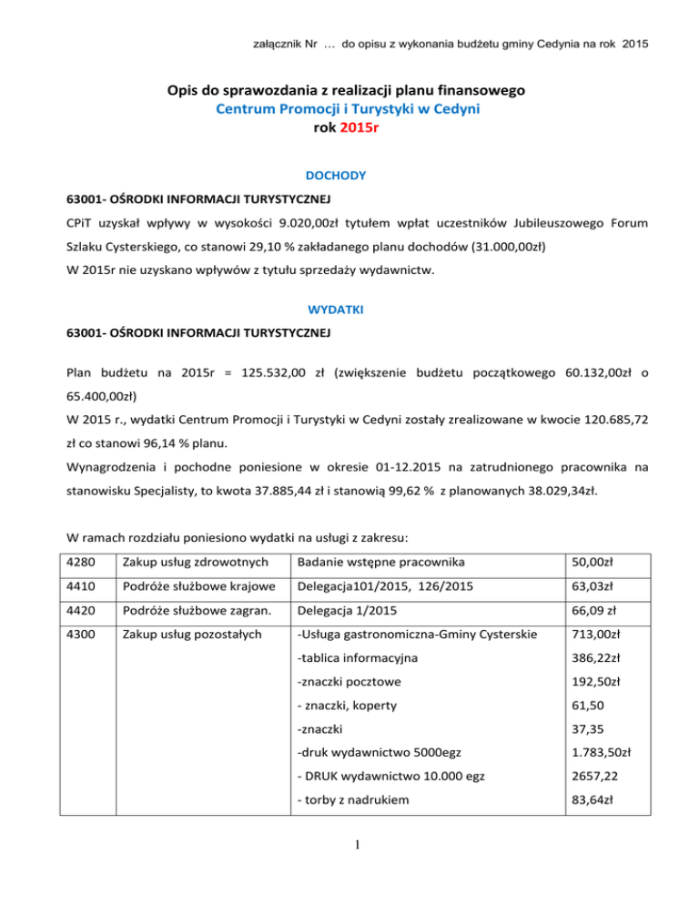 załącznik Nr … do opisu z wykonania budżetu gminy Cedynia na rok 2015 Opis do sprawozdania z realizacji planu finansowego Centrum Promocji i Turystyki w Cedyni rok 2015r DOCHODY 63001- OŚRODKI INFORMACJI TURYSTYCZNEJ CPiT uzyskał wpływy w wysokości 9.020,00zł tytułem wpłat uczestników Jubileuszowego Forum Szlaku Cysterskiego, co stanowi 29,10 % zakładanego planu dochodów (31.000,00zł) W 2015r nie uzyskano wpływów z tytułu sprzedaży wydawnictw. WYDATKI 63001- OŚRODKI INFORMACJI TURYSTYCZNEJ Plan budżetu na 2015r = 125.532,00 zł (zwiększenie budżetu początkowego 60.132,00zł o 65.400,00zł) W 2015 r., wydatki Centrum Promocji i Turystyki w Cedyni zostały zrealizowane w kwocie 120.685,72 zł co stanowi 96,14 % planu. Wynagrodzenia i pochodne poniesione w okresie 01-12.2015 na zatrudnionego pracownika na stanowisku Specjalisty, to kwota 37.885,44 zł i stanowią 99,62 % z planowanych 38.029,34zł. W ramach rozdziału poniesiono wydatki na usługi z zakresu: 4280 Zakup usług zdrowotnych Badanie wstępne pracownika 50,00zł 4410 Podróże służbowe krajowe Delegacja101/2015, 126/2015 63,03zł 4420 Podróże służbowe zagran. Delegacja 1/2015 66,09 zł 4300 Zakup usług pozostałych -Usługa gastronomiczna-Gminy Cysterskie 713,00zł -tablica informacyjna 386,22zł -znaczki pocztowe 192,50zł - znaczki, koperty 61,50 -znaczki 37,35 -druk wydawnictwo 5000egz 1.783,50zł - DRUK wydawnictwo 10.000 egz 2657,22 - torby z nadrukiem 83,64zł 1 załącznik Nr … do opisu z wykonania budżetu gminy Cedynia na rok 2015 4210 Materiały i wyposażenie - Projekt techniczny Gazeta 1 1400,00 - Projekt techniczny Gazeta 2 1400,00 - usługa BHP 105,00 - usługa transportowa Forum Cysterskie 500,00 - wydruk zaproszeń Forum Cysterskie 1775,00 - usługa gastronom. Forum Cysterskie 26700,00 - wynajem Sali Forum Cysterskie 650,00 - usługa hotel. Forum Cysterskie 8064,00 - pokaz strojów hist. EDD 1845,00 - pokaz muzyczny instrum dawne EDD 990,00 - tablica info/baner EDD+ Forum Cysterskie 1180,00 - usługa transportowa Festiwal 316,00 - usługa transportowa Altranft 500,00 - wydruk plakatów Festiwal 1107,00 - zakup publikacji festiwal 300,00 - poczęstunek Festiwal 63,00 - baner Festiwal 420,00 - usługa elektryczna festiwal 430,50 - wynajem ToiToi festiwal 472,92 -Aparat telefoniczny 117,00zł -Tablica informacyjna 361,62zł - drukarka Canon 329,00 -Olej rzepakowy 162,00zł -Miód Pasieka Jana 250,00zł -koperty 52,00zł -Materiały biurowe 173,33zł - materiały biurowe 363,34 - papier dyplomy 61,99 -Torby reklamowe kartonowe 200szt 1.248,57 - poczęstunek Gminy Cysterskie 77,37 -torba ekologiczna reklamowa 150szt 1813,64 -buttony EDD 200szt 355,00 2 załącznik Nr … do opisu z wykonania budżetu gminy Cedynia na rok 2015 4300 4170 Usługi pozostałe Podatek od publikacji -pendrive z logo 150szt 3201.69 - miód Cedyński 110szt 1360,00 - olej Cedyński 100szt 1500,00 - ekran projekcyjny 738,00 - wiązanka okolicznościowa 200,00 - tonery do drukarki kpl 364,39 Reklama Informator ZART 1845,00 Księga znaku+ festiwal 8000,00 Prezentacja AŻ PO MORZE 738,00zł Reklama AGORA 1476,00 Reklama Gazeta wyborcza 369,00 Ogłoszenie prasowe 147,60 Wydruk kalendarzy 1.000szt 4716,00 Wydruk kart świątecznych 300szt 1156,20 Umowa o dzieło-projekt, skład gazety 3.215,00 Opis Jednostki 1. Centrum Promocji i Turystyki w Cedyni jest jednostką organizacyjną gminy, nie posiadającą osobowości prawnej, prowadzącą gospodarkę finansową w formie jednostki budżetowej 2. Cel utworzenia: wykonywanie zadań własnych Gminy Cedynia w zakresie promocji i turystyki 3. Jednostka funkcjonuje na podstawie: a) ustawy z dnia 8 marca 1990r o samorządzie gminnym (Dz.U 2013.594 ) b) ustawy z dnia 27 sierpnia 2009r o finansach publicznych (Dz.U. 2013.885) c) statutu uchwalonego Uchwałą Rady Miejskiej w Cedyni nr IV/14/2015 z dnia 21 stycznia 2015r w sprawie utworzenia Centrum Promocji i Turystyki w Cedyni d) Regulaminu Wynagradzania Pracowników CPiT, Zarządzenie Burmistrza Cedyni nr 32/2015 z dnia 25.02.2015r e) Regulaminu Organizacyjnego, Zarządzenie Burmistrza Cedyni nr 195/2015 z dnia 14.12.2015r 4. zakres działania: Gmina Cedynia, w kraju i za granicą 3 załącznik Nr … do opisu z wykonania budżetu gminy Cedynia na rok 2015 5. Stan zatrudnienia: 1 osoba (1 cały etat) – stanowisko: specjalista (umowa od 07.04.2015r) Siedziba: 74-520 Cedynia, Plac Wolności 8, tel. 91-4144406 wew. 127, [email protected], [email protected] 6. Numer identyfikacyjny REGON: 360798387 7. Rodzaj działalności wg PKD: 7911B – działalność pośredników turystycznych 8. Wyposażenie biura: biurko, krzesło ISO (3szt), segment „basia”(1kpl), zestaw mebli (1kpl), aparat telefoniczny Gigaset A130, drukarka Canon MG5500 (1szt) Zrealizowane zadania w roku 2015 1. opracowanie planu promocji Gminy Cedynia 2. opracowanie Regulaminu Organizacyjnego CPiT 3. prowadzenie Gminnej ewidencji obiektów hotelarskich, wg ustawy o usługach turystycznych z dnia 29.08.1997, Dz. U. z dnia 29.10.1997, oraz Rozporządzenia Ministra Gospodarki i Pracy z dnia 19 sierpnia 2004 r (Dz.U.2013.1113), : korespondencja, wyjaśnienia, opracowanie formularza zgłoszeniowego dla podmiotów. 4. Przygotowywanie treści przemówień, podziękowań, listów gratulacyjnych, dyplomów, etc., w tym zgłoszenia do nagród Bociany 2015 –nagroda Starosty Gryfińskiego. 5. Przygotowywanie informacji prasowych Urzędu Miejskiego w Cedyni 6. Materiały promocyjne: a) przygotowanie projektu torby reklamowej Gminy Cedynia (wykonanie 200szt torba kartonowa lakierowana biała A4 z logo Cedynia na okragło) b) przygotowanie projektu Torby reklamowej Gminy Cedynia-, torba materiałowa ekologiczna A4 z logo Cedynia na okrągło, wykonanie 150 sztuk c) przygotowanie projektu pendrive 4 GB z logo Cedynia na okragło, wykonanie 150 sztuk d) zakup 100 szt oleju (poj 1L) w celach promocji Olej rzepakowy z Cedyni (Vida Natura) e) zakup 100 szt miodu (poj 0,5kg) w ce