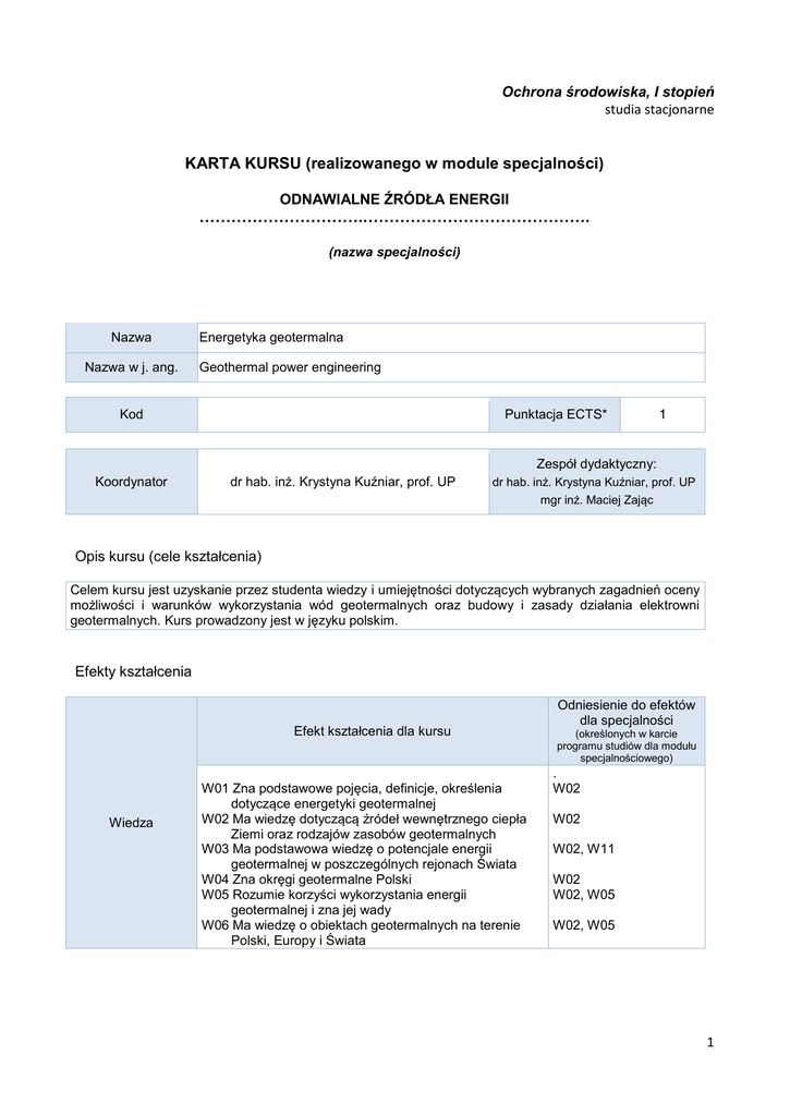Ochrona środowiska, I stopień studia stacjonarne KARTA KURSU (realizowanego w module specjalności) ODNAWIALNE ŹRÓDŁA ENERGII ………………………….……………………………………. (nazwa specjalności) Nazwa Nazwa w j. ang. Energetyka geotermalna Geothermal power engineering Kod Punktacja ECTS* 1 Zespół dydaktyczny: Koordynator dr hab. inż. Krystyna Kuźniar, prof. UP dr hab. inż. Krystyna Kuźniar, prof. UP mgr inż. Maciej Zając Opis kursu (cele kształcenia) Celem kursu jest uzyskanie przez studenta wiedzy i umiejętności dotyczących wybranych zagadnień oceny możliwości i warunków wykorzystania wód geotermalnych oraz budowy i zasady działania elektrowni geotermalnych. Kurs prowadzony jest w języku polskim. Efekty kształcenia Efekt kształcenia dla kursu Wiedza W01 Zna podstawowe pojęcia, definicje, określenia dotyczące energetyki geotermalnej W02 Ma wiedzę dotyczącą źródeł wewnętrznego ciepła Ziemi oraz rodzajów zasobów geotermalnych W03 Ma podstawowa wiedzę o potencjale energii geotermalnej w poszczególnych rejonach Świata W04 Zna okręgi geotermalne Polski W05 Rozumie korzyści wykorzystania energii geotermalnej i zna jej wady W06 Ma wiedzę o obiektach geotermalnych na terenie Polski, Europy i Świata Odniesienie do efektów dla specjalności (określonych w karcie programu studiów dla modułu specjalnościowego) . W02 W02 W02, W11 W02 W02, W05 W02, W05 1 Odniesienie do efektów dla specjalności Efekt kształcenia dla kursu Umiejętności (określonych w karcie programu studiów dla modułu specjalność) U01 Potrafi praktycznie rozeznać (m.in. z pomocą specjalistycznych map) potencjał geotermalny w wybranych miejscowościach U02 Analizuje możliwości wykorzystania potencjału zasobów geotermalnych na danym terenie U02, U03, U04 U02, U03, U04 Odniesienie do efektów dla specjalności Efekt kształcenia dla kursu Kompetencje społeczne (określonych w karcie programu studiów dla modułu specjalnościowego) K01 Ma świadomość konieczności oszczędzania energii i szukania alternatywnych jej źródeł K02 Współdziała w zespole w ramach opracowywania zadania praktycznego K01, K02 K03 Organizacja Forma zajęć Ćwiczenia w grupach Wykład (W) A Liczba godzin 10 K L S P E 10 Opis metod prowadzenia zajęć Na zajęcia składa się wykład i ćwiczenia audytoryjne, w ramach których studenci wykonują własne zadania z zakresu praktycznego rozeznania (m.in. z pomocą specjalistycznych map) potencjału geotermalnego w wybranych miejscowościach (w tym również w miejscach zamieszkania studentów) terenu Małopolski oraz możliwości jego wykorzystania. 2 Inne Egzamin pisemny Egzamin ustny x x x x x x Praca pisemna (esej) Udział w dyskusji x x x x x x x x Referat Projekt grupowy x x x x x x x x x x W01 W02 W03 W04 W05 W06 U01 U02 K01 K02 Kryteria oceny Projekt indywidualny Praca laboratoryjna Zajęcia terenowe Ćwiczenia w szkole Gry dydaktyczne E – learning Formy sprawdzania efektów kształcenia x x Ocena końcowa jest średnią z ocen: kolokwium oraz samodzielnej pracy z zakresu praktycznego rozeznania potencjału geotermalnego w wybranych miejscowościach. Uwagi Treści merytoryczne (wykaz tematów) 1. 2. 3. 4. 5. 6. 7. 8. 9. 10. 11. 12. 13. 14. 15. 16. 17. 18. Podstawowe pojęcia, definicje, określenia Źródła wewnętrznego ciepła Ziemi Rodzaje zasobów geotermalnych Podział źródeł energii geotermalnej na grupy ze względu na stan skupienia nośnika ciepła i wysokość temperatury Obszary hipertermiczne Gejzery – źródła energii geotermalnej Zasoby petrotermiczne Roczny potencjał energii geotermalnej w poszczególnych rejonach świata Zasoby energii geotermalnej w Europie Okręgi geotermalne Polski Korzyści wykorzystania energii geotermalnej Wady energii geotermalnej Sposób wykorzystania ciepła geotermalnego w zależności od jego temperatury (diagram Lindal'a) Struktura wykorzystania energii geotermalnej na świecie Schemat wykorzystania energii geotermalnej Sondy ciepła jako odbiorniki energii geotermalnej Wykorzystanie energii geotermalnej i obiekty geotermalne na terenie Polski Naturalne zasoby energii geotermalnej i pole cieplne Górnośląskiego Zagłębia Węglowego oraz możliwości ich wykorzystania 3 Wykaz literatury podstawowej 1. 2. 3. 4. Hrynkiewicz, A. Energia : wyzwanie XXI wieku, Wyd. UJ, Kraków 2002. Lewandowski W. Proekologiczne odnawialne źródła energii, Wyd. Nauk.-Tech., Warszawa 2006. Tytko R., Odnawialne źródła energii: wybrane zagadnienia, Wyd. Deka, Kraków 2008. Cieśliński J., Mikiewicz J., Niekonwencjonalne źródła energii, Wyd. Politechniki Gdańskiej, Gdańsk 1996. Wykaz literatury uzupełniającej 1. Jastrzębska G., Odnawialne żródła energii i pojazdy proekologiczne, Wydawnictwa Naukowo Techniczne , Warszawa 2007. 2. Sadowski T. i inni, Dotacje UE na rozwój odnawialnych źródeł energii w Polsce , Wydawnictwo: Europrimus Consulting 2007. 3. Barbacki A., Atlas zbiorników wód geotermalnych Małopolski, Wyd. Instytutu Gospodarki Surowcami mineralnymi i energią PAN, Kraków 2006. Bilans godzinowy zgodny z CNPS (Całkowity Nakład Pracy Studenta) Ilość godzin zajęć w kontakcie z prowadzącymi Ilość godzin pracy studenta bez kontaktu z prowadzącymi Wykład 10 Konwersatorium (ćwiczenia, laboratorium itd.) 10 Konsultacje indywidualne 1 Uczestnictwo w egzaminie/zaliczeniu 2 Lektura w ramach przygotowania do zajęć 5 Przygotowanie krótkiej pracy pisemnej lub referatu po zapoznaniu się z niezbędną literaturą przedmiotu - Przygotowanie projektu lub prezentacji na podany temat (praca w grupie) 5 Przygotowanie do zaliczenia 5 Ogółem bilans czasu pracy 38 Ilość punktów ECTS w zależności od przyjętego przelicznika 1 4