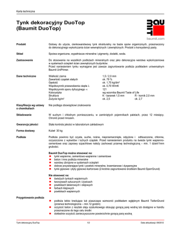 Karta techniczna Tynk dekoracyjny DuoTop (Baumit DuoTop) Produkt Gotowy do użycia, cienkowarstwowy tynk strukturalny na bazie spoiw organicznych, przeznaczony do dekoracyjnego wykończania ścian wewnętrznych i zewnętrznych. Produkt o konsystencji pasty. Skład Spoiwa organiczne, wypełniacze mineralne i pigmenty, dodatki, woda. Zastosowanie Do stosowania na wszelkich podłożach mineralnych oraz jako dekoracyjna warstwa wykończeniowa w systemach ociepleń ścian zewnętrznych budynków. Przed naniesieniem tynku wymagane jest zawsze zagruntowanie podłoża podkładem uniwersalnym Baumit UniPrimer. Dane techniczne Wielkość ziarna Zawartość cząstek stałych Gęstość Współczynnik przewodzenia ciepła λ Współczynnik oporu dyfuzyjnego µ Kolorystyka Struktura Zużycie kg/m2 Klasyfikacja wg ustawy o chemikaliach Nie podlega obowiązkowi znakowania Składowanie W suchym i chłodnym pomieszczeniu, w zamkniętych pojemnikach paletach, przez 12 miesięcy. Chronić przed mrozem. Gwarancja jakości Stała kontrola jakości w laboratorium zakładowym Forma dostawy Kubeł 30 kg Podłoże Podłoże powinno być czyste, suche, nośne, nieprzemarznięte, odpylone i odtłuszczone, chłonne, oczyszczone z wykwitów i luźnych cząstek. Przed naniesieniem produktu na świeże tynki wapiennocementowe oraz zaprawy szpachlowe należy zachować przerwę technologiczną – min. 1 dzień/1mm grubości. 1,5 / 2,0 mm ok. 79 % ok. 1,70 kg/dm3 ok. 0,70 W/mK 121 wg wzornika Baumit Taste of Life K - baranek 1,5 mm R - kornik 2,0 mm ok. 2,5 ok. 2,7 Baumit DuoTop można stosować na: tynki wapienne, cementowo-wapienne i cementowe beton i inne podłoża mineralne warstwy zbrojone w systemach ociepleń dobrze przywierające tynki i powłoki mineralne, krzemianowe i dyspersyjne tynki gipsowe i płyty gipsowo-kartonowe (2-krotnie zagruntowane środkiem Baumit SperrGrund) Nie stosować na: świeżych tynkach wapiennych tworzywach sztucznych i żywicach powłokach lakierowych i olejowych farbach klejowych powłokach wapiennych Przygotowanie podłoża podłoża lekko kredujące lub piaszczące wzmocnić podkładem wgłębnym Baumit TiefenGrund (przerwa technologiczna – min.12 godzin) oczyścić beton z resztek oleju szalunkowego stosując gorącą parę wodną lub dostępne w handlu przeznaczone do tego celu środki dokładnie oczyścić zanieczyszczone powierzchnie gorącą parą wodną Tynk dekoracyjny DuoTop 1/2 Data aktualizacji: 09/2012 Karta techniczna oczyścić i zagruntować odpowiednimi środkami powierzchnie zanieczyszczone algami (np. Baumit Sanierlösung) usunąć mechanicznie słabo przywierające, zwietrzałe powłoki uszkodzone, względnie spękane powierzchnie mineralne uzupełnić zaprawą klejowo-szpachlową (np. Baumit StarContact) z ewentualnie zatopioną siatką z włókna szklanego Baumit StarTex. Podłoże zagruntować podkładem uniwersalnym Baumit UniPrimer (przerwa technologiczna min. 24 godziny) Obróbka Nanoszenie: Po min. 24 godzinnym schnięciu środka gruntującego i dokładnym wymieszaniu produktu w opakowaniu, nanosić tynk Baumit DuoTop nierdzewną pacą stalową na grubość ziarna i zacierać. Struktura drapana (baranek): bezpośrednio po zaciągnięciu tynku na podłoże, zacierać pacą plastikową ruchami kolistymi. Struktura rowkowa (kornik): po krótkim przeschnięciu zaciągniętego na podłoże tynku, zacierać pacą plastikową w kierunku poziomym lub pionowym, bądź ruchami kolistymi. Tynkować równomiernie i bez przerw w pracy. Nie mieszać z innymi produktami. Struktura warstw: 1 x podkład Baumit UniPrimer (równomiernie i całopowierzchniowo) lub 2 x podkład Baumit UniPrimer (na silnie chłonnych podłożach) 1 x tynk dekoracyjny Baumit DuoTop Wskazówki i informacje ogólne Środki bezpieczeństwa Temperatura podłoża, powietrza oraz materiału podczas stosowania oraz przez 12 godzin od zastosowania nie może być niższa niż +5°C. Świeżo wykonaną elewację należy chronić przed bezpośrednim nasłonecznieniem, deszczem i silnym wiatrem (np. stosując ochronne siatki na rusztowania). Duża wilgotność powietrza i niskie temperatury mogą znacznie przedłużyć proces wiązania materiału oraz spowodować różnice w kolorystyce. Jednolite zabarwienie gwarantowane jest jedynie w ramach tej samej partii produkcyjnej. Ostateczny kolor elewacji jest uzależniony od podłoża, temperatury i wilgotności powietrza. Na życzenie, do tynku dekoracyjnego Baumit DuoTop mogą zostać dodane środki ograniczające rozwój alg. Jednakże pomimo ich dodania nie można całkowicie wykluczyć ryzyka pojawienia się alg na elewacji. W przypadku stosowania produktu o różnych numerach seryjnych należy je przed rozpoczęciem prac dokładnie wymieszać. W przypadku stosowania tynku dekoracyjnego w systemie ociepleniowym współczynnik odbicia światła HBW nie może być niższy od wartości 25. W czasie wykonywania prac należy odpowiednio zabezpieczyć najbliższe otoczenie tynkowanej powierzchni – w szczególności powierzchnie szklane, ceramiczne, klinkierowe, z kamienia naturalnego, lakieru i metalu. Odpryski natychmiast usunąć przy pomocy dużej ilości wody, nie czekając na ich wyschnięcie. Po zakończeniu tynkowania natychmiast oczyścić wodą narzędzia używane do pracy. Nasze zalecenia w zakresie stosowanych technik, przekazywane słowem i pismem w celu wsparcia nabywcy (użytkownika) opracowane w oparciu o nasze doświadczenia i aktualny stan wiedzy są niewiążące i nie uzasadniają prawnego stosunku umownego oraz żadnych zobowiązań ubocznych z tytułu umowy kupna (sprzedaży). Nie zwalniają one nabywcy od sprawdzenia na własną odpowiedzialność przydatności naszych produktów do przewidzianego zastosowania. Należy przestrzegać ogólnych zasad techniki budowlanej. Zastrzegamy sobie możliwość zmian, które służą technicznemu postępowi i ulepszeniu produktu lub jego zastosowaniu. Wraz z ukazaniem się niniejszej informacji techni