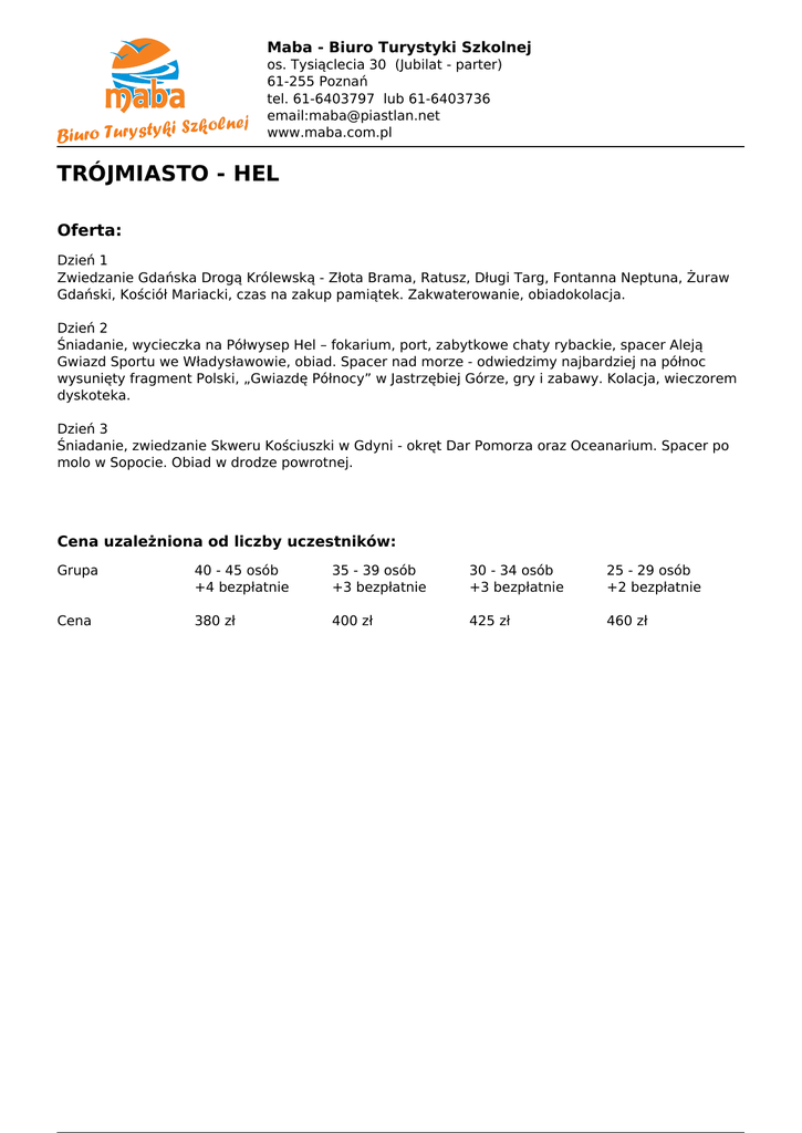 Maba - Biuro Turystyki Szkolnej os. Tysiąclecia 30 (Jubilat - parter) 61-255 Poznań tel. 61-6403797 lub 61-6403736 email:[email protected] www.maba.com.pl TRÓJMIASTO - HEL Oferta: Dzień 1 Zwiedzanie Gdańska Drogą Królewską - Złota Brama, Ratusz, Długi Targ, Fontanna Neptuna, Żuraw Gdański, Kościół Mariacki, czas na zakup pamiątek. Zakwaterowanie, obiadokolacja. Dzień 2 Śniadanie, wycieczka na Półwysep Hel – fokarium, port, zabytkowe chaty rybackie, spacer Aleją Gwiazd Sportu we Władysławowie, obiad. Spacer nad morze - odwiedzimy najbardziej na północ wysunięty fragment Polski, „Gwiazdę Północy” w Jastrzębiej Górze, gry i zabawy. Kolacja, wieczorem dyskoteka. Dzień 3 Śniadanie, zwiedzanie Skweru Kościuszki w Gdyni - okręt Dar Pomorza oraz Oceanarium. Spacer po molo w Sopocie. Obiad w drodze powrotnej. Cena uzależniona od liczby uczestników: Powered by TCPDF (www.tcpdf.org) Grupa 40 - 45 osób +4 bezpłatnie 35 - 39 osób +3 bezpłatnie 30 - 34 osób +3 bezpłatnie 25 - 29 osób +2 bezpłatnie Cena 380 zł 400 zł 425 zł 460 zł