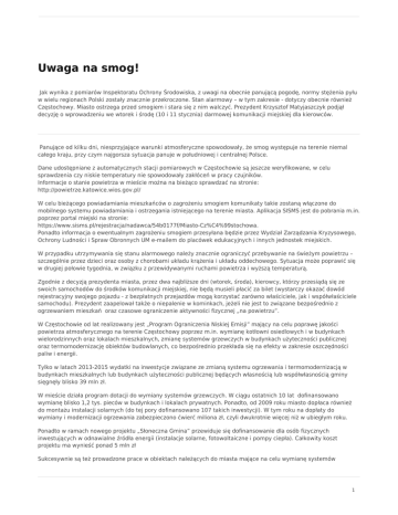 Uwaga na smog! Jak wynika z pomiarów Inspektoratu Ochrony Środowiska, z uwagi na obecnie panującą pogodę, normy stężenia pyłu w wielu regionach Polski zostały znacznie przekroczone. Stan alarmowy – w tym zakresie - dotyczy obecnie również Częstochowy. Miasto ostrzega przed smogiem i stara się z nim walczyć. Prezydent Krzysztof Matyjaszczyk podjął decyzję o wprowadzeniu we wtorek i środę (10 i 11 stycznia) darmowej komunikacji miejskiej dla kierowców. Panujące od kilku dni, niesprzyjające warunki atmosferyczne spowodowały, że smog występuje na terenie niemal całego kraju, przy czym najgorsza sytuacja panuje w południowej i centralnej Polsce. Dane udostępniane z automatycznych stacji pomiarowych w Częstochowie są jeszcze weryfikowane, w celu sprawdzenia czy niskie temperatury nie spowodowały zakłóceń w pracy czujników. Informacje o stanie powietrza w mieście można na bieżąco sprawdzać na stronie: http://powietrze.katowice.wios.gov.pl/ W celu bieżącego powiadamiania mieszkańców o zagrożeniu smogiem komunikaty takie zostaną włączone do mobilnego systemu powiadamiania i ostrzegania istniejącego na terenie miasta. Aplikacja SISMS jest do pobrania m.in. poprzez portal miejski na stronie: https://www.sisms.pl/rejestracja/nadawca/54b0177f/Miasto-Cz%C4%99stochowa. Ponadto informacja o ewentualnym zagrożeniu smogiem przesyłana będzie przez Wydział Zarządzania Kryzysowego, Ochrony Ludności i Spraw Obronnych UM e-mailem do placówek edukacyjnych i innych jednostek miejskich. W przypadku utrzymywania się stanu alarmowego należy znacznie ograniczyć przebywanie na świeżym powietrzu – szczególnie przez dzieci oraz osoby z chorobami układu krążenia i układu oddechowego. Sytuacja może poprawić się w drugiej połowie tygodnia, w związku z przewidywanymi ruchami powietrza i wyższą temperaturą. Zgodnie z decyzją prezydenta miasta, przez dwa najbliższe dni (wtorek, środa), kierowcy, którzy przesiądą się ze swoich samochodów do środków komunikacji miejskiej, nie będą musieli płacić za bilet (wystarczy okazać dowód rejestracyjny swojego pojazdu - z bezpłatnych przejazdów mogą korzystać zarówno właściciele, jak i współwłaściciele samochodu). Prezydent zaapelował także o niepalenie w kominkach, jeżeli nie jest to związane bezpośrednio z ogrzewaniem mieszkań oraz czasowe ograniczenie aktywności fizycznej „na powietrzu”. W Częstochowie od lat realizowany jest „Program Ograniczenia Niskiej Emisji” mający na celu poprawę jakości powietrza atmosferycznego na terenie Częstochowy poprzez m.in. wymianę kotłowni osiedlowych i w budynkach wielorodzinnych oraz lokalach mieszkalnych, zmianę systemów grzewczych w budynkach użyteczności publicznej oraz termomodernizację obiektów budowlanych, co bezpośrednio przekłada się na efekty w zakresie oszczędności paliw i energii. Tylko w latach 2013-2015 wydatki na inwestycje związane ze zmianą systemu ogrzewania i termomodernizacją w budynkach mieszkalnych lub budynkach użyteczności publicznej będących własnością lub współwłasnością gminy sięgnęły blisko 39 mln zł. W mieście działa program dotacji do wymiany systemów grzewczych. W ciągu ostatnich 10 lat dofinansowano wymianę blisko 1,2 tys. pieców w budynkach i lokalach prywatnych. Ponadto, od 2009 roku miasto dopłaca również do montażu instalacji solarnych (do tej pory dofinansowano 107 takich inwestycji). W tym roku na dopłaty do wymiany i modernizacji ogrzewania zabezpieczono ćwierć miliona zł, czyli dwukrotnie więcej niż w ubiegłym roku. Ponadto w ramach nowego projektu „Słoneczna Gmina” przewiduje się dofinansowanie dla osób fizycznych inwestujących w odnawialne źródła energii (instalacje solarne, fotowoltaiczne i pompy ciepła). Całkowity koszt projektu ma wynieść ponad 5 mln zł Sukcesywnie są też prowadzone prace w obiektach należących do miasta mające na celu wymianę systemów 1 grzewczych, termomodernizację czy instalacje solarne. Realizowany jest m.in. program termomodernizacji placówek oświatowych zaplanowany do końca 2018 r. Ograniczeniu zagrożenia smogiem służą m.in. także miejskie inwestycje w transport niskoemisyjny (10 nowych autobusów typu solaris w 2014 r., 40 hybryd gazowo-elektrycznych w 2015 r. , obecnie MPK oczekuje na dostawę 40 nowych autobusów spełniających najwyższe ekologiczne normy Euro 6), inwestycje drogowe mające na celu upłynnienie ruchu, inwestycje w modernizację oświetlenia ulicznego oraz inne inicjatywy i projekty służące poprawie efektywności energetycznej. 2