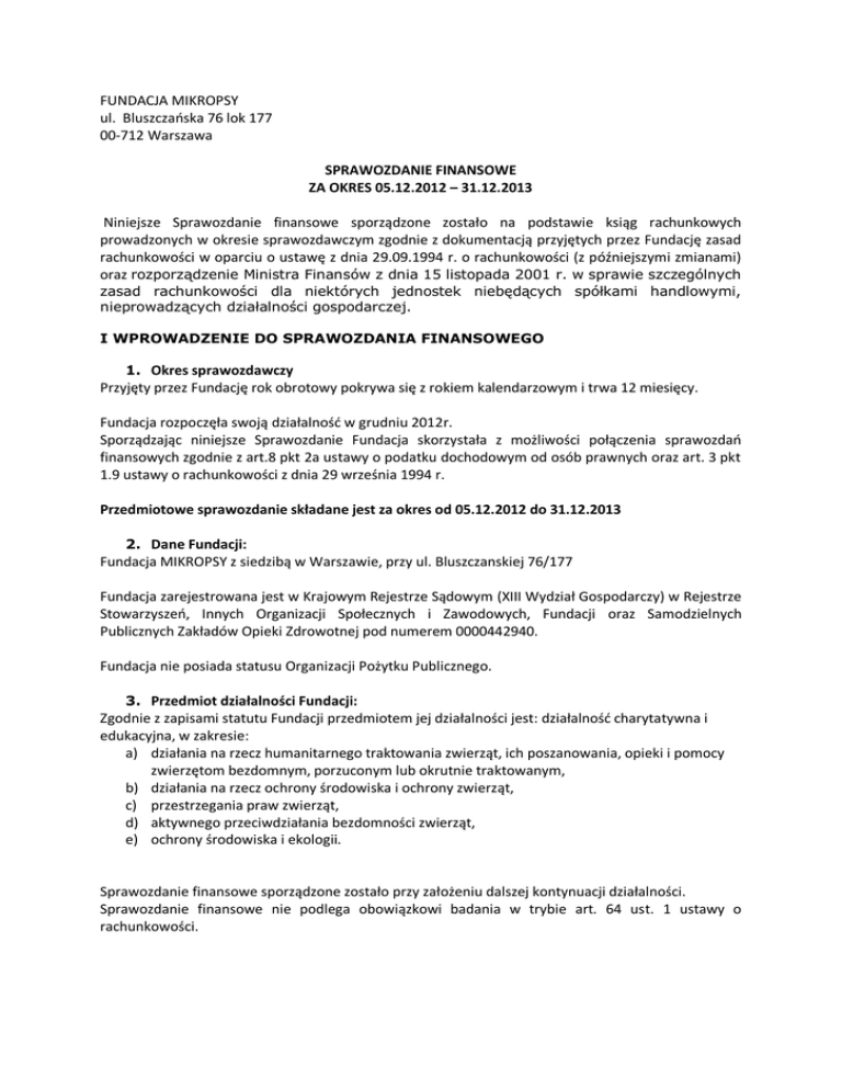 FUNDACJA MIKROPSY ul. Bluszczańska 76 lok 177 00-712 Warszawa SPRAWOZDANIE FINANSOWE ZA OKRES 05.12.2012 – 31.12.2013 Niniejsze Sprawozdanie finansowe sporządzone zostało na podstawie ksiąg rachunkowych prowadzonych w okresie sprawozdawczym zgodnie z dokumentacją przyjętych przez Fundację zasad rachunkowości w oparciu o ustawę z dnia 29.09.1994 r. o rachunkowości (z późniejszymi zmianami) oraz rozporządzenie Ministra Finansów z dnia 15 listopada 2001 r. w sprawie szczególnych zasad rachunkowości dla niektórych jednostek niebędących spółkami handlowymi, nieprowadzących działalności gospodarczej. I WPROWADZENIE DO SPRAWOZDANIA FINANSOWEGO 1. Okres sprawozdawczy Przyjęty przez Fundację rok obrotowy pokrywa się z rokiem kalendarzowym i trwa 12 miesięcy. Fundacja rozpoczęła swoją działalność w grudniu 2012r. Sporządzając niniejsze Sprawozdanie Fundacja skorzystała z możliwości połączenia sprawozdań finansowych zgodnie z art.8 pkt 2a ustawy o podatku dochodowym od osób prawnych oraz art. 3 pkt 1.9 ustawy o rachunkowości z dnia 29 września 1994 r. Przedmiotowe sprawozdanie składane jest za okres od 05.12.2012 do 31.12.2013 2. Dane Fundacji: Fundacja MIKROPSY z siedzibą w Warszawie, przy ul. Bluszczanskiej 76/177 Fundacja zarejestrowana jest w Krajowym Rejestrze Sądowym (XIII Wydział Gospodarczy) w Rejestrze Stowarzyszeń, Innych Organizacji Społecznych i Zawodowych, Fundacji oraz Samodzielnych Publicznych Zakładów Opieki Zdrowotnej pod numerem 0000442940. Fundacja nie posiada statusu Organizacji Pożytku Publicznego. 3. Przedmiot działalności Fundacji: Zgodnie z zapisami statutu Fundacji przedmiotem jej działalności jest: działalność charytatywna i edukacyjna, w zakresie: a) działania na rzecz humanitarnego traktowania zwierząt, ich poszanowania, opieki i pomocy zwierzętom bezdomnym, porzuconym lub okrutnie traktowanym, b) działania na rzecz ochrony środowiska i ochrony zwierząt, c) przestrzegania praw zwierząt, d) aktywnego przeciwdziałania bezdomności zwierząt, e) ochrony środowiska i ekologii. Sprawozdanie finansowe sporządzone zostało przy założeniu dalszej kontynuacji działalności. Sprawozdanie finansowe nie podlega obowiązkowi badania w trybie art. 64 ust. 1 ustawy o rachunkowości. II METODY WYCENY AKTYWÓW I PASYWÓW Aktywa i pasywa wycenia się nie rzadziej niż na dzień bilansowy w sposób następujący: 1) Środki trwałe oraz wartości niematerialne i prawne – według ceny nabycia lub kosztów wytworzenia lub wartości przeszacowanej (po aktualizacji wyceny środków trwałych), pomniejszonych o odpisy amortyzacyjne lub umorzeniowe, a także o odpisy z tytułu trwałej utraty wartości; 2) Zobowiązania – w kwocie wymagającej zapłaty, 3) Kapitały (fundusze własne) oraz pozostałe aktywa i pasywa w wartości nominalnej. W okresie objętym niniejszym sprawozdaniem Fundacja dokonała zakupu samochodu osobowego marki SKODA FABIA. Wartość początkowa wg ceny nabycia to 4.536,86 PLN. Amortyzacja dotyczy jedynie ww środka trwałego i wynosi 756,14 PLN III UZUPEŁNIAJĄCE DANE O A KTYWACH I PASYWACH AKTYWA 1) Należności krótkoterminowe 401,86 PLN 2) Środki pieniężne w kasie i na rachunkach bankowych 19.370,28 PLN PASYWA 1) Zobowiązania krótkoterminowe 5.702,12 PLN Na powyższe zobowiązania składają się zobowiązania wynikające z nieopłaconych faktur zakupowych, których termin płatności upłynął po 31 grudnia 2013r. oraz wobec osób współpracujących z Fundacją z tytułu zwrotu poniesionych w 2013 r. wydatków. IV STRUKTURA PRZYCHODÓW ZE WSKAZANIEM ICH ŹRÓDEŁ W okresie sprawozdawczym Fundacja pozyskiwała przychody w drodze darowizn od osób fizycznych i prawnych w tym na podstawie podpisanych umów z innymi organizacjami zajmującymi się ochroną zwierząt. 149 670,82 zł 119 585,66 zł PRZYCHODY STATUTOWE DAROWIZNY w tym: Darowizny od osób fizycznych w tym zbiórki publiczne (1796,93 zł) Darowizny od osób prawnych 111 517,66 zł 8 068,00 zł 30 085,16 zł UMOWY Z FUNDACJAMI w tym: Fundacja Azylu pod Psim Aniołem Kundel Bury Ocalmy od zapomnienia Sandomierskie Fundacja Azylu pod Psim Aniołem 12 050,41 zł 901,00 zł 1 718,00 zł 500,00 zł 14 915,75 zł V STRUKTURA KOSZTÓW 140 694,53 zł Koszty 119 300,46 zł KOSZTY STATUTOWE w tym: usługi weterynaryjne karma leki i artykuły weterynaryjne akcesoria środki czystościowe, higieniczne i pielęgnacyjne hotele dla zwierząt materiały budowlane pozostałe koszty KOSZTY ADMINISTRACYJNE 54 135,37 zł 21 994,01 zł 5 329,03 zł 6 125,67 zł 3 822,98 zł 11 631,45 zł 4 773,30 zł 11 488,65 zł 21 394,07 zł w tym: zużycie materiałów usługi obce: podatki i opłaty amortyzacja samochodu pozostałe koszty (prg.księgowy) 4 257,23 zł 14 954,49 zł 188,83 zł 756,14 zł 1 237,38 zł VI INFORMACJEUZUPEŁNIAJĄCE Przedmiotowy okres sprawozdawczy jest pierwszym w działalności Fundacji. W okresie tym Fundacja nie zatrudniała pracowników na umowę o pracę. Wszelkie działania oparte były o bezpłatną pracę osób związanych z Fundacją. W momencie zamknięcia roku obrotowego Fundacja posiada własny środek transportu umożliwiający szybką reakcję na pojawiające się wyzwania związane z ratowaniem zwierząt oraz sieć sprawdzonych i godnych zaufania tzw. „domów tymczasowych” zapewniających opiekę nad zwierzętami ratowanymi przez Fundację. Fundacja zakupiła również licencję na oprogramowanie księgowe – co powinno w przyszłości zaowocować obniżeniem kosztów administracyjnych. Warszawa, dnia 31 marca 2014 r. Zarząd: Magdalena Kordas Rozbicka ………………………………………………….. /Prezes/ Ewa Stępniak ………………………………………………………….. /Wiceprezes/