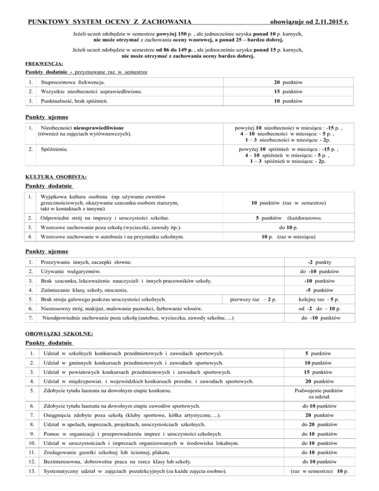 PUNKTOWY SYSTEM OCENY Z ZACHOWANIA obowiązuje od 2.11.2015 r. Jeżeli uczeń zdobędzie w semestrze powyżej 150 p. , ale jednocześnie uzyska ponad 10 p. karnych, nie może otrzymać z zachowania oceny wzorowej, a ponad 25 – bardzo dobrej. Jeżeli uczeń zdobędzie w semestrze od 86 do 149 p. , ale jednocześnie uzyska ponad 15 p. karnych, nie może otrzymać z zachowania oceny bardzo dobrej. FREKWENCJA: Punkty dodatnie - przyznawane raz w semestrze 1. Stuprocentowa frekwencja. 20 punktów 2. Wszystkie nieobecności usprawiedliwione. 15 punktów 3. Punktualność, brak spóźnień. 10 punktów Punkty ujemne 1. 2. Nieobecności nieusprawiedliwione (również na zajęciach wyrównawczych). powyżej 10 nieobecności w miesiącu : -15 p. , 4 – 10 nieobecności w miesiącu: - 5 p. , 1 – 3 nieobecności w miesiącu: - 2p. Spóźnienia. powyżej 10 spóźnień w miesiącu : -15 p. , 4 – 10 spóźnień w miesiącu: - 5 p. , 1 – 3 spóźnień w miesiącu: - 2p. KULTURA OSOBISTA: Punkty dodatnie 1. Wyjątkowa kultura osobista (np. używanie zwrotów grzecznościowych, okazywanie szacunku osobom starszym, takt w kontaktach z innymi) 10 punktów (raz w semestrze) 2. Odpowiedni strój na imprezy i uroczystości szkolne. 5 punktów (każdorazowo) 3. Wzorcowe zachowanie poza szkołą (wycieczki, zawody itp.). do 10 p. 4. Wzorcowe zachowanie w autobusie i na przystanku szkolnym. 10 p. (raz w miesiącu) Punkty ujemne 1. Przezywanie innych, zaczepki słowne. -2 punkty 2. Używanie wulgaryzmów. 3. Brak szacunku, lekceważenie nauczycieli i innych pracowników szkoły. -10 punktów 4. Zaśmiecanie klasy, szkoły, otoczenia. -5 punktów 5. Brak stroju galowego podczas uroczystości szkolnych. 6. Niestosowny strój, makijaż, malowanie paznokci, farbowanie włosów. 7. Nieodpowiednie zachowanie poza szkołą (autobus, wycieczka, zawody szkolne, ...) do -10 punktów pierwszy raz – 2 p. kolejny raz - 5 p. od -2 do – 10 p. do -10 punktów OBOWIĄZKI SZKOLNE: Punkty dodatnie 1. Udział w szkolnych konkursach przedmiotowych i zawodach sportowych. 5 punktów 2. Udział w gminnych konkursach przedmiotowych i zawodach sportowych. 10 punktów 3. Udział w powiatowych konkursach przedmiotowych i zawodach sportowych. 15 punktów 4. Udział w międzypowiat. i wojewódzkich konkursach przedm. i zawodach sportowych. 20 punktów 5. Zdobycie tytułu laureata na dowolnym etapie konkursu. 6. Zdobycie tytułu laureata na dowolnym etapie zawodów sportowych. 7. Osiągnięcia zdobyte poza szkołą (kluby sportowe, kółka artystyczne, ...). 8. Udział w apelach, imprezach, projektach, uroczystościach szkolnych. do 20 punktów 9. Pomoc w organizacji i przeprowadzeniu imprez i uroczystości szkolnych. do 10 punktów 10. Udział w uroczystościach i imprezach organizowanych w środowisku lokalnym. do 10 punktów 11. Zredagowanie gazetki szkolnej lub ściennej, plakatu. do 10 punktów 12. Bezinteresowna, dobrowolna praca na rzecz klasy lub szkoły. do 10 punktów 13. Systematyczny udział w zajęciach pozalekcyjnych (za każde zajęcia osobno). Podwojenie punktów za udział. do 10 punktów 20 punktów (raz w semestrze) 10 p. 14. Przeprowadzenie zajęć lekcyjnych lub ich części. 15. Przyniesienie do szkoły pomocy dydaktycznych. 16. Udział w zebraniach Szkolnego Samorządu Uczniowskiego. 17. Praca w Szkolnym Samorządzie Uczniowskim. 5 – 10 punktów 10 punktów (każdorazowo) 2 p. (raz w semestrze) do 30 p. 18. Reprezentowanie szkoły w Poczcie Sztandarowym. (każdorazowo) do 30 p. Punkty ujemne 1. Niewłaściwe zachowanie podczas lekcji (rozmowy na lekcjach, chodzenie po klasie, pisanie liścików do kolegów, żucie gumy, picie lub jedzenie bez pozwolenia, ...). -2 punkty 2. Opuszczenie sali lekcyjnej bez pozwolenia nauczyciela. 3. Używanie podczas lekcji telefonów komórkowych. 4. Filmowanie, nagrywanie, robienie zdjęć przy pomocy telefonów niezgodne z prawem i statutem szkoły. 5. Zakłócanie spokoju na korytarzu podczas lekcji, nieuzasadnione przebywanie poza salą lekcyjną lub w sali gimnastycznej podczas przerwy. 6. Niewypełnianie poleceń nauczycieli i innych pracowników szkoły. 7. Niewywiązanie się z dobrowolnie przyjętego na siebie zobowiązania. -2 punkty 8. Zaniedbywanie funkcji, zadań powierzonych w klasie. -2 punkty 9. Zaniedbywanie zadań powierzonych w szkole. -5 punktów -10 punktów od -2 do - 5 p. od - 10 do - 20 p. -5 punktów do -10 punktów PRZESTRZEGANIE NORM OBYCZAJOWYCH I MORALNYCH: Punkty dodatnie 1. Praca społeczna na rzecz innych w czasie wolnym od zajęć lekcyjnych. do 10 punktów 2. Opieka nad chorym kolegą lub zwierzętami szkolnymi. do 10 punktów 3. Pomoc koleżeńska (np. opieka nad słabszym, pomoc w nauce). do 10 punktów 4. Prawidłowe reagowanie na wszelkie przejawy agresji, przeciwstawianie się złu. do 10 punktów 5. Przyznanie się do winy i próby naprawienia wyrządzonej szkody. 5 punktów Punkty ujemne 1. Bieganie po korytarzu. do -5 punktów 2. Opuszczanie terenu szkoły podczas przerw. do -10 punktów 3. Brak szacunku dla cudzej własności (rzucanie tornistrem, chowanie kurtek, zabieranie piórników itp.) do -10 punktów 4. Świadome niszczenie cudzej własności – wandalizm. - 30 punktów 5. Przyniesienie do szkoły niebezpiecznych przedmiotów. -10 punktów 6. Agresywne zachowanie (np. udział w bójce, pobicie kogoś, popychanie, kopanie) do -30 punktów 7. Psychiczne znęcanie się nad kimś (wyszydzanie, zastraszanie, zniesławienie). do -30 punktów 8. Podżeganie starszych do „wymierzenia sprawiedliwości”. -30 punktów 9. Palenie papierosów, picie alkoholu. -30 punktów 10. Bójki ze skutkiem okaleczenia. -50 punktów 11. Wymuszanie pieniędzy i innych przedmiotów. -50 punktów 12. Kradzież przedmiotów. -50 punktów 13. Odpisywanie zadania domowego z zeszytu lub ćwiczeń kolegi. - 10 punktów 14. Plagiat (np. przepisywanie cudzych prac z Internetu). - 30 punktów 15. Fałszerstwo (np. sfałszowanie podpisu rodziców). -50 punk