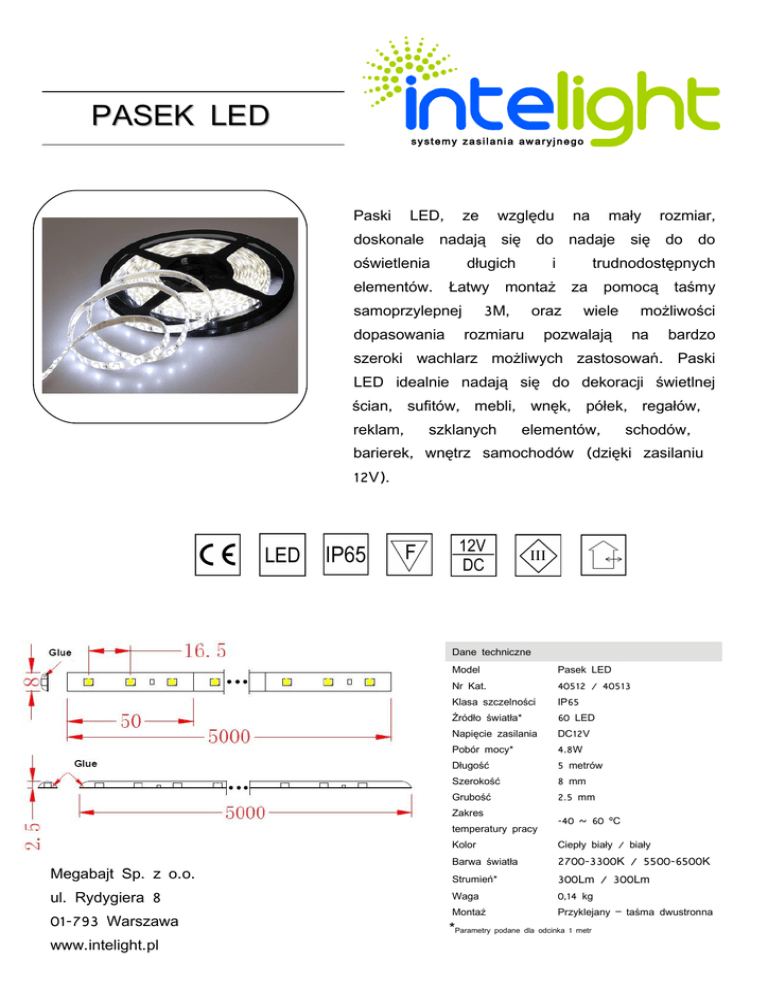 PASEK LED systemy zasilania awaryjnego Paski LED, ze względu na mały rozmiar, doskonale nadają się do nadaje się do do oświetlenia elementów. długich Łatwy trudnodostępnych montaż 3M, samoprzylepnej dopasowania i za oraz rozmiaru pomocą wiele taśmy możliwości pozwalają na bardzo szeroki wachlarz możliwych zastosowań. Paski LED idealnie nadają się do dekoracji świetlnej ścian, sufitów, mebli, wnęk, półek, regałów, reklam, szklanych elementów, schodów, barierek, wnętrz samochodów (dzięki zasilaniu 12V). Dane techniczne Model Pasek LED Nr Kat. 40512 / 40513 Klasa szczelności IP65 Źródło światła* 60 LED Napięcie zasilania DC12V Pobór mocy* 4.8W Długość 5 metrów Szerokość 8 mm Grubość Zakres temperatury pracy Megabajt Sp. z o.o. ul. Rydygiera 8 01-793 Warszawa www.intelight.pl 2.5 mm -40 ~ 60 ºC Kolor Ciepły biały / biały Barwa światła 2700-3300K / 5500-6500K Strumień* 300Lm / 300Lm Waga 0,14 kg Montaż Przyklejany – taśma dwustronna *Parametry podane dla odcinka 1 metr