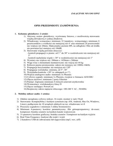 ZAŁĄCZNIK NR 8 DO SIWZ OPIS PRZEDMIOTU ZAMÓWIENIA 1. Kolumny głośnikowe- 2 sztuki: 1) Aktywny zestaw głośnikowy, wyrównany liniowo, z możliwością sterowania wiązką dźwiękową w jednej obudowie. 2) Wbudowany wzmacniacz minimum 32 kanałowy, wzmacniający minimum 8 przetworników o wielkości nie mniejszej niż 4’ oraz minimum 24 przetworniki nie większe niż 20mm. Maksymalny poziom SPL na odległości 30m od źródła nie powinien być mniejszy niż 106dB. 3) Sterowanie wiązką powinno dotyczyć: - kontroli propagacji w pionie: od 5 ° do 30° w rozdzielczości nie mniejszej niż 5° - kontroli nachylenia wiązki ± 30° w rozdzielczości nie mniejszej niż 1° 4) Wymiary nie większe niż: 200mm x 1450mm x 260mm 5) Waga wraz z elementami montażowymi: nie więcej niż 44 kg 6) Robocze pasmo przenoszenia: zakres nie mniejszy niż 100Hz-16kHz 7) Propagacja horyzontalna: nie mniejsza niż 120° 8) Propagacja wertykalna: zmienna, od 5°- 30° 9) Wertykalna kontrola: ±30° (w odstępach co 1°) 10) Wejścia analogowe audio: minimum 3x Phoenix 11) Cyfrowe sygnały: minimum 1x Phoenix, (wejście w formacie AES/EBU 12) Złącza sieciowe: minimum 2 porty Ethernet 13) Pamięć: Zapisanie minimum 4 różnych ustawień użytkownika 14) Wzmacniacz: wielokanałowy klasy D 15) Złącze zasilające: PowerCon 16) Bezpieczny zakres napięcia roboczego: 100-240 V AC , 50/60Hz 2. Mobilny mikser audio- 1 sztuka: 1) Zdalnie zarządzany cyfrowy mikser, 16-wejść, montaż w rack 19cali 2) Sterowanie: Kompatybilny z każdym systemem (np. iOS, Android, Mac Os, Windows, Linux), podłączenie do 10 urządzeń zdalnych na raz, wbudowane wi-fi 3) Procesory sygnałowe i minimum 3 efekty brzmieniowe 4) Minimum 4-pasmowy korektor parametryczny; filtr górnoprzepustowy; de-esser; kompresor; bramka szumów na każdym kanale wejściowym 5) 31-pasmowy korektor graficzny; bramka szumów i kompresor na każdym wyjściu 6) Real Time Frequency Analyser dla wejść i wyjść 7) 2-kanałowe USB do odtwarzania lub nagrywania (mp3, wav, aiff) 3. Kolumna głośnikowa niskotonowa- 1 sztuka: 1) Pasmo przenoszenia nie węższe niż: 32 Hz – 120 Hz 2) Przesunięcie fazowe nie większe niż: 40 stopni w paśmie nie węższym niż 50 Hz – 105 Hz 3) Jeden przetwornik niskotonowy o średnicy minimum 18 cali, zbudowany w oparciu o układ dwucewkowy 4) Gniazdo wejściowe oparte na 3-pinowym złączu XLR 5) Impedancja wejścia audio: 10 kOhm pomiędzy pinem 2 i 3 6) Współczynnik tłumienia sygnału współbieżnego CMRR nie większy niż 80 dB 7) Wzmacniacz dwukanałowy, pracujący w klasie D, z chłodzeniem konwekcyjnym (pasywnym) 8) Obudowa wykonana ze sklejki, prasowanej pod wysokim ciśnieniem, pokrytej odpornym na porysowania lakierem strukturalnym, w kolorze białym 9) Głośnik chroniony maskownicą metalową w kolorze czarnym, pokrytą od wewnętrznej strony specjalistyczną pianką bierną akustycznie 10) Wymiary nie większe niż: 700 mm szer. X 630 mm wys. X 645 mm głęb. 11) Waga nie większa niż: 62 kg 4. System dousznych monitorów bezprzewodowych- 4 kpl: Profesjonalny system dousznych monitorów bezprzewodowych oparty na transmisji radiowej oferujący szeroki zestaw profesjonalnych funkcji. System oferujący najwyższej jakości przekaz dźwięku dzięki zastosowaniu kompandera o zmiennym stopniu kompresji. Możliwość pracy do 20 kanałów jednocześnie w jednym paśmie systemu pozwalająca na efektywne wykorzystanie dostępnego spektrum radiowego. Inteligentny system akumulatorów Li-Ion gwarantujący długi czas pracy na jednym ładowaniu i precyzyjny pomiar tego czasu. Zestaw składający się z nadajnika, odbiornika przypinanego i słuchawek dousznych (4 komplety). Minimalne parametry techniczne: Nadajnik bezprzewodowego systemu odsłuchowego 4 x szt. Nazwa/parametr Wymagane parametry Zakres częstotliwości pracy UHF 470 – 694 MHz w wybranych pasmach o szerokości do 40MHz Typ modulacji radiowej FM stereo Pasmo przenoszenia dźwięku toru radiowego nadajnika, Minimum 35Hz-15kHz Stosunek sygnał/szum Minimum 90dB (A-ważone) Kompander O zmiennym stopniu kompresji Moc promieniowana w.cz. Przełączana 10mW, 50mW i 100mW Liczba równocześnie pracujących nadajników w pojedynczym paśmie pracy zestawu ≥20 Liczba przełączanych częstotliwości nośnych w paśmie pracy zestawu ≥1400 Zasięg pracy nadajnika Minimum 85 m w optymalnych warunkach Złącza wejściowe XLR/Jack x2 (stereo) Wyłącznik nośnej RF Tak, ze wskaźnikiem LED Wyjście słuchawkowe 3,5mm Jack Tak, z regulacją wzmocnienia Wyświetlacz LCD podświetlany Tak, Matrycowy Mierniki sygnału wejściowego niezależnie dla kanału L i R Tak, 8 segmentowe LED Synchronizacja z odbiornikiem w podczerwieni Tak Obudowa metalowa Tak, o wysokości 1U do systemu Rack 19” z akcesoriami do zabudowy pojedynczej i podwójnej Odbiornik bezprzewodowego systemu odsłuchowego 4 x szt. Nazwa/parametr Wymagane parametry Zakres częstotliwości pracy UHF 470 – 694 MHz w wybranych pasmach o szerokości do 40MHz Typ modulacji radiowej FM stereo Pasmo przenoszenia dźwięku Minimum 35Hz-15kHz Stosunek sygnał/szum Minimum 90dB (A-ważone) Wyjście słuchawkowe 3,5mm jack regulowane Tak Kompander O zmiennym stopniu kompresji Skaner wolnych częstotliwości radiowych Tak Liczba przełączanych częstotliwości nośnych w paśmie pracy zestawu ≥1400 Wyświetlacz LCD, podświetlany Tak, matrycowy Programowanie zdefiniowanego przez użytkownika zestawu częstotliwości przełączanych przyciskiem Tak, umożliwiający selektywny odbiór z 20 nadajników Wbudowany limiter z wielostopniową regulacją ograniczenia poziomu wyjściowego Tak, 7 stopniowy Korektor wysokich częstotliwości Tak, dwustopniowy Tryb pracy stereo i mix mono z dwóch kanałów Tak, regulowany płynnie Wskaźniki stanu baterii i sygnału RF na wielokolorowych lampkach LED Tak Zasilanie/typ akumulatora Dedykowany akumulator, wymienny, w technologii Litowej (bez efektu pamięcioweg