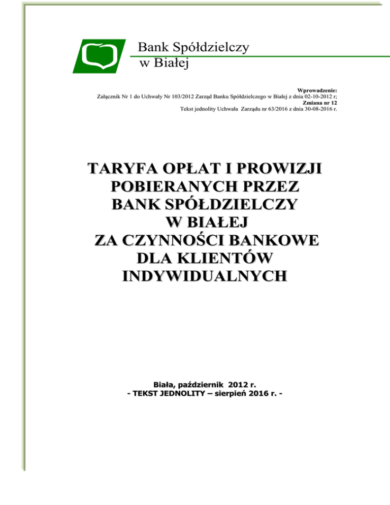 Bank Spółdzielczy w Białej Wprowadzenie: Załącznik Nr 1 do Uchwały Nr 103/2012 Zarząd Banku Spółdzielczego w Białej z dnia 02-10-2012 r; Zmiana nr 12 Tekst jednolity Uchwała Zarządu nr 63/2016 z dnia 30-08-2016 r. TARYFA OPŁAT I PROWIZJI POBIERANYCH PRZEZ BANK SPÓŁDZIELCZY W BIAŁEJ ZA CZYNNOŚCI BANKOWE DLA KLIENTÓW INDYWIDUALNYCH Biała, październik 2012 r. - TEKST JEDNOLITY – sierpień 2016 r. - Spis treści: KONTA OSOBISTE ...................................................................................................................................4 TAB. 1 Rachunek oszczędnościowo – rozliczeniowy ...............................................................................4 OSZCZĘDNOŚCI .......................................................................................................................................7 TAB. 2 Pozostałe oszczędnościowe rachunki bankowe ...........................................................................7 TAB. 3 Rachunki terminowych lokat oszczędnościowych w złotych i walutach wymienialnych ........7 TAB. 1. Kredyty, weksle i gwarancje bankowe ......................................................................................8 INNE USŁUGI ............................................................................................................................................9 TAB. 1. Usługi różne ...................................................................................................................................9 Tab.2. Czynności kasowe w złotych ........................................................................................................10 2 Zakres operacji i usług bankowych przedstawionych w „Taryfie opłat i prowizji pobieranych przez Bank Spółdzielczy w Białej za czynności bankowe dla Klientów Indywidualnych” zwanej dalej Taryfą dotyczy osób fizycznych nieprowadzących działalności gospodarczej – rezydentów i nierezydentów. Zasady pobierania opłat i prowizji za czynności bankowe dla Klientów Indywidualnych 1. „Taryfa opłat i prowizji pobieranych przez Bank Spółdzielczy w Białej za czynności bankowe dla Klientów Indywidualnych” zwana dalej Taryfą ma zastosowanie do usług bankowych świadczonych w placówkach Banku Spółdzielczego w Białej, zwanego dalej Bankiem. 2. W przypadku braku odmiennych zapisów umownych opłaty i prowizje pobierane są: 1) po wykonaniu usługi lub na koniec dnia, w którym Klient złożył dyspozycję wykonania usługi; 2) miesięcznie lub w innych okresach rozliczeniowych; 3) zbiorczo - za wykonane usługi w trakcie okresu rozliczeniowego. 3. Nie pobiera się prowizji i opłat od: 1) wpłat na cele społeczno - użyteczne na rzecz organizacji i fundacji, oraz których wniesienie upoważnia ofiarodawcę na mocy przepisów szczególnych do uzyskania ulgi w podatku dochodowym, 2) wpłat z tytułu spłaty odsetek, kredytów oraz innych zobowiązań zaciągniętych w Banku Spółdzielczym w Białej; 3) wpłat na rachunki bankowe w przypadku, gdy z umowy zawartej z posiadaczem rachunku wynika, że opłatę uiszcza odbiorca należności. 4. W przypadku, gdy Taryfa określa wysokość prowizji i opłat w granicach „od”, „do” oraz „od…do…” wysokość pobieranych opłat i prowizji ustalana jest indywidualnie w podanych granicach. 5. Wszelkie opłaty i prowizje bankowe pokrywa zleceniodawca transakcji chyba, że zawarte umowy stanowią inaczej. 6. Kwoty pobieranych prowizji i opłat podlegają zaokrągleniu do jednego grosza na zasadach ogólnych. Dotyczy to również kwot prowizji i opłat pobieranych w złotych od operacji dokonywanych w obrocie dewizowym. 7. Za operacje dewizowe zlecone przez rezydentów i nierezydentów pobiera się dodatkowo opłaty i prowizje lub koszty podane przez banki pośredniczące i inne podmioty finansowe przy wykonaniu zlecenia oraz poniesione przez Bank koszty kurierskie i telekomunikacyjne. 8. W przypadku transakcji realizowanych w walucie obcej, lub gdy podstawę naliczania prowizji stanowi kwota w walucie obcej, opłata/prowizja w złotych jest ustalana według kursu średniego NBP obowiązującego w dniu pobrania należności. 9. Klient decyduje o rodzaju systemu rozliczeniowego, którym realizuje przelew. 10. Za usługi nietypowe i nieprzewidziane w Taryfie Bank może ustalić opłatę wg rzeczywistych kosztów lub według umowy z Klientem, bądź wyrazić zgodę na odstąpienie od jej pobrania. 11. Okresowe opłaty z tytułu świadczenia usług płatniczych Bank pobierana jedynie za okres obowiązywania umowy ramowej. Opłaty uiszczone z góry podlegają proporcjonalnemu zwrotowi. 12. Nie pobiera się opłat okresowych, o których mowa w ust 11 w miesiącu, w którym rachunek został otwarty. 13. Określone w niniejszej Taryfie prowizje i opłaty dotyczące kredytów, dotyczą kredytów i pożyczek udzielonych ze środków Banku Spółdzielczego w Białej. W przypadku kredytów i pożyczek udzielanych ze środków lub na podstawie umów zawartych przez Bank Spółdzielczy w Białej z innymi bankami i instytucjami (np.: Bank Gospodarstwa Krajowego, Agencja Restrukturyzacji i Modernizacji Rolnictwa, Państwowy Fundusz Rehabilitacji Osób Niepełnosprawnych) obowiązują postanowienia tych umów, a w przypadku ich braku należy stosować prowizje i opłaty określone w Taryfie. 14. Taryfa nie jest równoznaczna z ofertą Banku. Istnienie określonej pozycji w Taryfie nie zobowiązuje Banku do sprzedaży produktu/usługi, której dotyczy. 15. Powyższa regulacja ma charakter ogólny obowiązujący wszystkich Klientów. Odmienne postanowienia mogą wynikać z umów zawieranych z Bankiem. 16. Na indywidualny wniosek Klienta oraz w sytuacjach uzasadnionych Zarząd może ustalić opłaty inne niż przewidziane w Taryfie, a także odstąpić od pobierania opłat. 3 KONTA OSOBISTE TAB. 1 Rachunek oszczędnościowo – rozliczeniowy Lp. Tryb pobierania Rodzaj usług (czynnośc